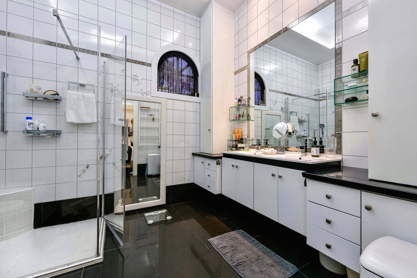 This spectacular residence welcomes you through the arch front doors, entering the stylish open concept space with specially designed light-box ceilings. Lots of bright natural light encompass the dining and elegant living room giving a spacious feel to both areas. The fully equipped kitchen features branded stainless-steel appliances, natural stone countertops, built-in microwave, double wine fridge, 7-burner stove, hood range as well as a kitchen island with extra storage. Across from the kitchen, you will find the casual tv room and home office. Grand stone beams separate the living room from the casual seating area near the glass sliding doors which lead out to the covered patio overlooking the pool. Each guest bedroom has its own private modern en-suite bathroom and built-in closet. The large master bedroom includes a spacious walk-in closet and en-suite bathroom with double sinks, a bath, waterfall shower head and built-in vanity with plenty storage space.