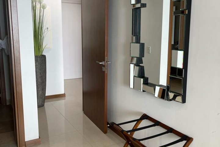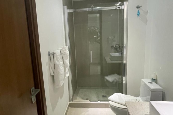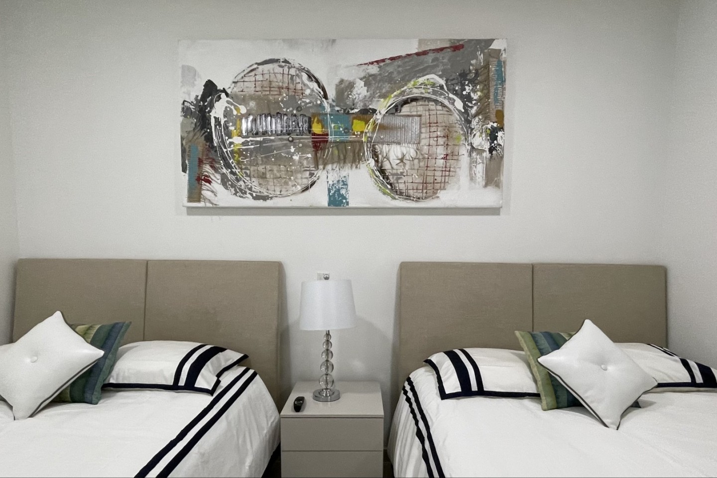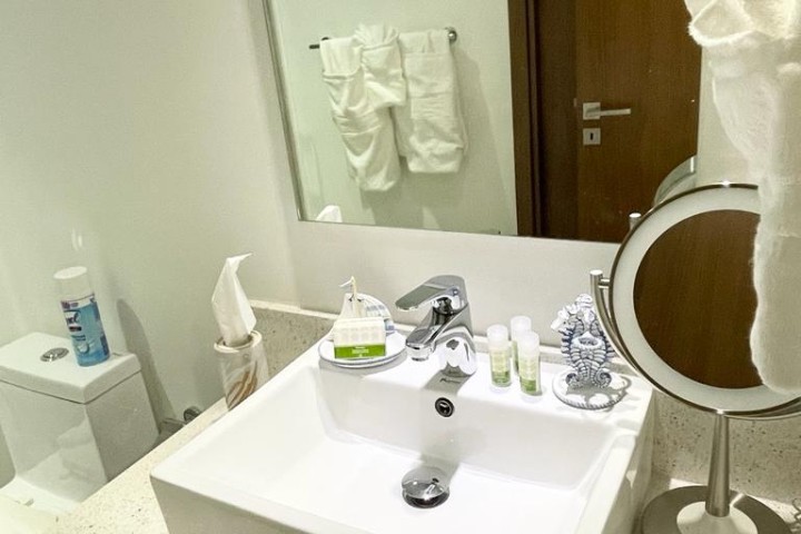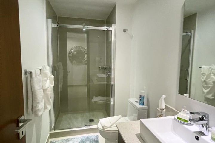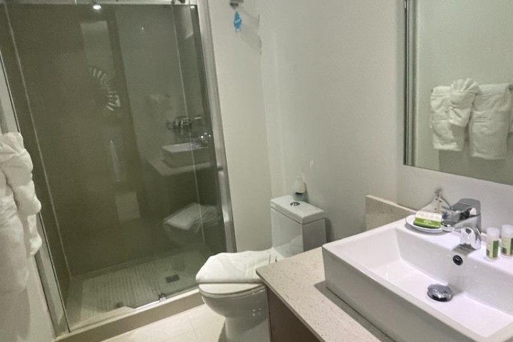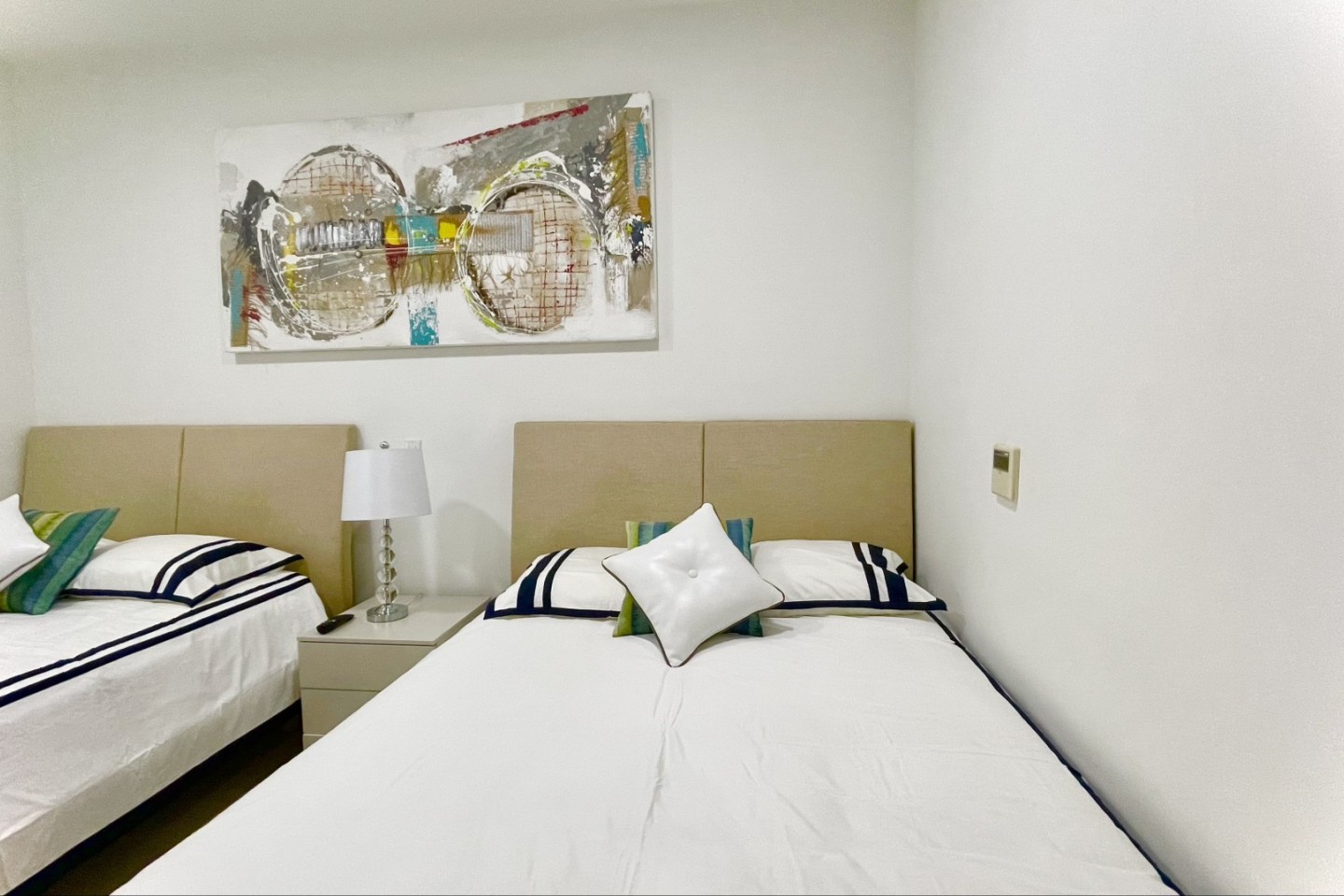 One of the two bedrooms is a master bedroom with an innovative ensuite bathroom, while the second bedroom has two twin beds and they share the 2nd bathroom.