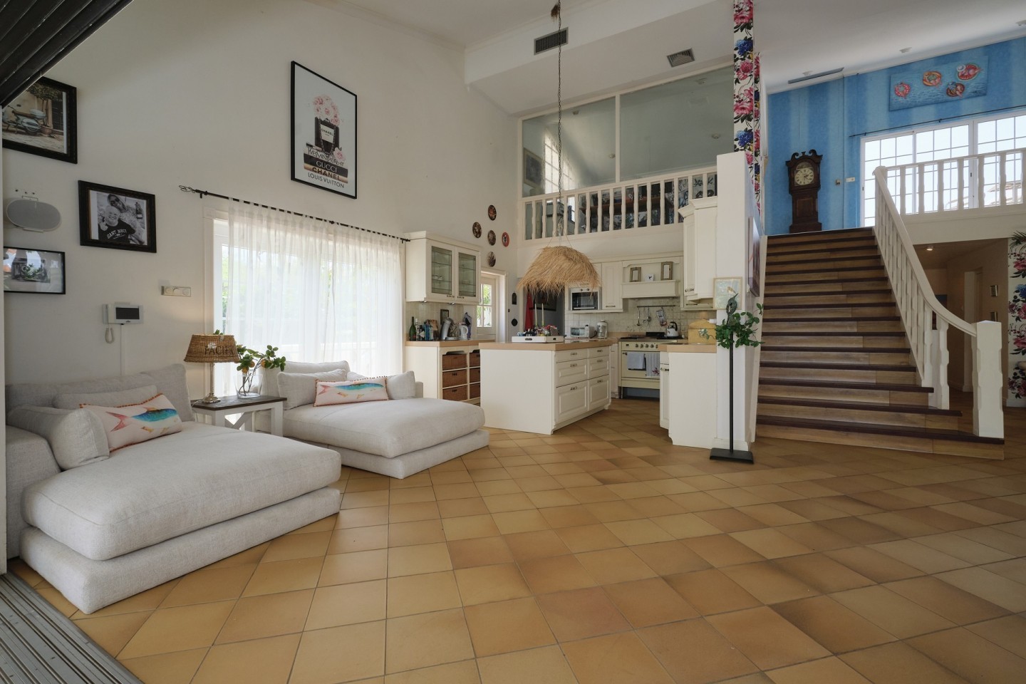 Below the mezzanine, the layout flows with effortless charm. Bedrooms, each with private bathrooms, are nestled near a country-style kitchen that invites slow mornings and long family meals.