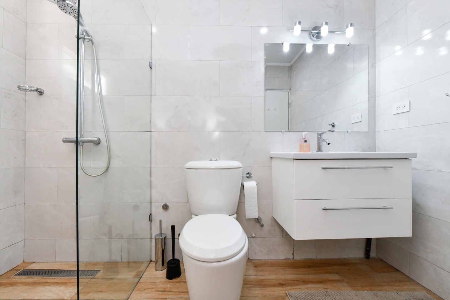 The outdoor area is just as inviting, featuring a pergola that offers a shaded space for relaxation. Under the pergola, there’s a dedicated BBQ area, perfect for outdoor dining and entertaining. The backyard also includes a rectangular fiberglass swimming pool and an outdoor shower with natural stone tile accents. Additionally, a pool pump house and storage area provide storage solutions for pool equipment and other necessities.