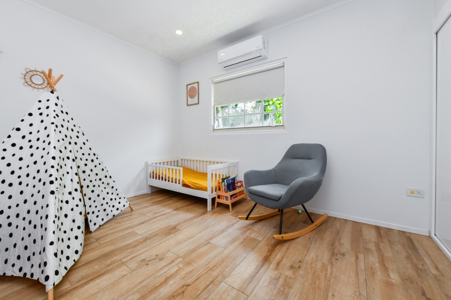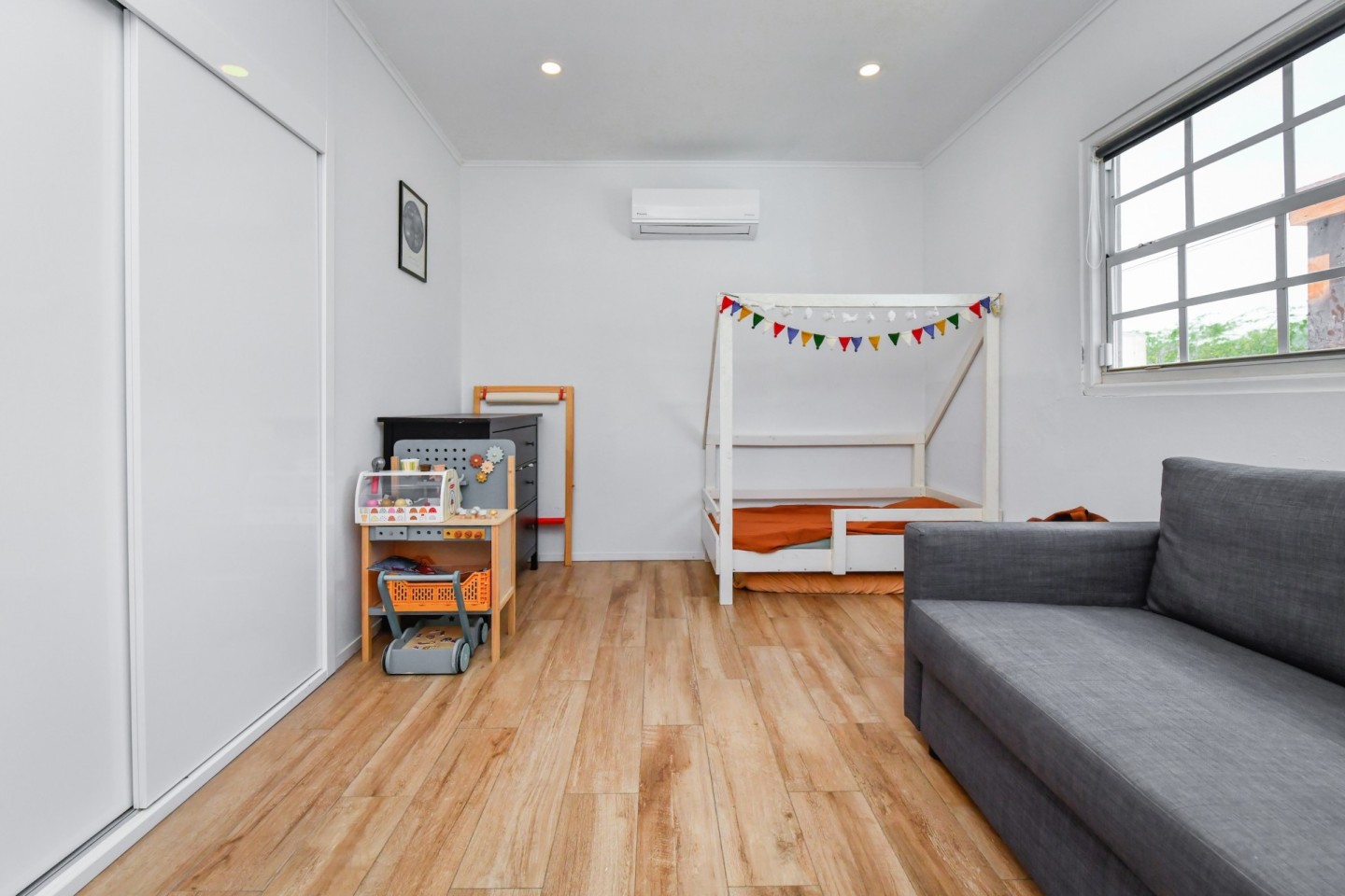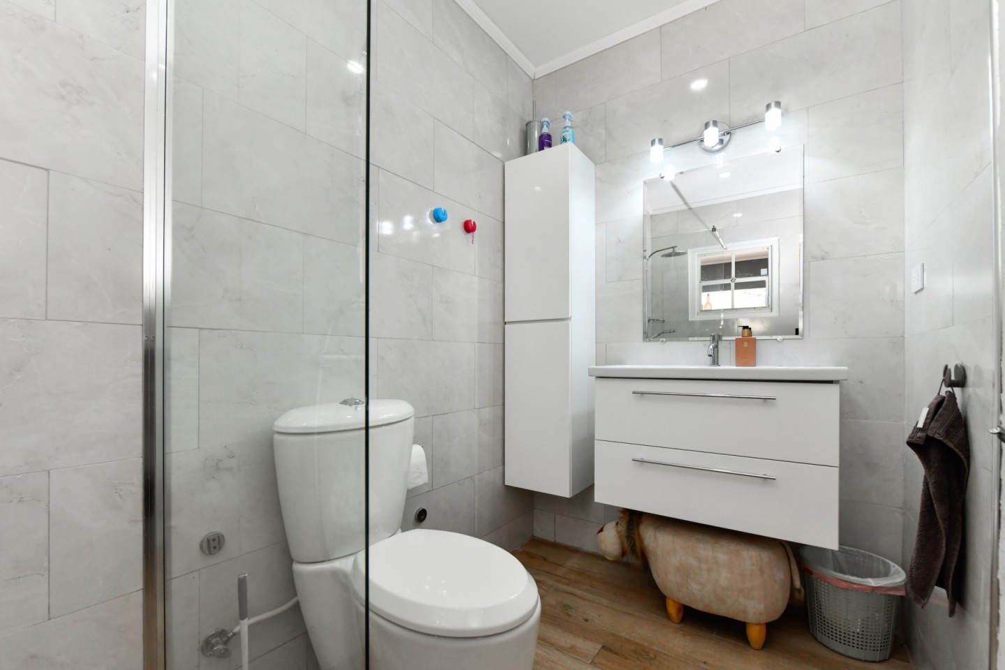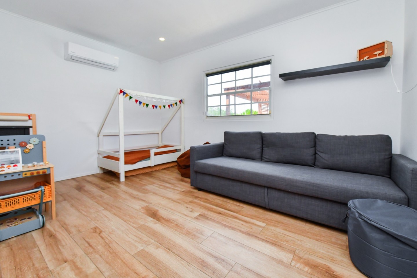 Inside, the home features three well-proportioned bedrooms and two bathrooms. The open-plan living, dining, and kitchen areas create a bright, connected environment, ideal for family living and entertaining. The fully equipped kitchen includes a storage and laundry room adjacent to it, adding convenience and practicality. The primary bedroom includes an ensuite bathroom for added privacy, and all three bedrooms are equipped with built-in closets, providing ample storage space.