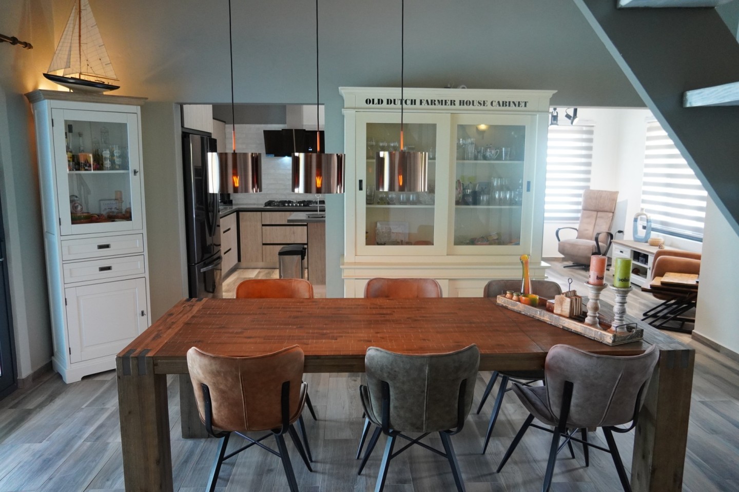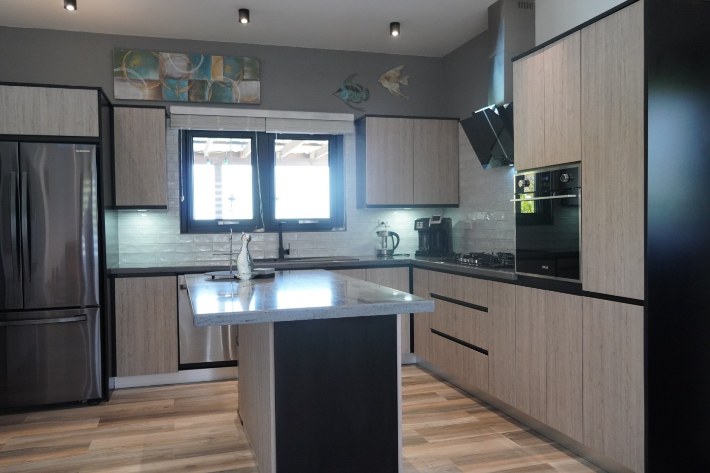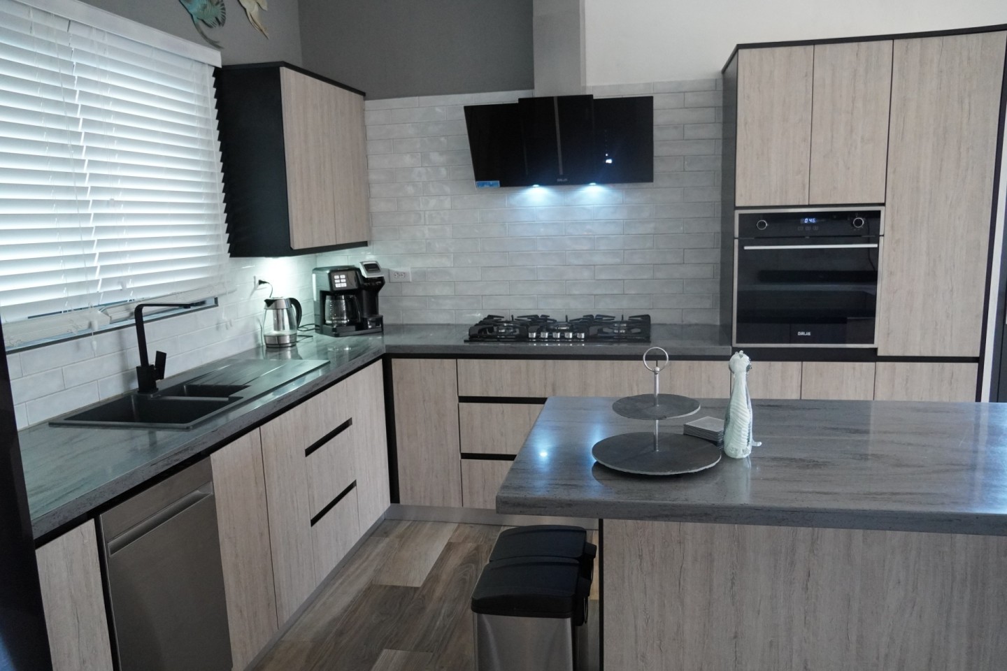 Open-concept kitchen with island, double stainless-steel sink, dishwasher, and 220V outlets for European appliances