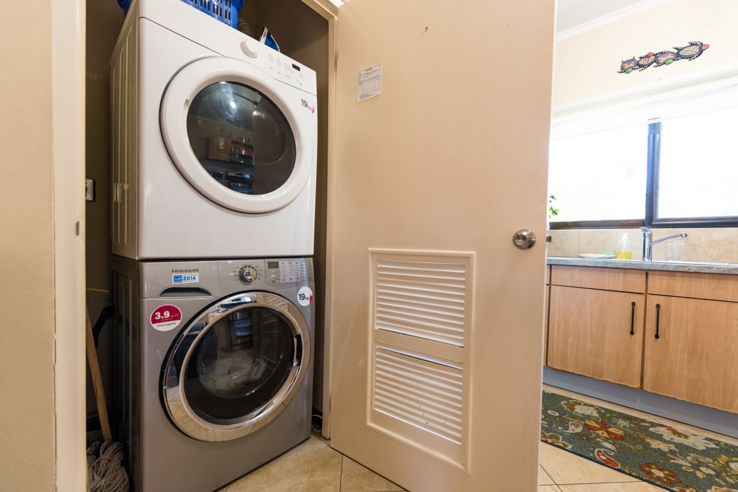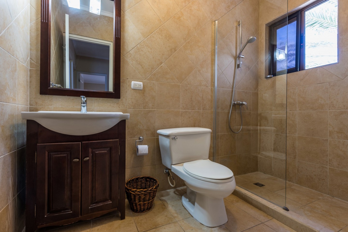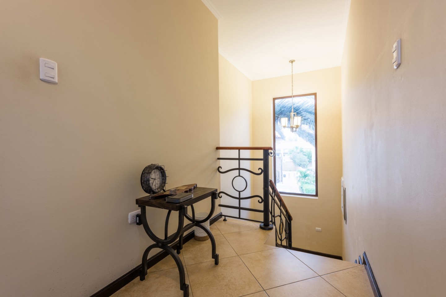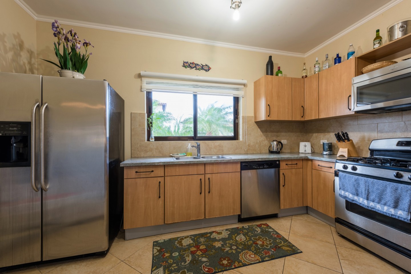 Step right through the porch into the entryway. On the first floor you will find an open living and dining room along with a full bathroom including a shower. Perfect for guests. The kitchen is equipped with double built-in stainless sinks, a stove, dishwasher, refrigerator and a breakfast bar. There is a small room right by the kitchen with a stacked washer and dryer set. On the second floor you have the Master Bedroom with its en-suite bathroom and a balcony overlooking the patio. You will also find 2 other bedrooms that share a full bathroom. One of the rooms has a balcony with a front view. All 3 bedrooms have a built-in-closet with mirror sliding doors, ceiling fans and split unit air-conditioning. The bathrooms with ceramic wall tiles include a shower with glass shower panel and 1 ceramic sink integrated into a wooden cabinet.