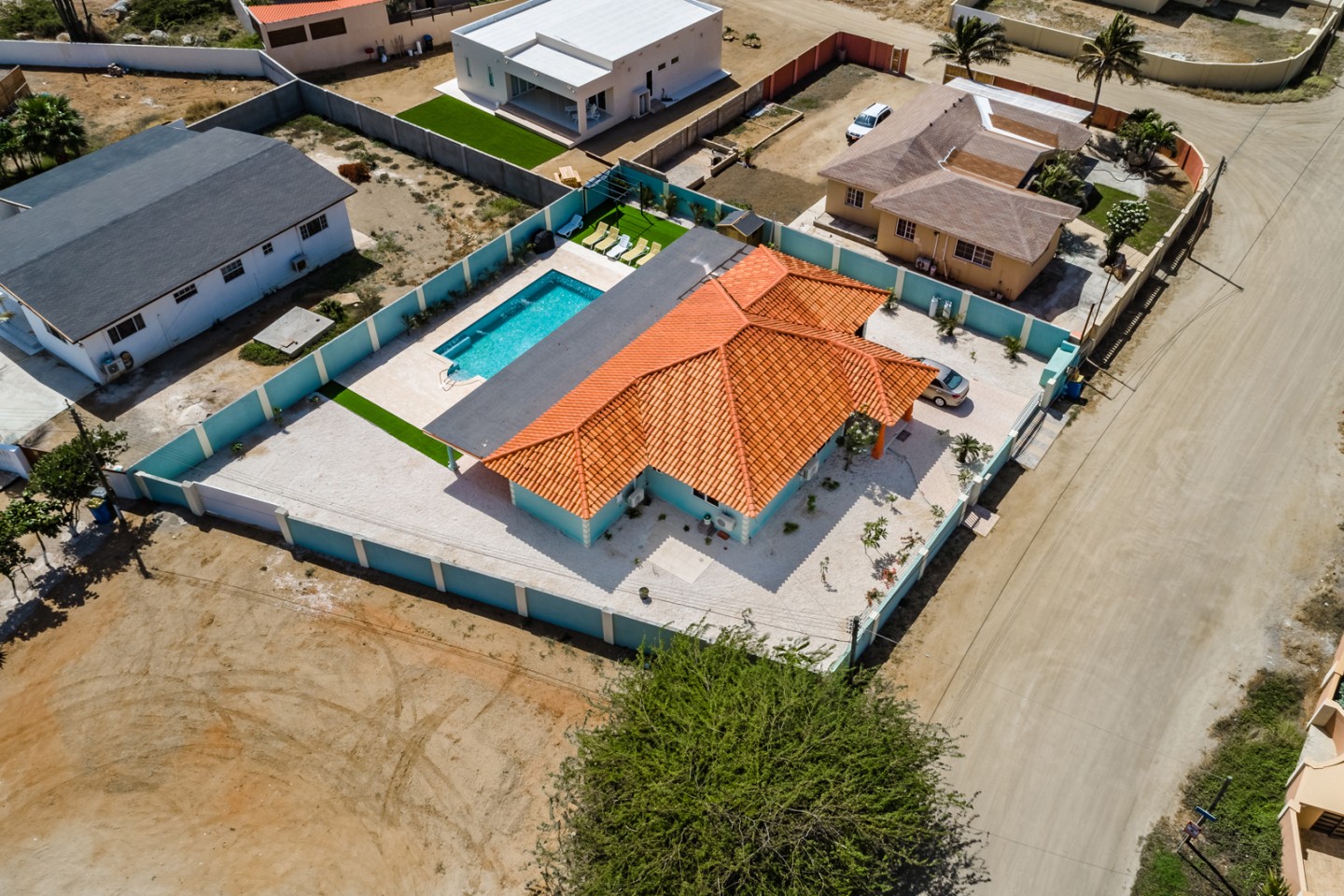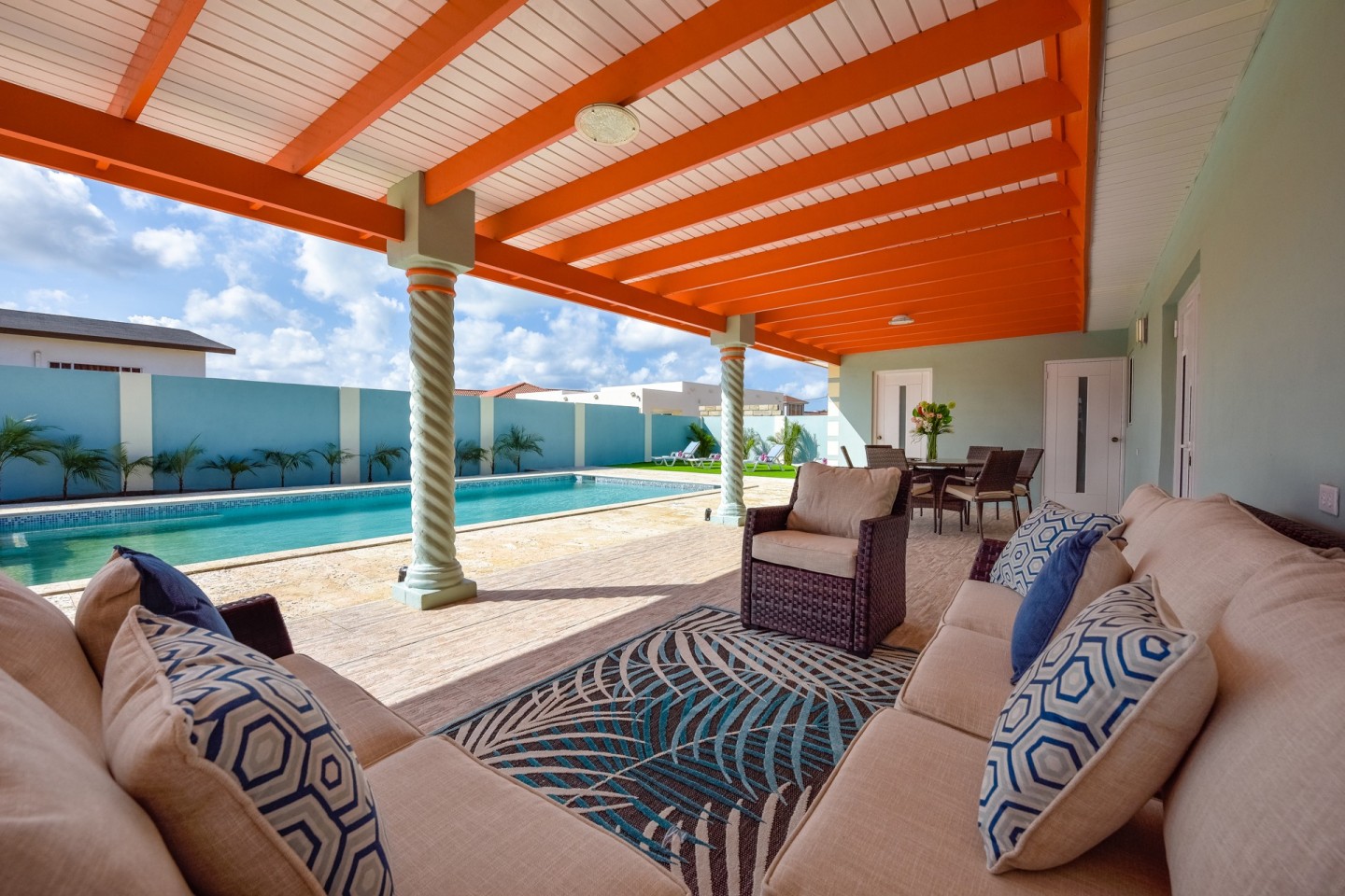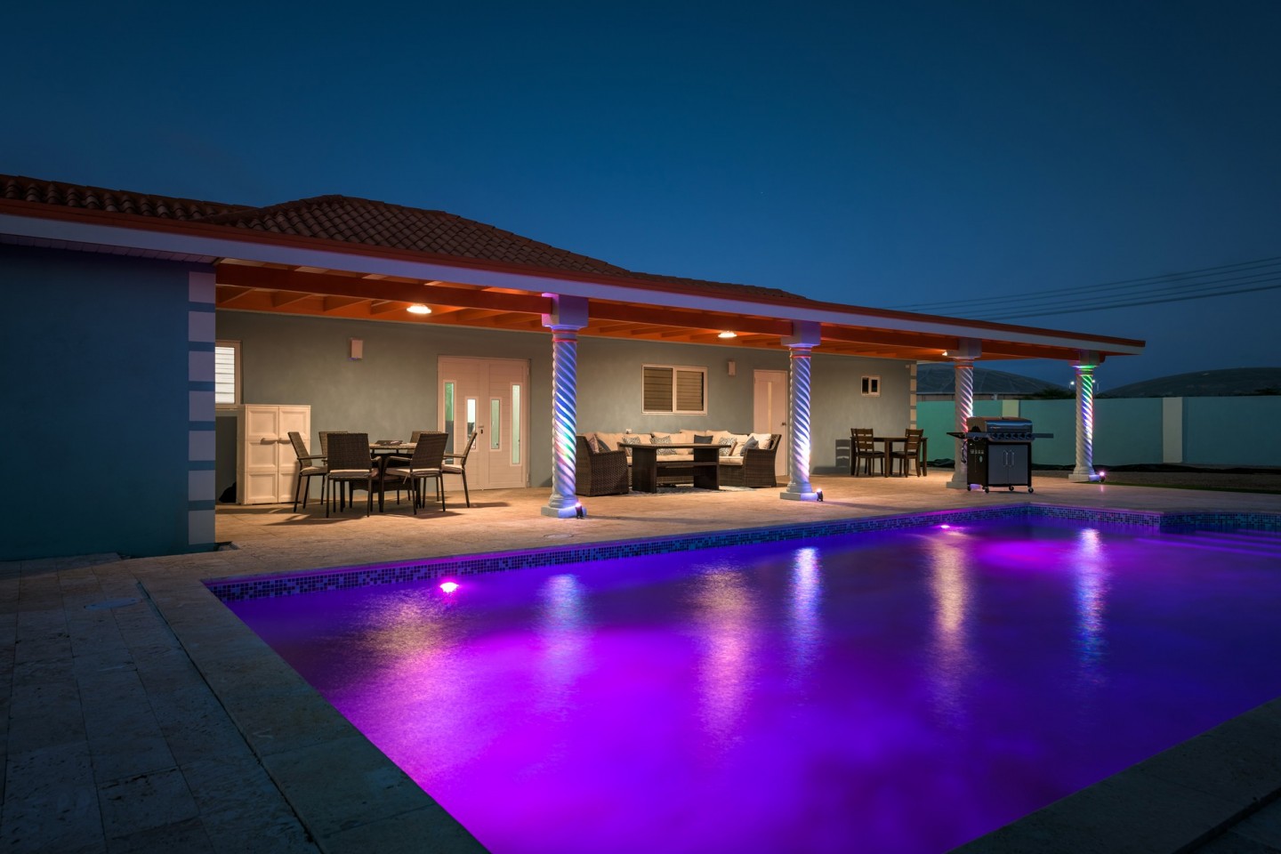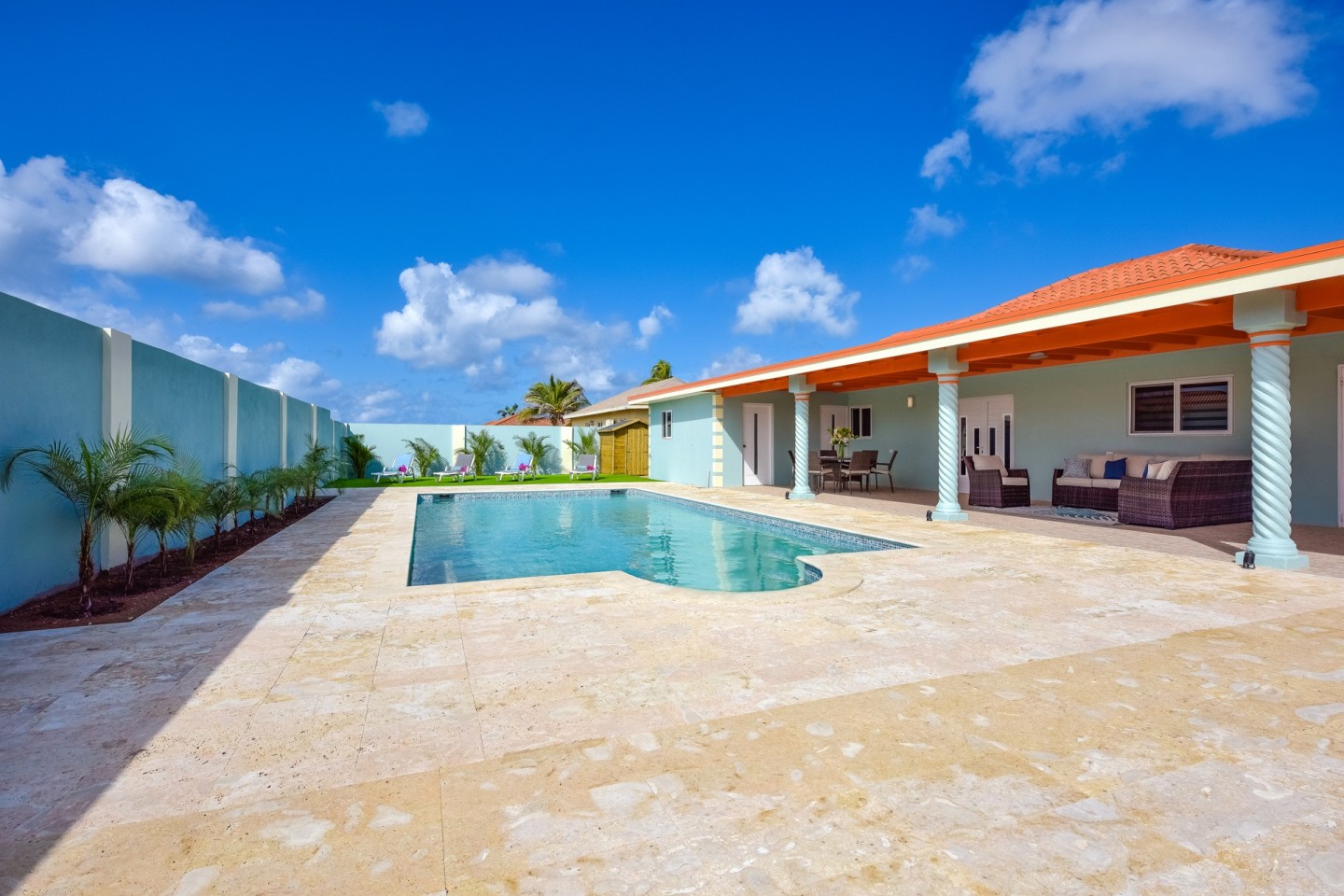 This brand new listed villa is located in the prestigious neighborhood of Esmeralda, just minutes away from Aruba's most beautiful beaches in Malmok. It's only 65 feet from the Gold Coast, and one block away from Golf Course. The fully furnished villa has five bedrooms, three bathrooms a spacious open concept living and dining room which opens up to the kitchen. Upon entering the home you will be greeted by a beautifully furnished living area featuring modern design in mellow colors which brings you a warm feeling the second you enter the space. The kitchen comes fully equipped with stainless steel appliances and beautiful countertops. On the left side of the home you will find the master bedroom with an ensuite that has a jacuzzi a double sink and a huge shower as well. Next to the master bedroom, you have a second bedroom that also has lovely mellow colors and a queen sized bed and a built in closet. There are two more bedrooms on the right wing of the villa, one of which has a separate opening to the backyard, and the other one to the front of the house. The one connected to the backyard can also be rented separately long term or as a short term rental because it has its own fully equipped kitchen and laundry room. Walking out of the villa you have these beautiful modern doors that lead to the fully furnished patio which has its own dining area and lounge chairs where you look out on beautiful large pool, that has built in spotlights that change colors at night.