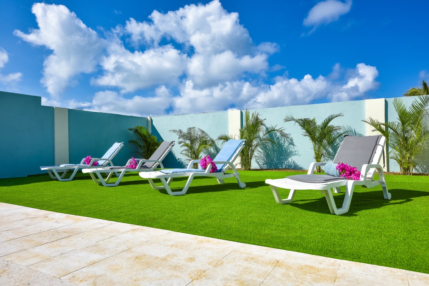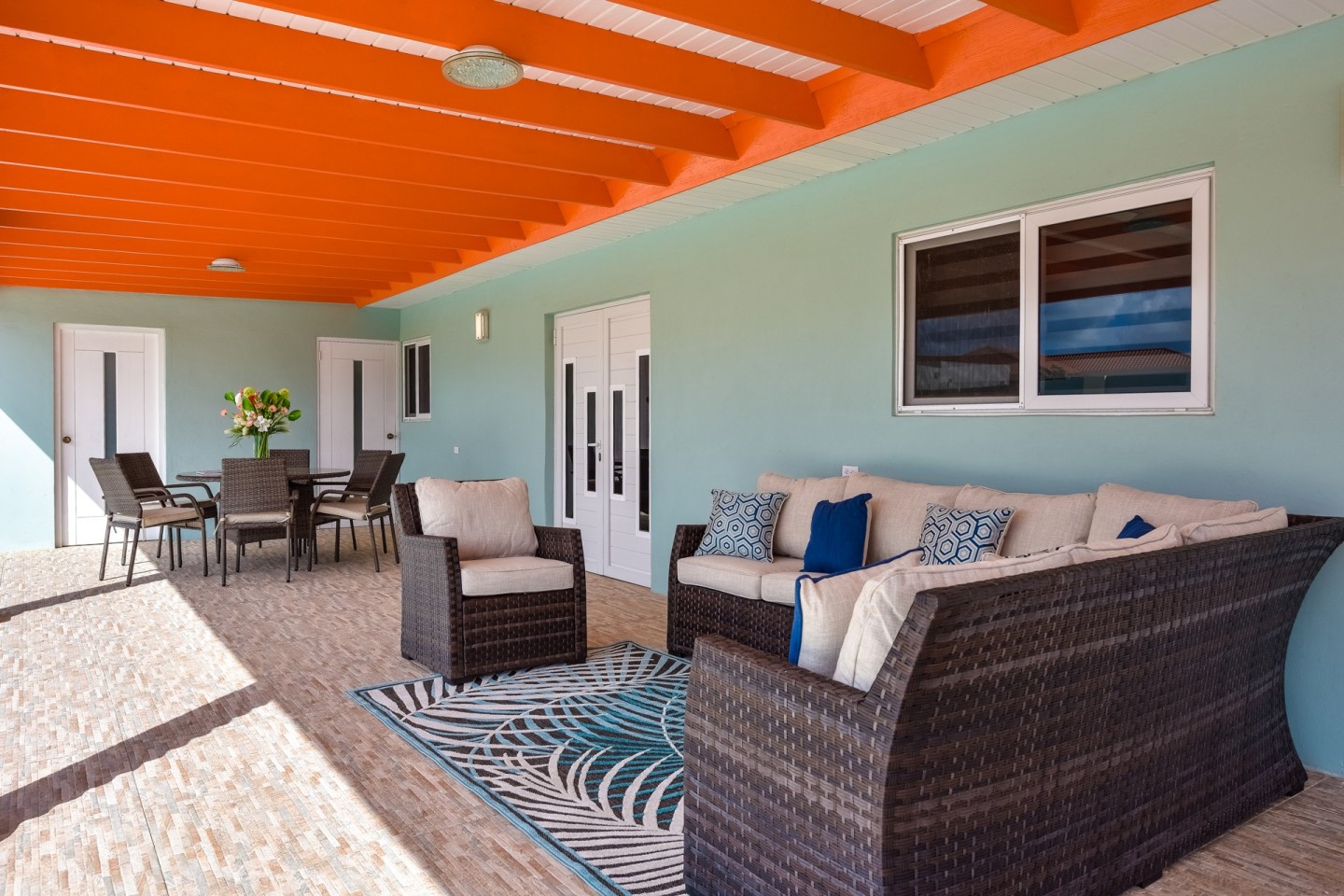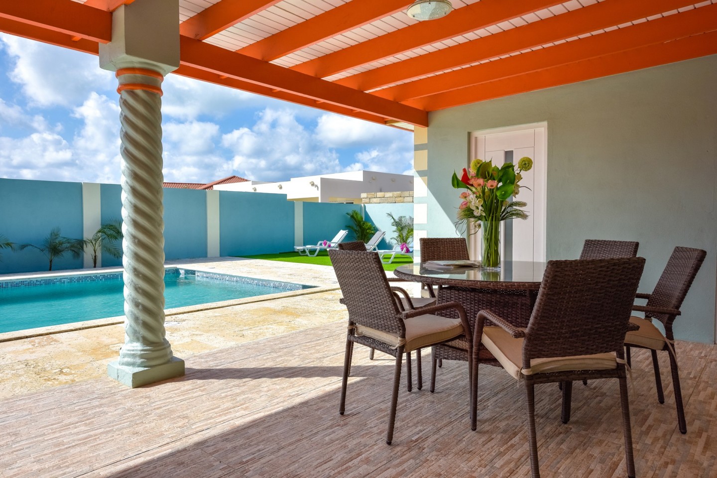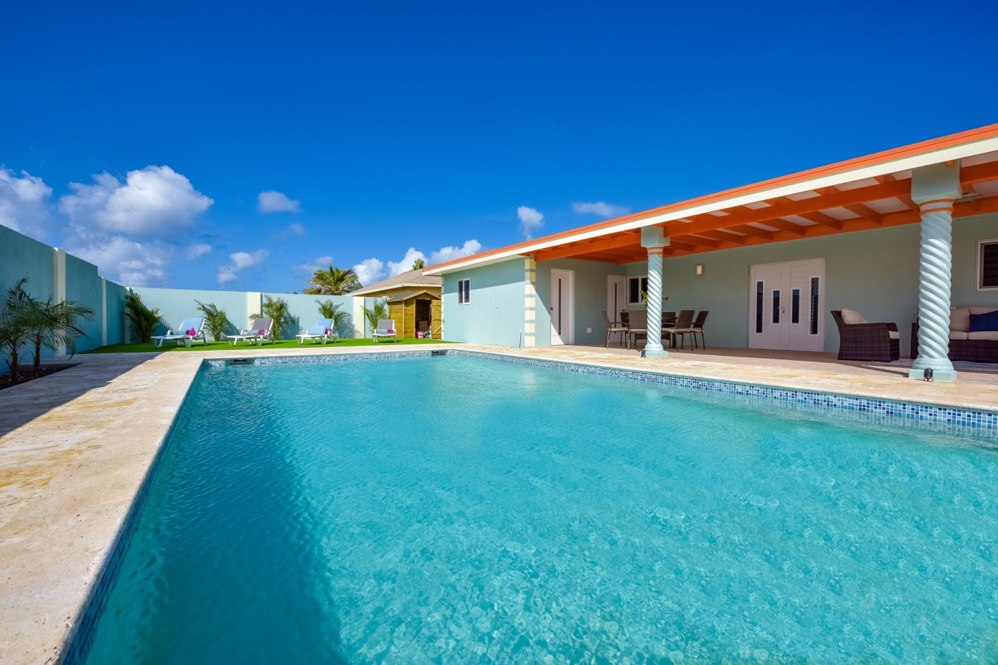 This brand new listed villa is located in the prestigious neighborhood of Esmeralda, just minutes away from Aruba's most beautiful beaches in Malmok. It's only 65 feet from the Gold Coast, and one block away from Golf Course. The fully furnished villa has five bedrooms, three bathrooms a spacious open concept living and dining room which opens up to the kitchen. Upon entering the home you will be greeted by a beautifully furnished living area featuring modern design in mellow colors which brings you a warm feeling the second you enter the space. The kitchen comes fully equipped with stainless steel appliances and beautiful countertops. On the left side of the home you will find the master bedroom with an ensuite that has a jacuzzi a double sink and a huge shower as well. Next to the master bedroom, you have a second bedroom that also has lovely mellow colors and a queen sized bed and a built in closet. There are two more bedrooms on the right wing of the villa, one of which has a separate opening to the backyard, and the other one to the front of the house. The one connected to the backyard can also be rented separately long term or as a short term rental because it has its own fully equipped kitchen and laundry room. Walking out of the villa you have these beautiful modern doors that lead to the fully furnished patio which has its own dining area and lounge chairs where you look out on beautiful large pool, that has built in spotlights that change colors at night.