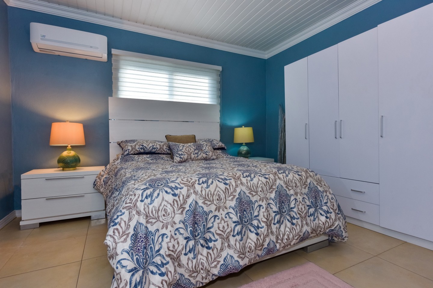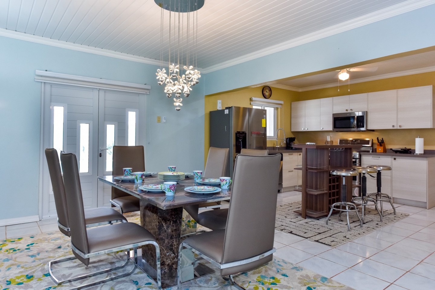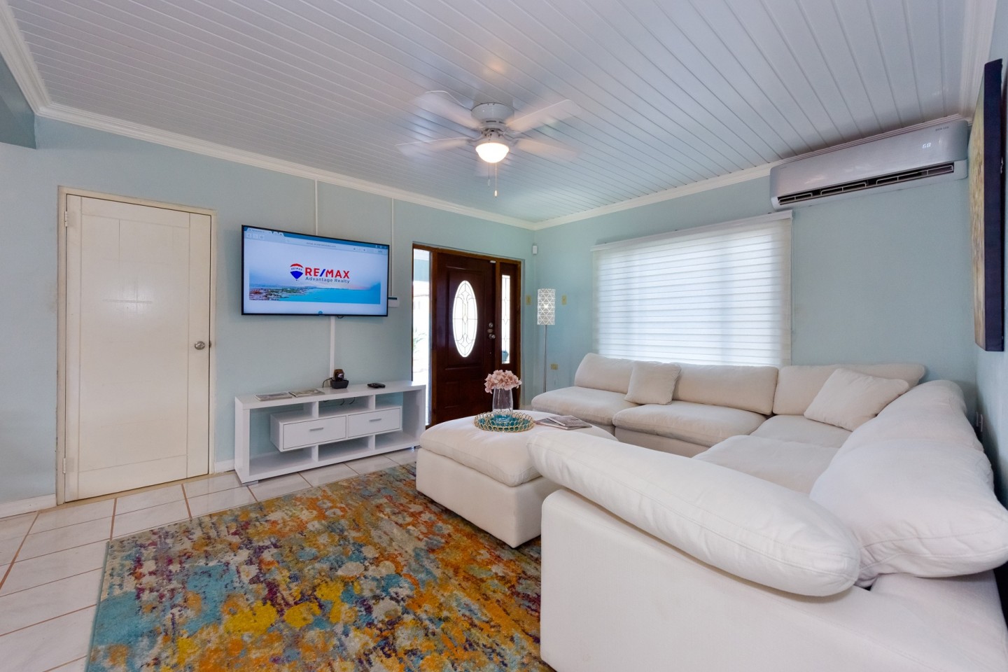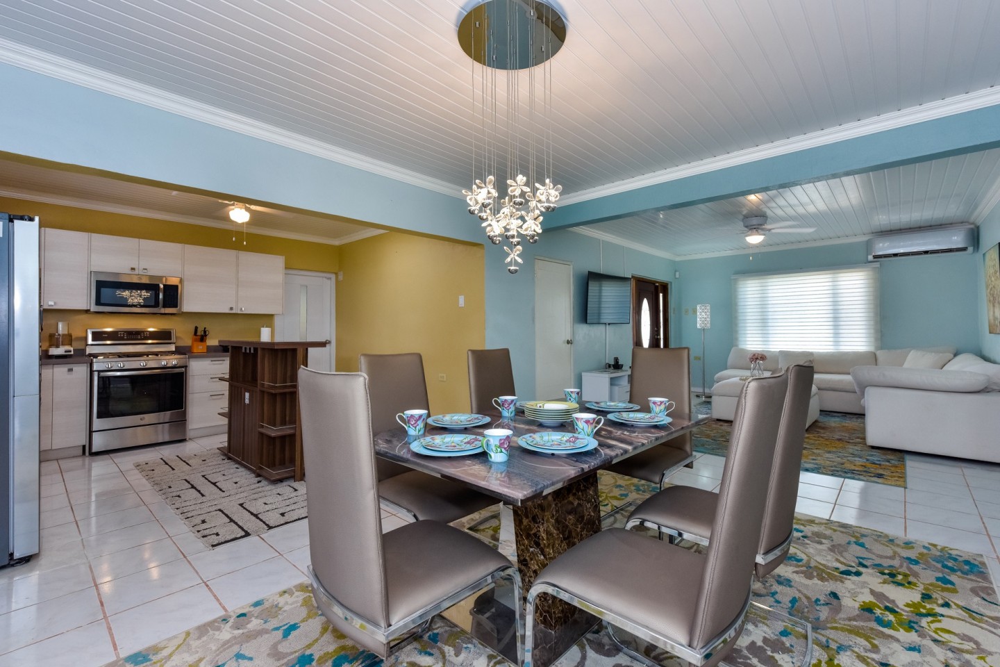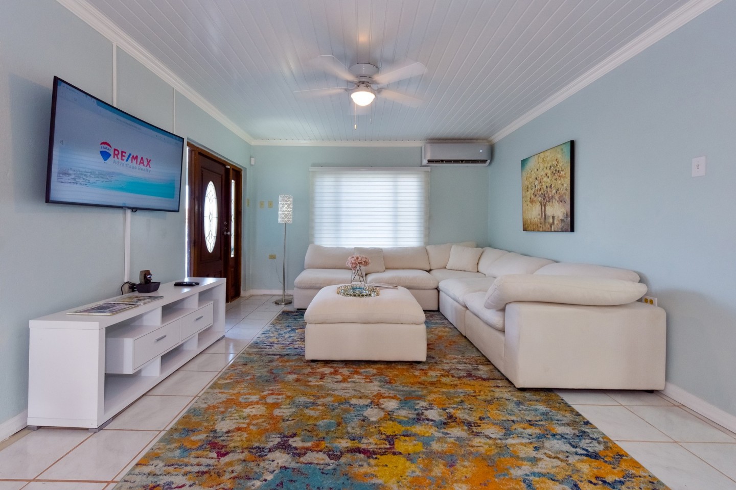 This brand new listed villa is located in the prestigious neighborhood of Esmeralda, just minutes away from Aruba's most beautiful beaches in Malmok. It's only 65 feet from the Gold Coast, and one block away from Golf Course. The fully furnished villa has five bedrooms, three bathrooms a spacious open concept living and dining room which opens up to the kitchen. Upon entering the home you will be greeted by a beautifully furnished living area featuring modern design in mellow colors which brings you a warm feeling the second you enter the space. The kitchen comes fully equipped with stainless steel appliances and beautiful countertops. On the left side of the home you will find the master bedroom with an ensuite that has a jacuzzi a double sink and a huge shower as well. Next to the master bedroom, you have a second bedroom that also has lovely mellow colors and a queen sized bed and a built in closet. There are two more bedrooms on the right wing of the villa, one of which has a separate opening to the backyard, and the other one to the front of the house. The one connected to the backyard can also be rented separately long term or as a short term rental because it has its own fully equipped kitchen and laundry room. Walking out of the villa you have these beautiful modern doors that lead to the fully furnished patio which has its own dining area and lounge chairs where you look out on beautiful large pool, that has built in spotlights that change colors at night.