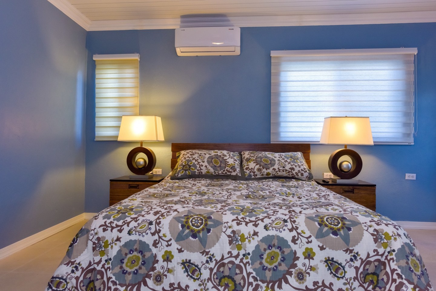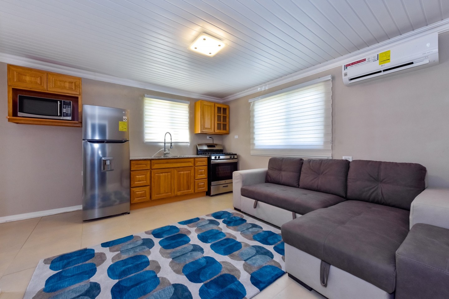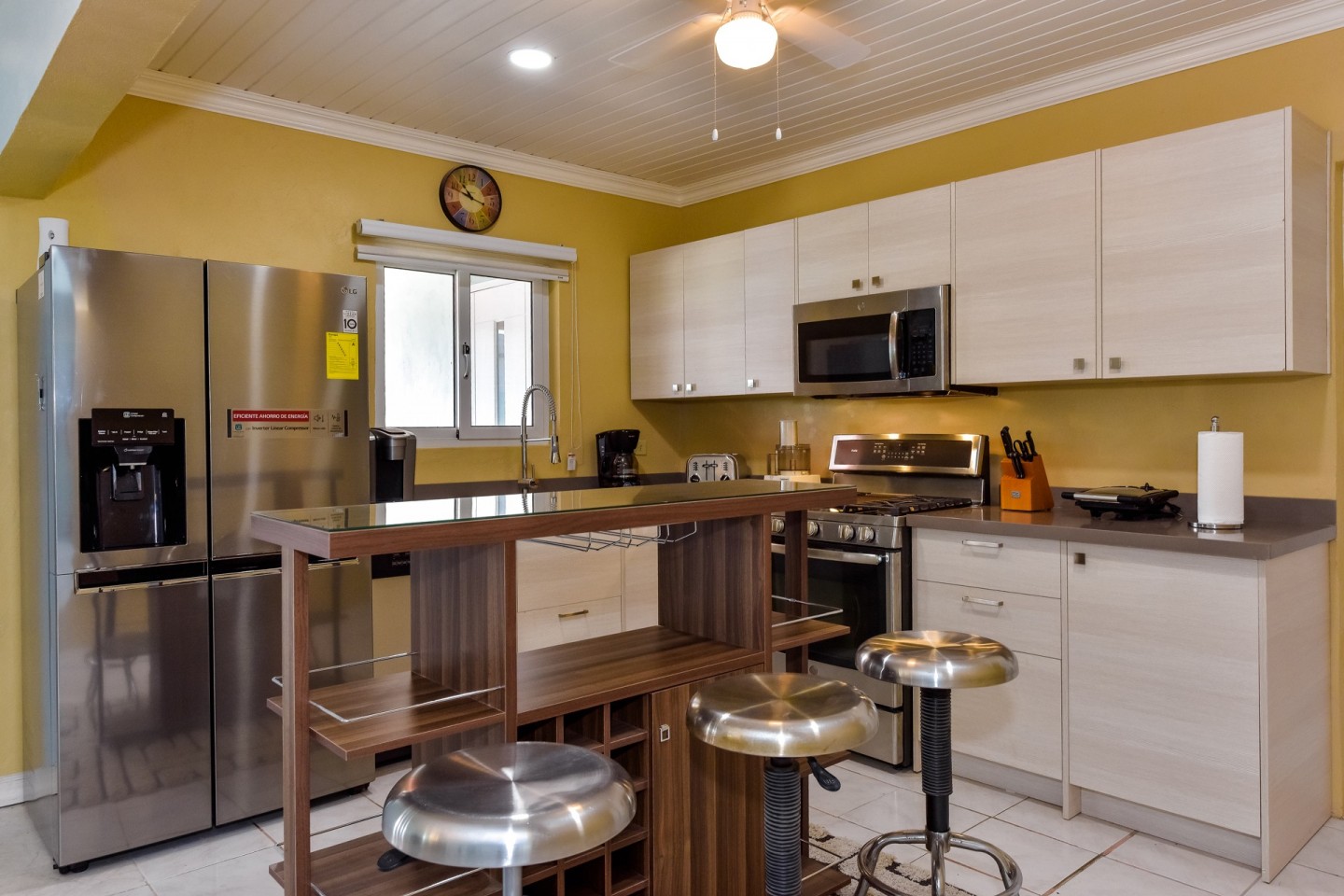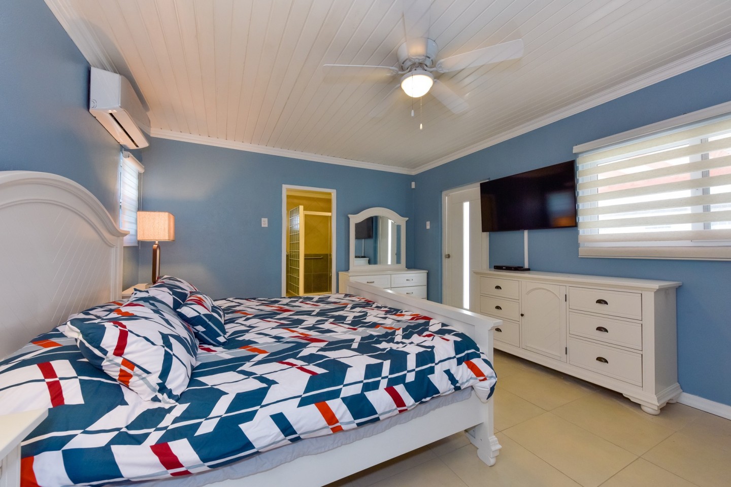 This brand new listed villa is located in the prestigious neighborhood of Esmeralda, just minutes away from Aruba's most beautiful beaches in Malmok. It's only 65 feet from the Gold Coast, and one block away from Golf Course. The fully furnished villa has five bedrooms, three bathrooms a spacious open concept living and dining room which opens up to the kitchen. Upon entering the home you will be greeted by a beautifully furnished living area featuring modern design in mellow colors which brings you a warm feeling the second you enter the space. The kitchen comes fully equipped with stainless steel appliances and beautiful countertops. On the left side of the home you will find the master bedroom with an ensuite that has a jacuzzi a double sink and a huge shower as well. Next to the master bedroom, you have a second bedroom that also has lovely mellow colors and a queen sized bed and a built in closet. There are two more bedrooms on the right wing of the villa, one of which has a separate opening to the backyard, and the other one to the front of the house. The one connected to the backyard can also be rented separately long term or as a short term rental because it has its own fully equipped kitchen and laundry room. Walking out of the villa you have these beautiful modern doors that lead to the fully furnished patio which has its own dining area and lounge chairs where you look out on beautiful large pool, that has built in spotlights that change colors at night.