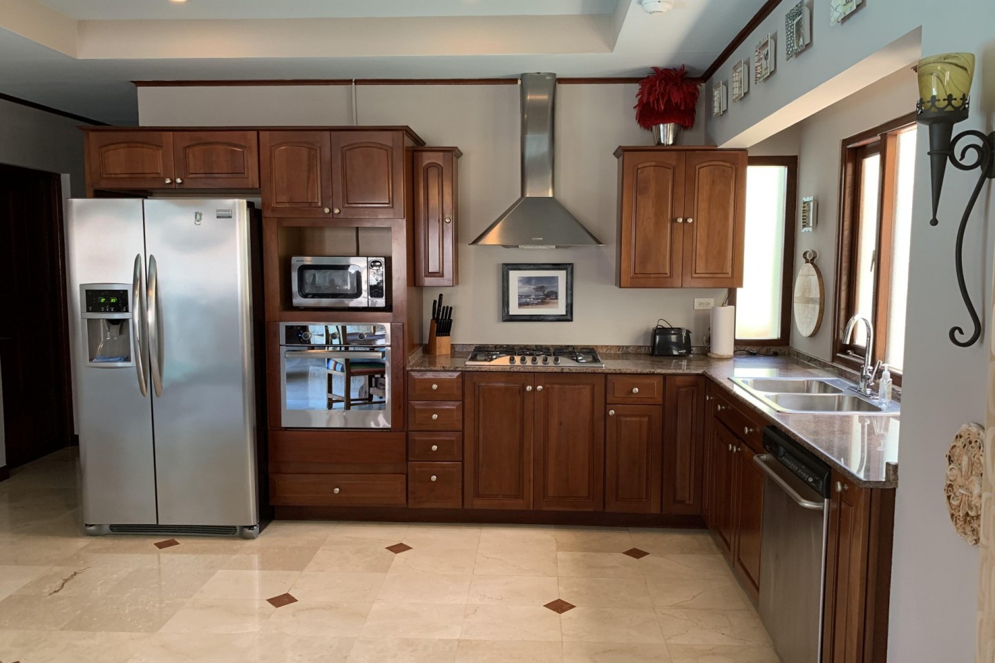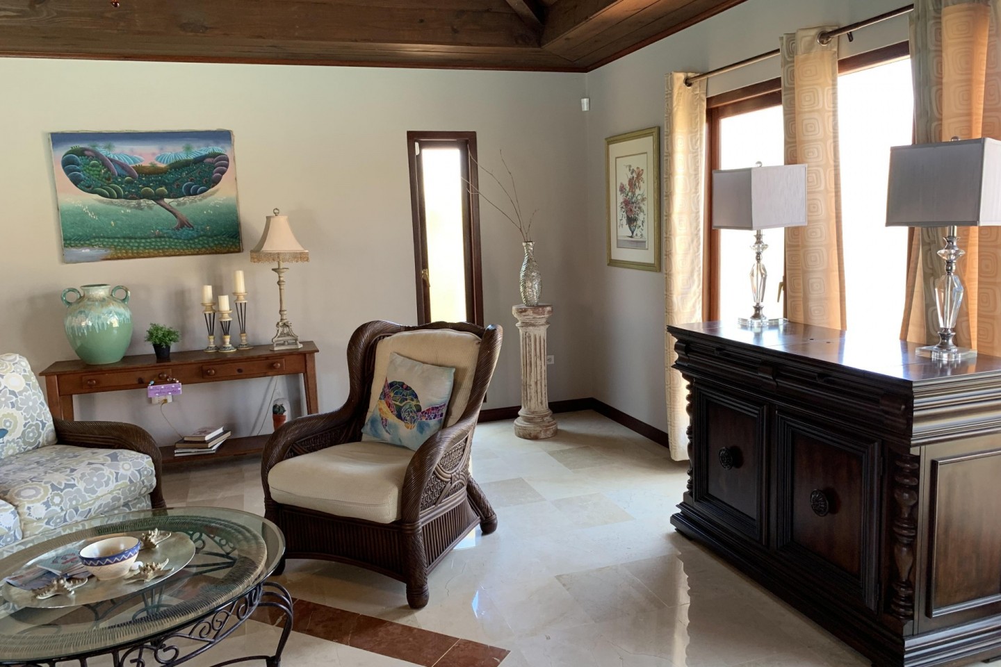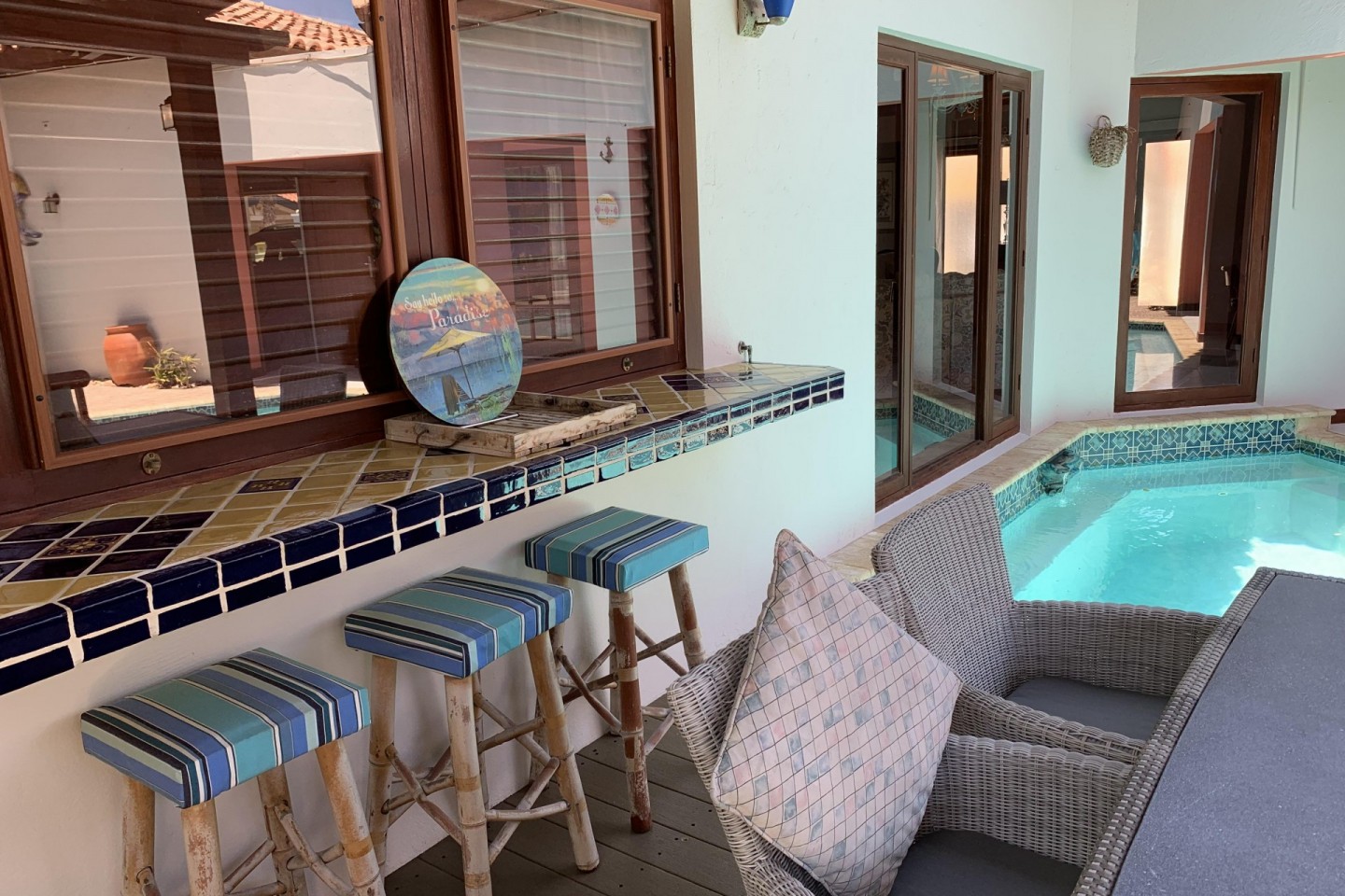Located in the upscale neighborhood of Esmeralda, you will find Sunny Daze Villa. This well-maintained, cozy home offers 5 bedrooms and 4.5 bathrooms. The main house has a spacious open layout, with fully fitted kitchen, dining, and lounge area. Large patio windows and doors enable you to enjoy beautiful views of the private swimming pool, cold water jacuzzi, and tranquil garden.