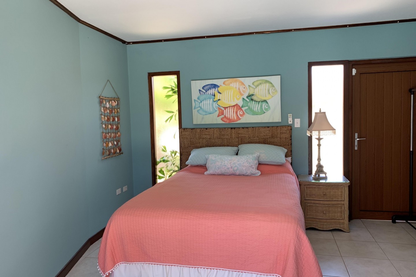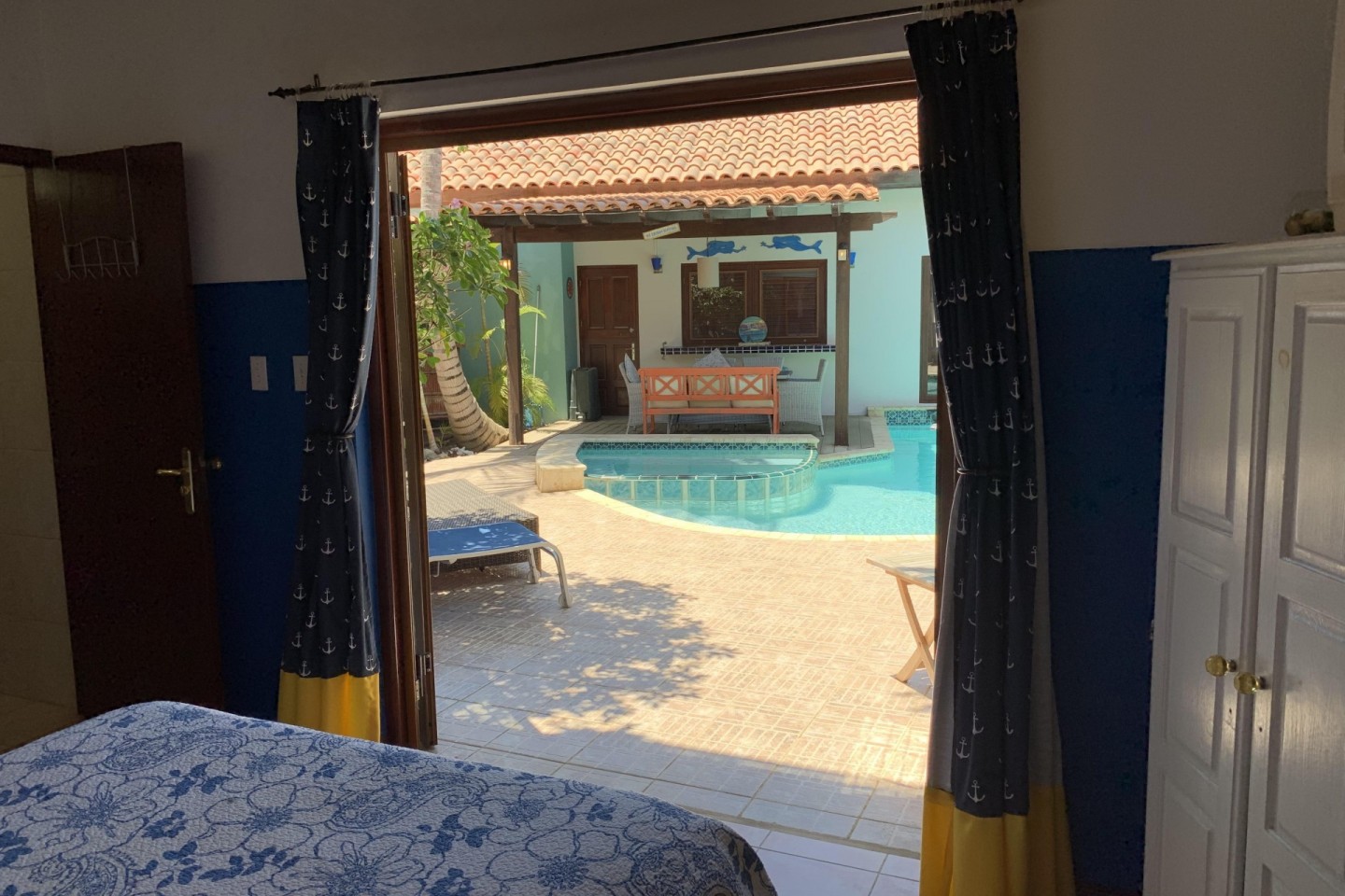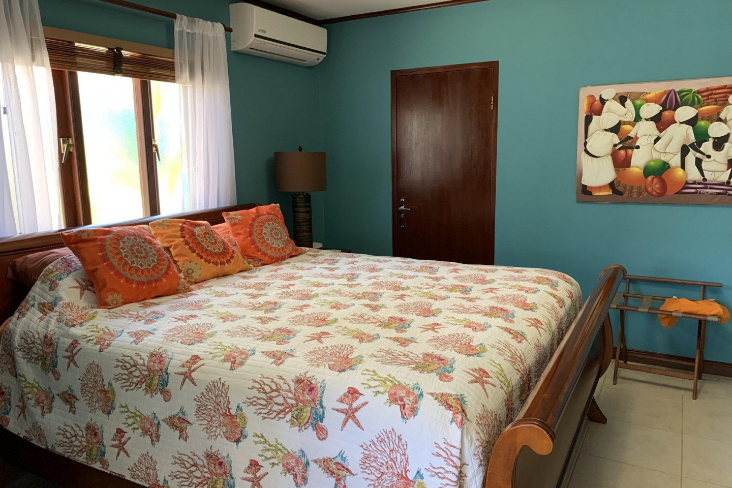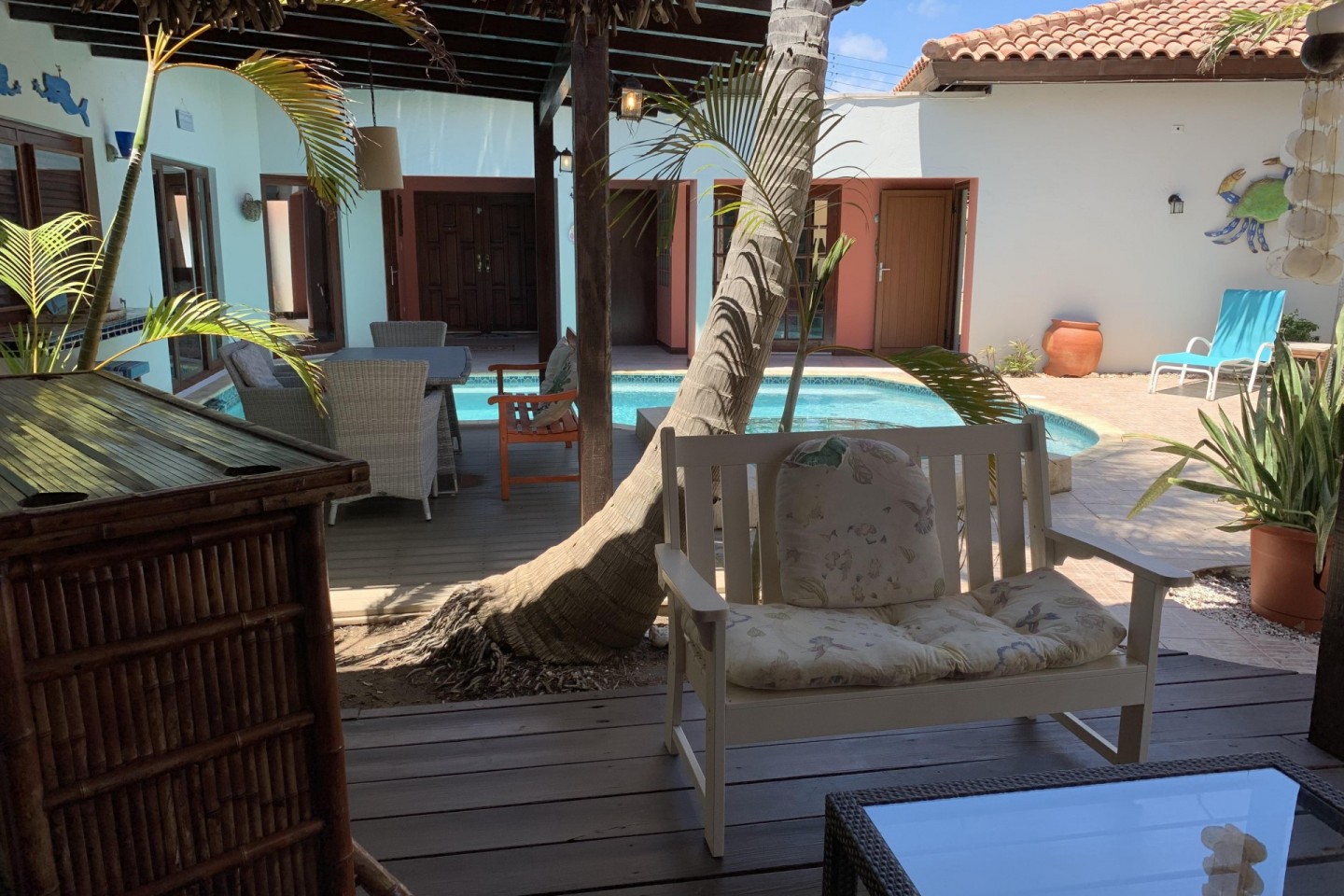 The main house offers a master bedroom with an en suite bathroom, king-size bed, and T.V. Also located in the main house is a second bedroom with a queen-size bed and a family bathroom. Outside the main house are three additional bedrooms, two have queen size beds and one has a king-size bed. Two of the bedrooms are en-suite. In total the house can comfortably accommodate a maximum of 9 guests, perfect for couples and families alike.