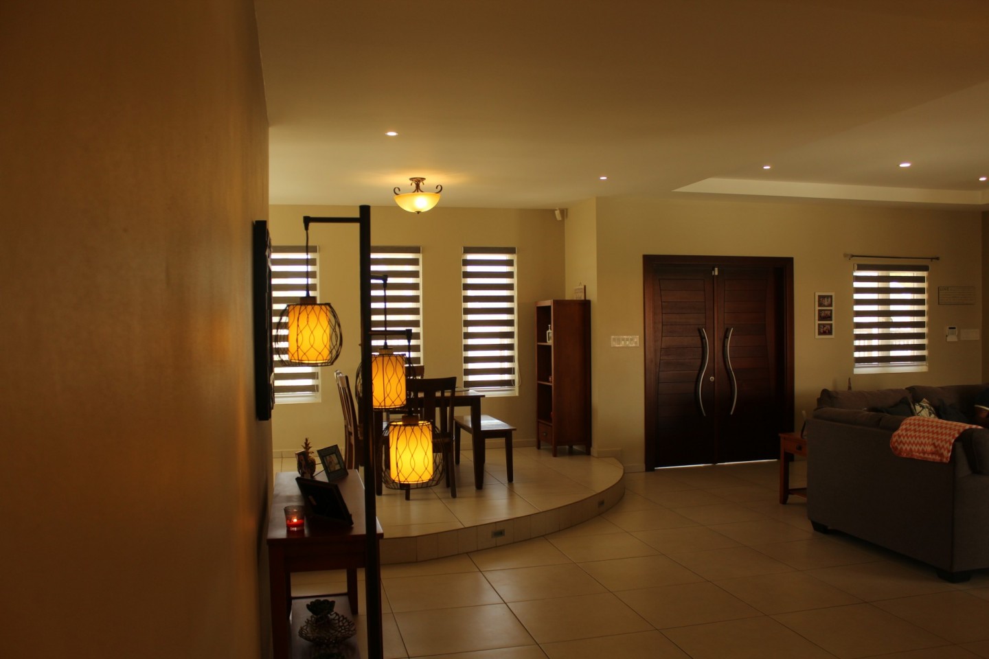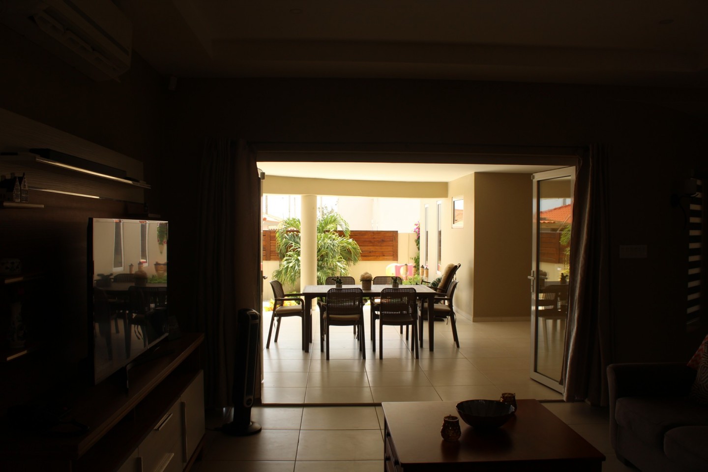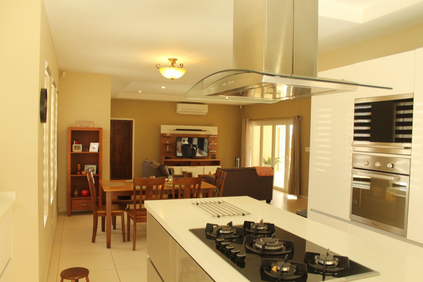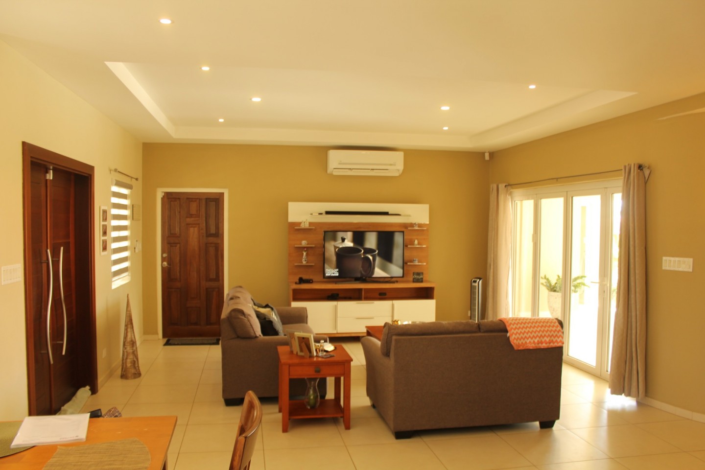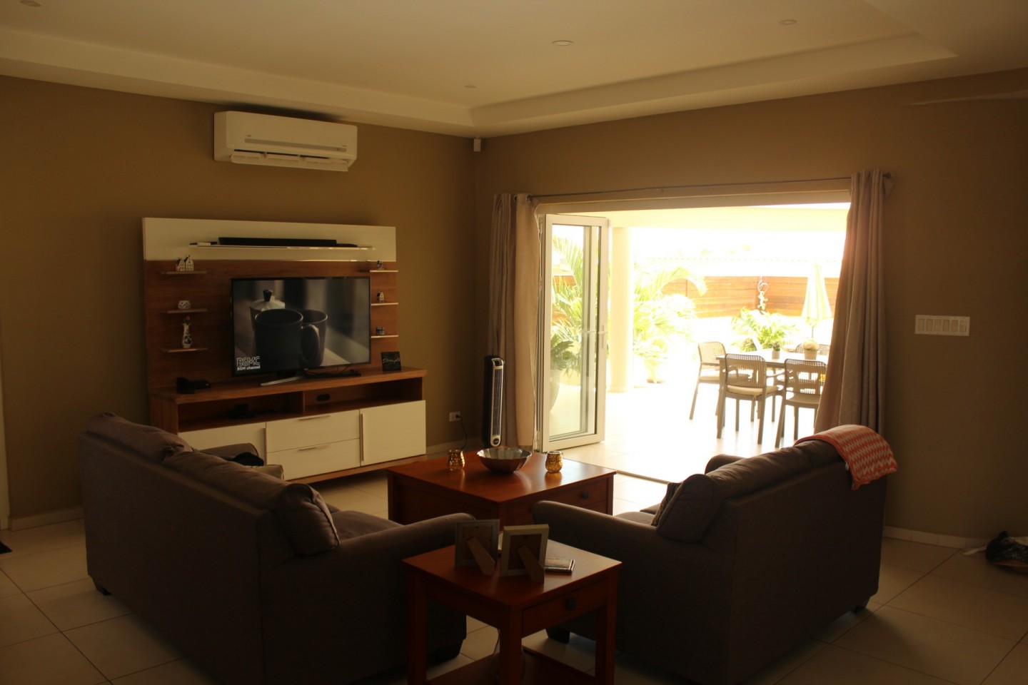 Upon entering the home you are welcomed by an open concept living room that looks out through double insulated glass harmonica doors onto the terrace.