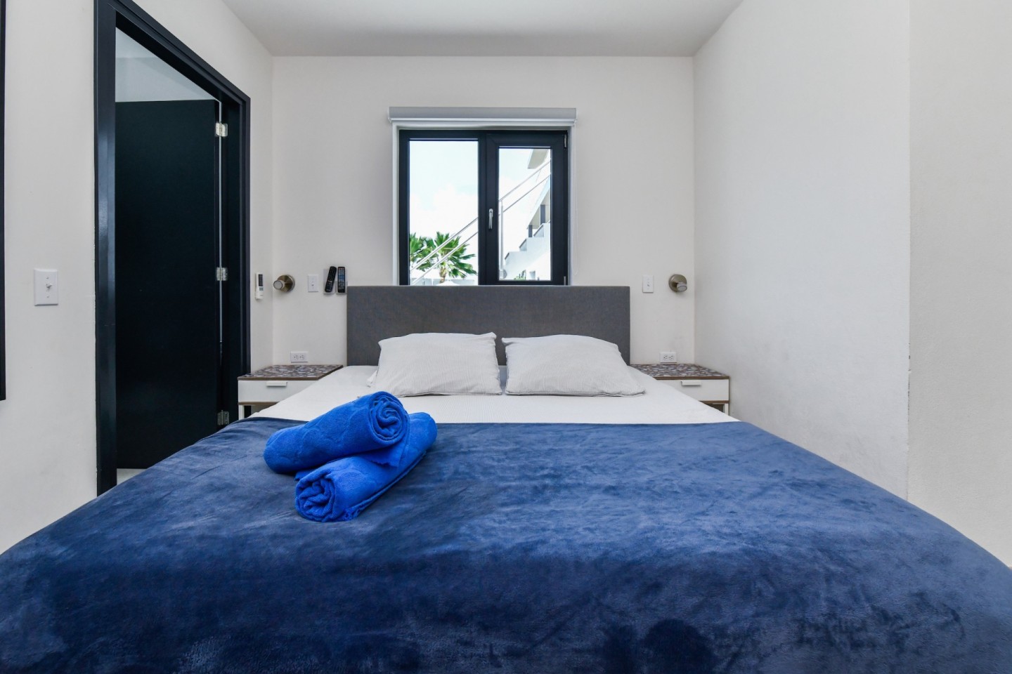 Three ground-floor apartments boast two bedrooms and two bathrooms, while four one-bedroom apartments are on the first floor. The garden one-bedroom apartment is conveniently located on the ground floor. The stunning penthouse, with two bedrooms and two bathrooms, offers breathtaking views of Aruba. It comes complete with a private driveway, elevator, and a jacuzzi on the terrace. The master suite is a true sanctuary, featuring an open bathroom with a bathtub, double shower, and a 10-foot projector screen for your entertainment.