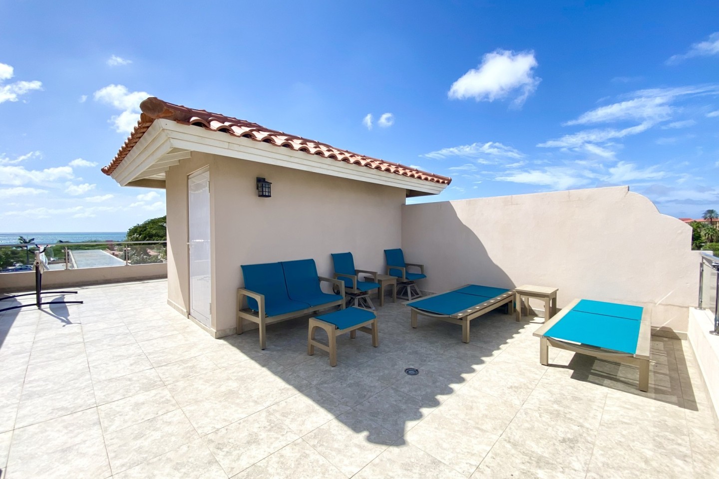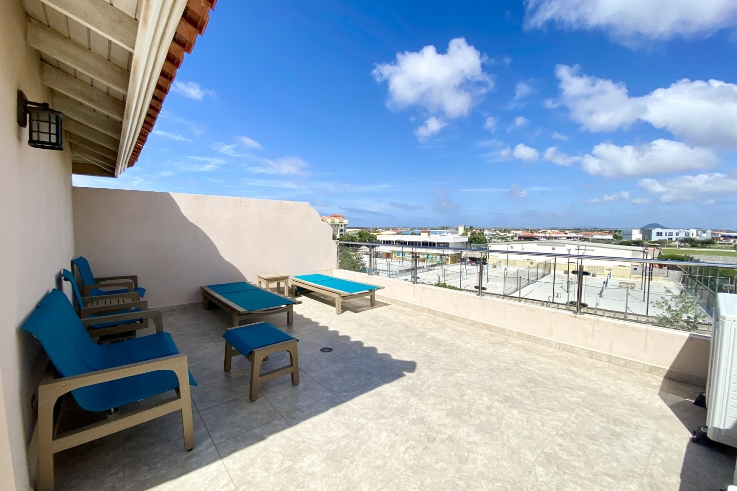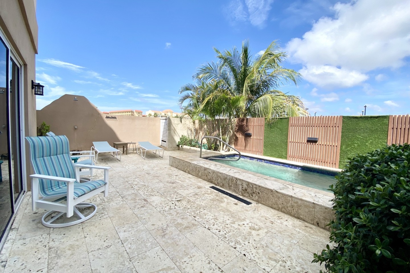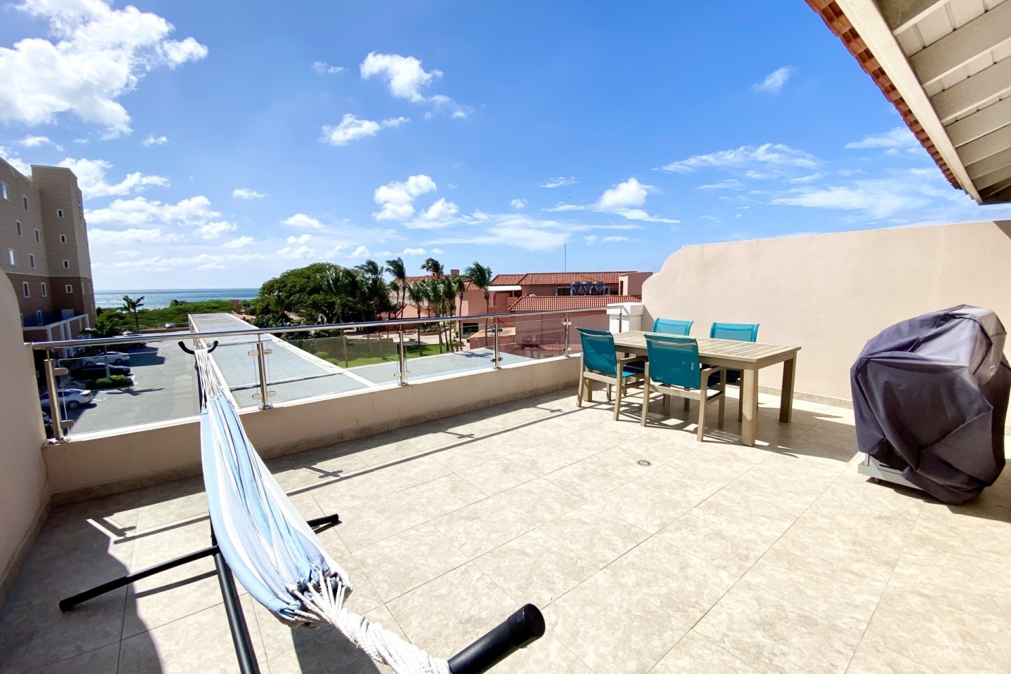 This spacious and modernized 3-level home offers you a back patio with a private plunge pool, outdoor shower, outdoor lounging area to enjoy the Aruban breeze. On the ground floor you will find a full sized kitchen with a two door refrigerator, electric stove top, microwave oven and more. On the first floor you will find two bedrooms with each their own private bathroom and walk in closets. On the third and top floor you have a large private rooftop terrace with a lovely ocean view, its own BBQ grill with an outdoor dining table plus lounge chairs. This gives you the perfect space to spend your free time in the Aruban sun.