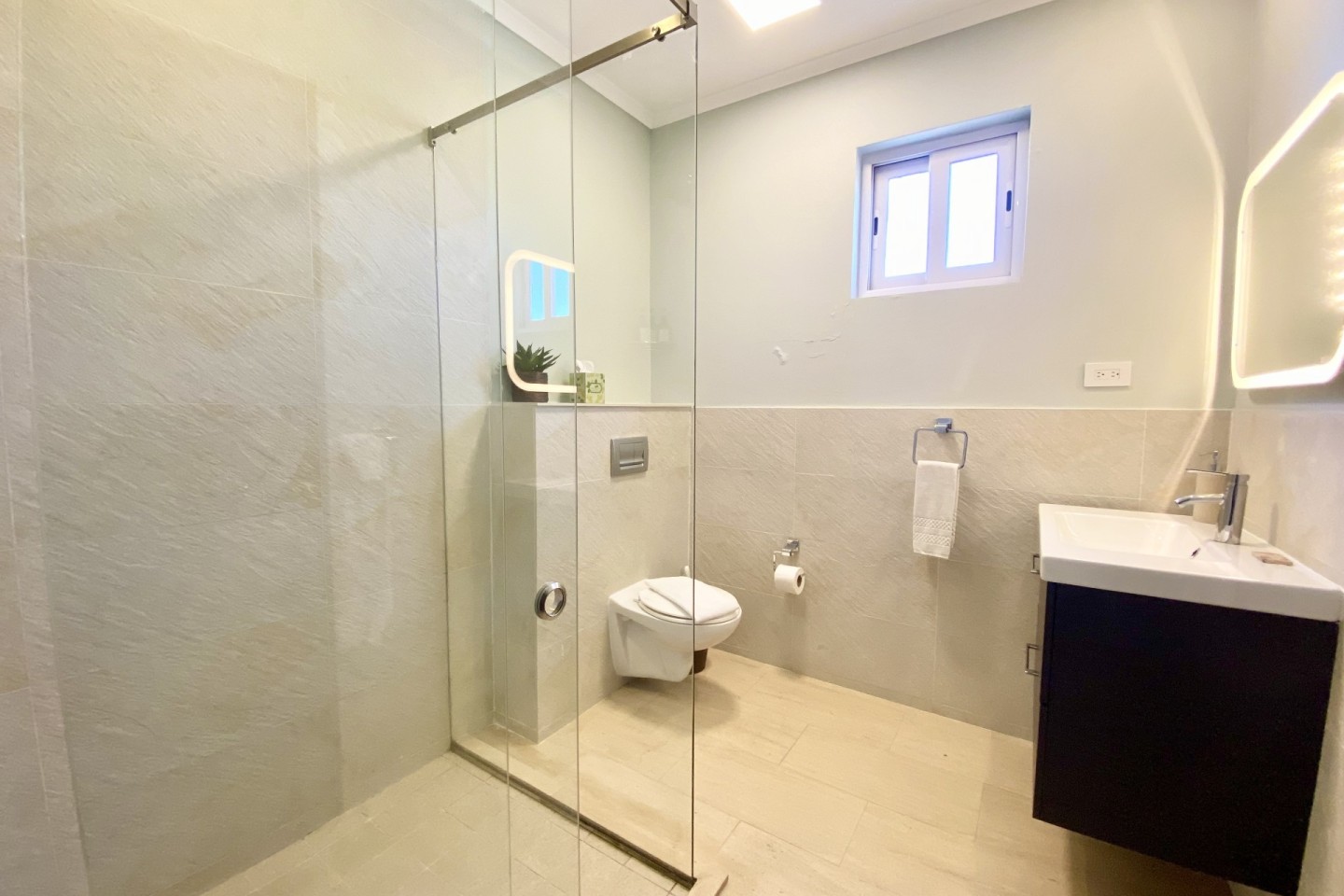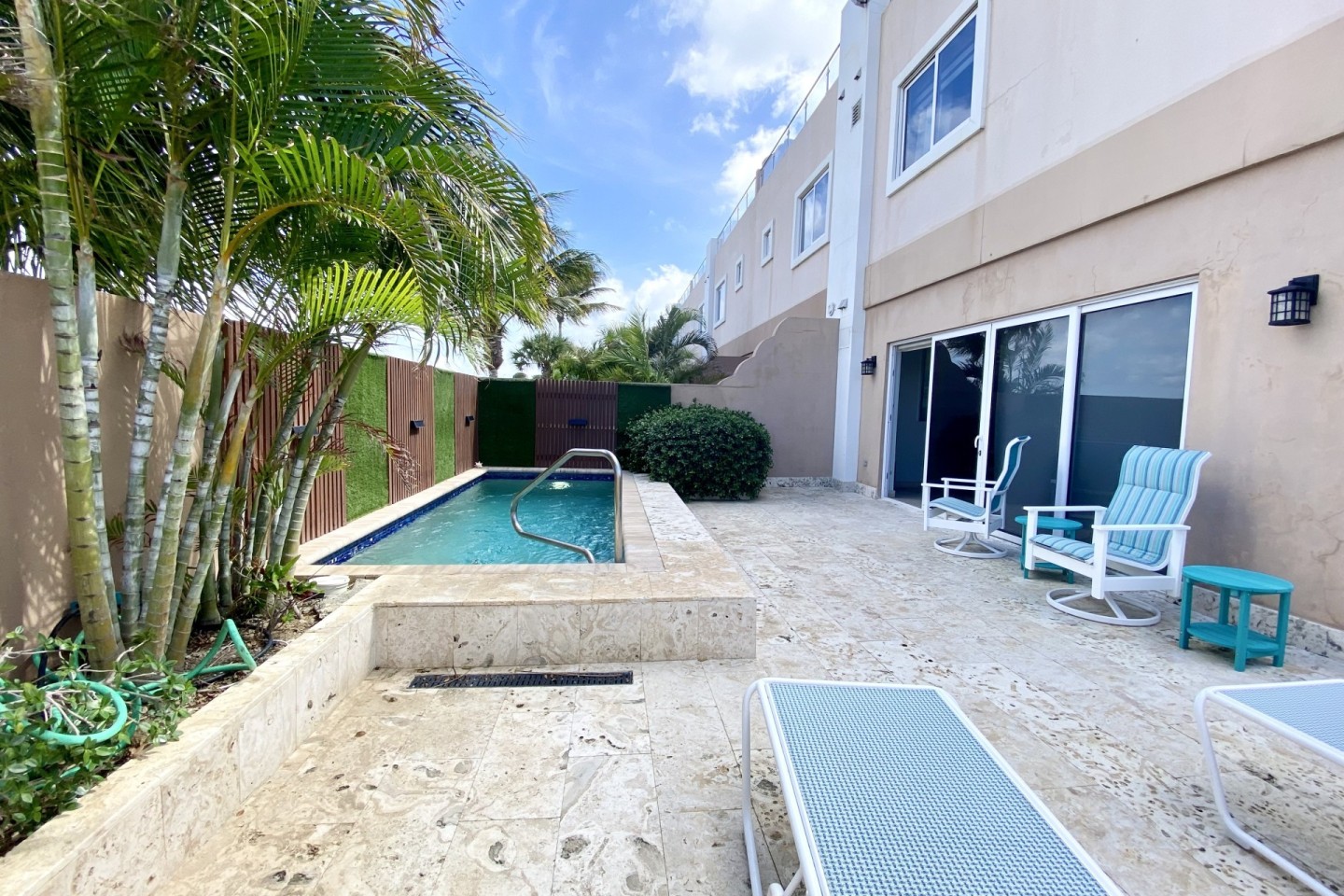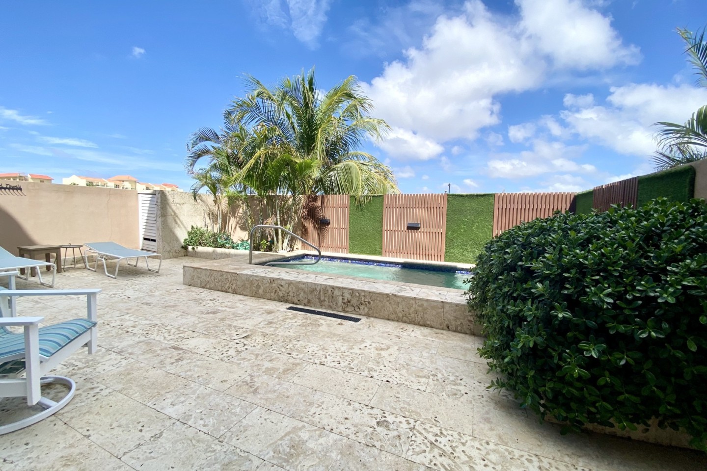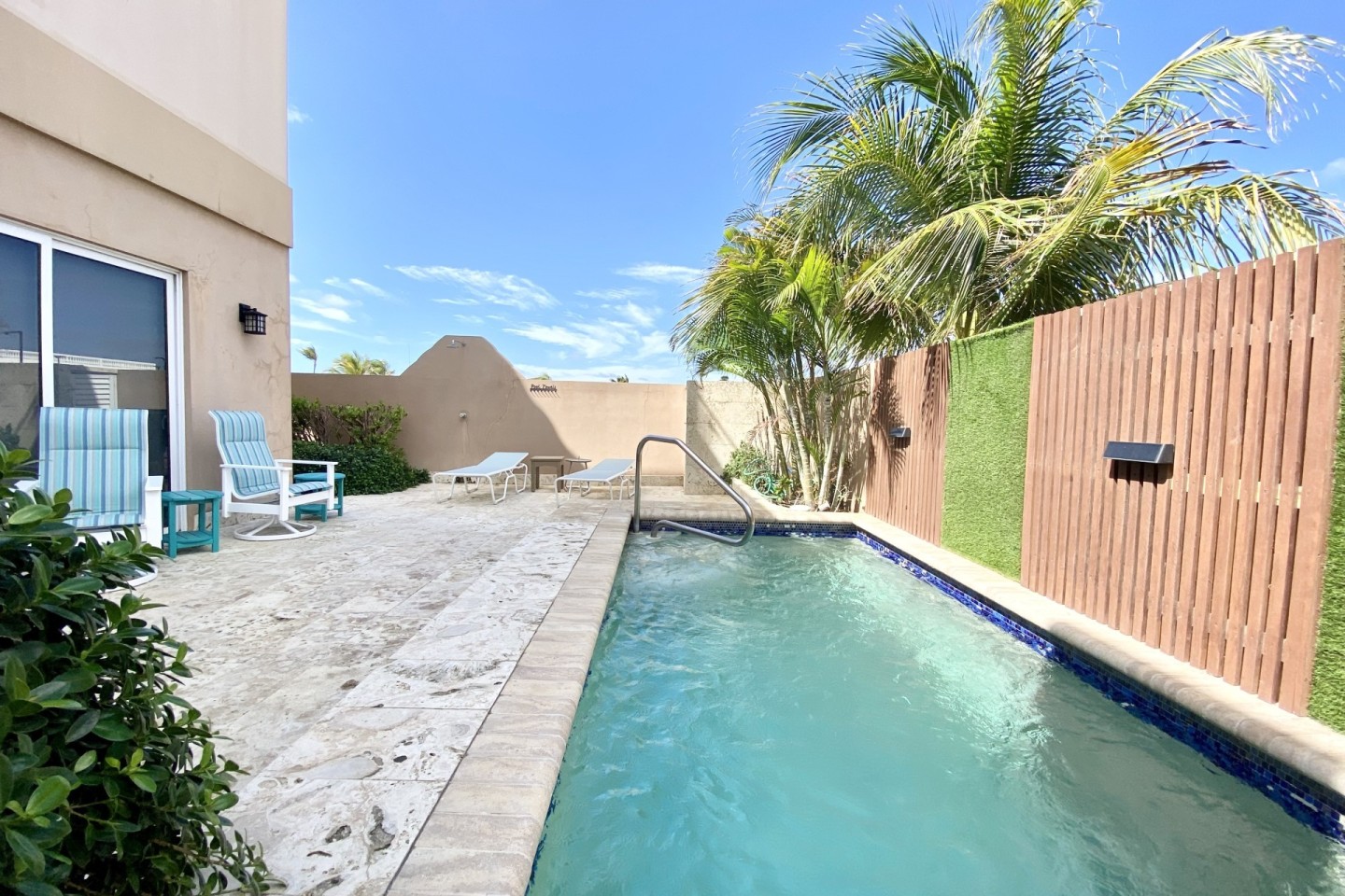This spacious and modernized 3-level home offers you a back patio with a private plunge pool, outdoor shower, outdoor lounging area to enjoy the Aruban breeze. On the ground floor you will find a full sized kitchen with a two door refrigerator, electric stove top, microwave oven and more. On the first floor you will find two bedrooms with each their own private bathroom and walk in closets. On the third and top floor you have a large private rooftop terrace with a lovely ocean view, its own BBQ grill with an outdoor dining table plus lounge chairs. This gives you the perfect space to spend your free time in the Aruban sun.