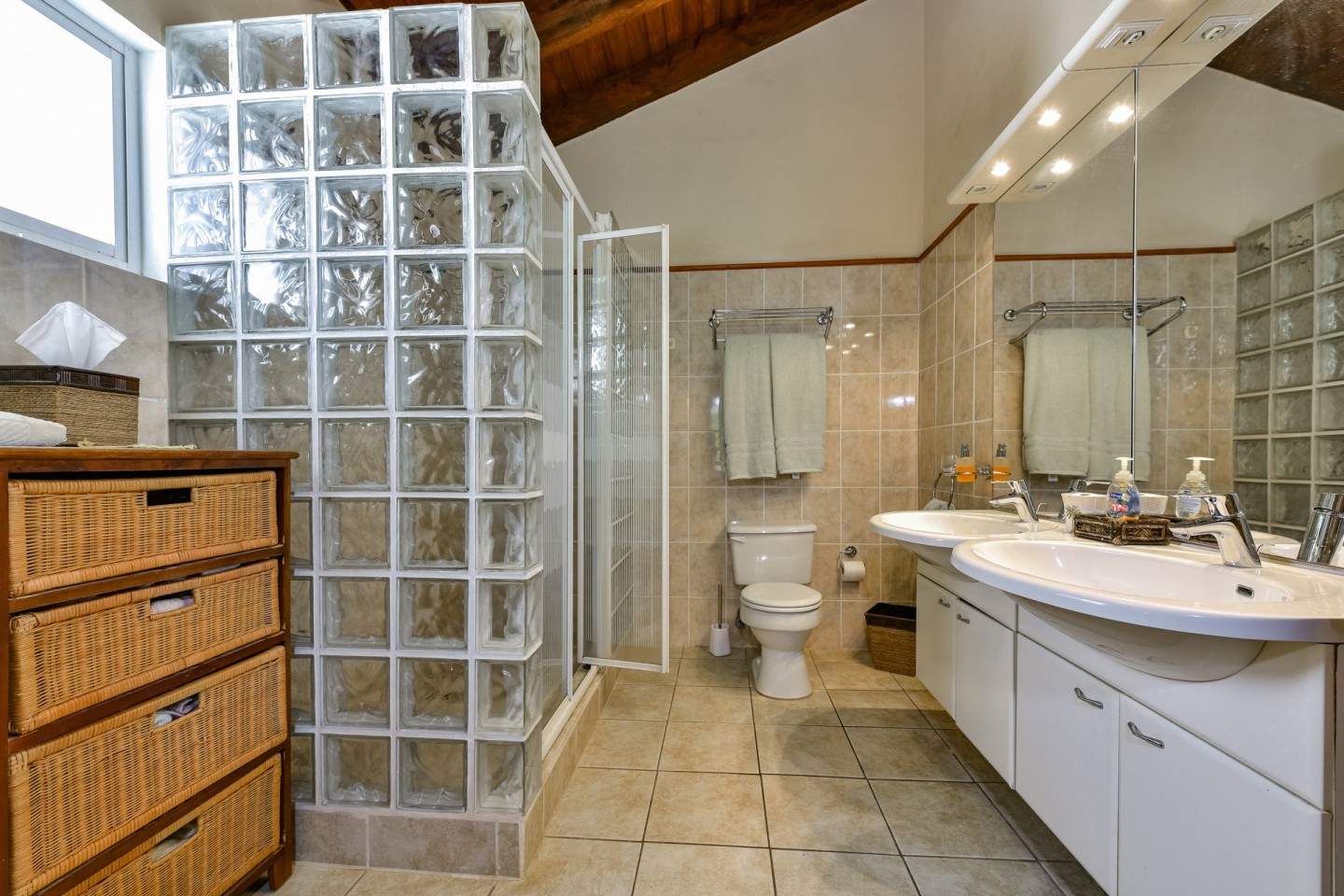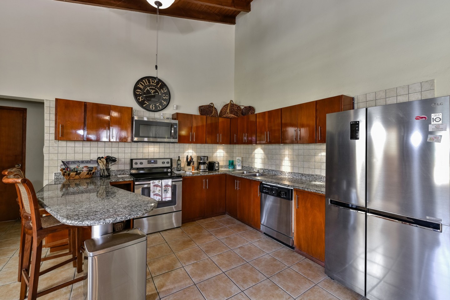 Upon entering this semi-detached Villa, you will find tall beam ceilings and a spacious open concept living, dining room and kitchen giving the home a light airy feel. The fully equipped kitchen offers premium wooden cabinets, stainless steel appliances and an amazing breakfast bar perfect to enjoy a coffee at every morning. Adjacent to the kitchen you find the hallway leading to the Villa’s first 3 bedrooms each with their own ensuite bathrooms and built in closets. Further down the hallway you will also find the laundry/storage room. Continuing up to the second floor of the Villa you will be met with the Master Bedroom which features an ensuite bathroom, a walk-in closet as well as sliding doors leading on to the balcony. The balcony itself features beautiful views of the pool and slight ocean views with relaxing lounge seating, the perfect spot to relax and watch the sunset. Next to the Master is the remaining bedroom also with its own ensuite bathroom and walk-in closet. On the top of the stairs, next to the Master and second bedroom, you will find a wet bar area. The backyard has a covered patio, incredible pool and a beautiful well-maintained landscaped garden. This Villa comes fully furnished with 3 parking spots, is built on approximately 570 m2 of long lease land and has a built-up size of 200 m2.