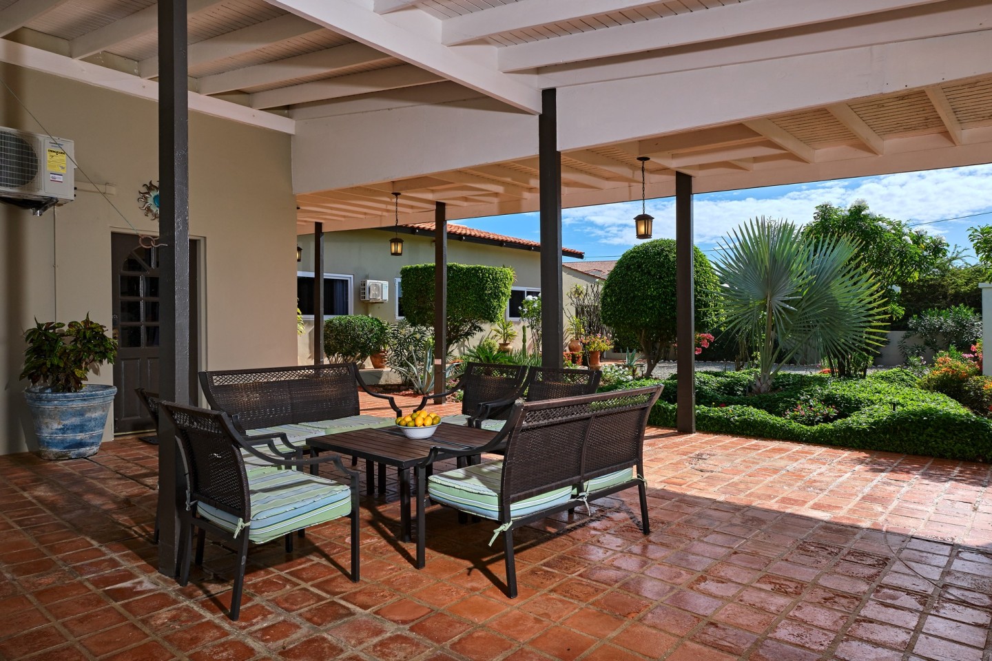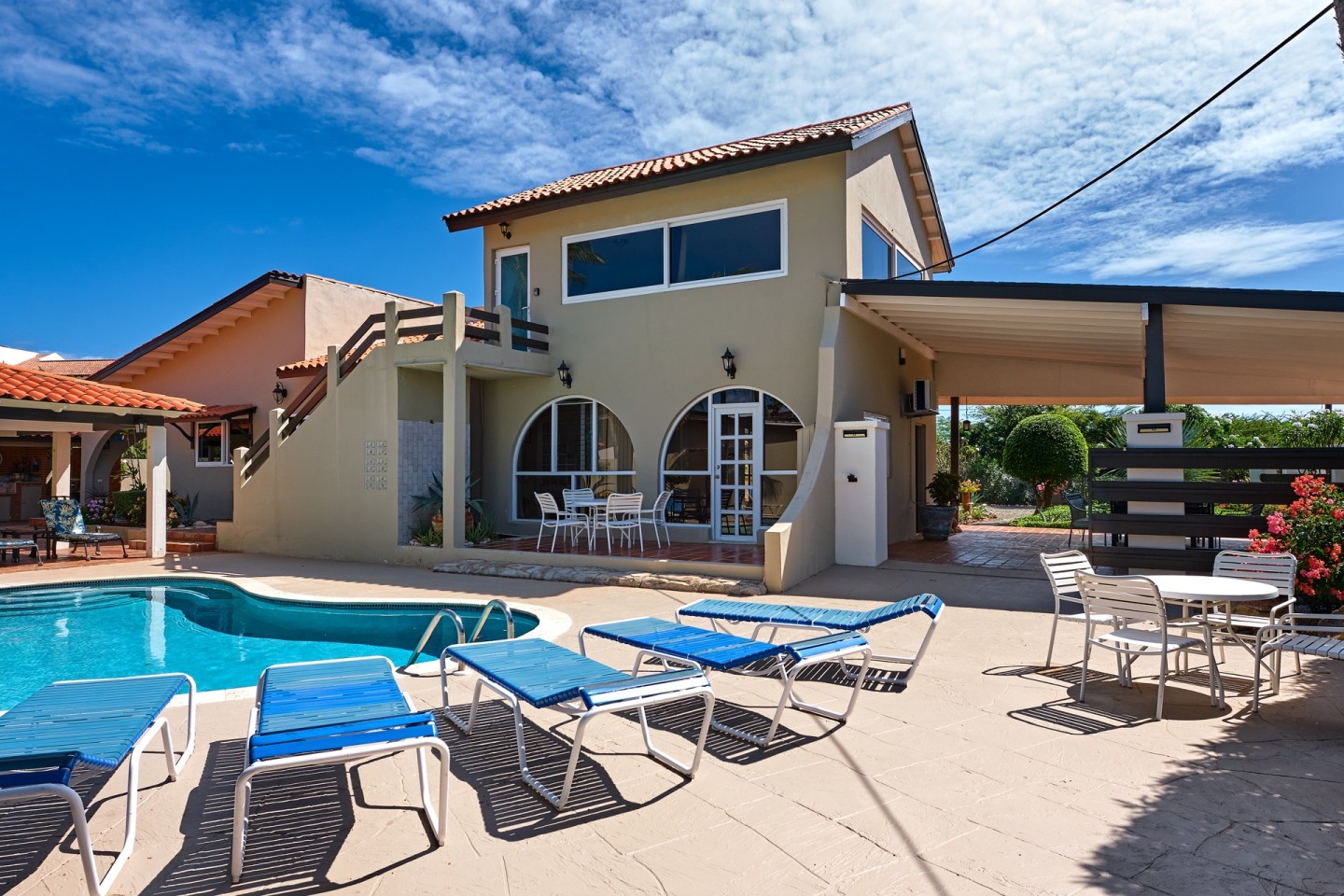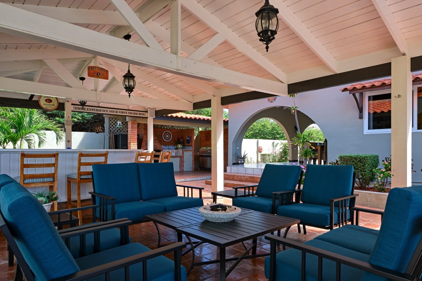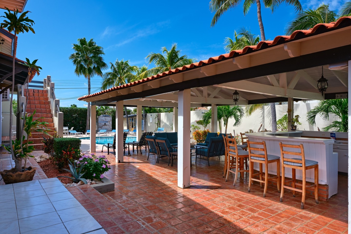 The large covered patio with dining and seating area is perfect for al fresco dining and enjoying the warm Caribbean breeze. The second-floor guest suite is accessible via the outdoor stairs in the garden.