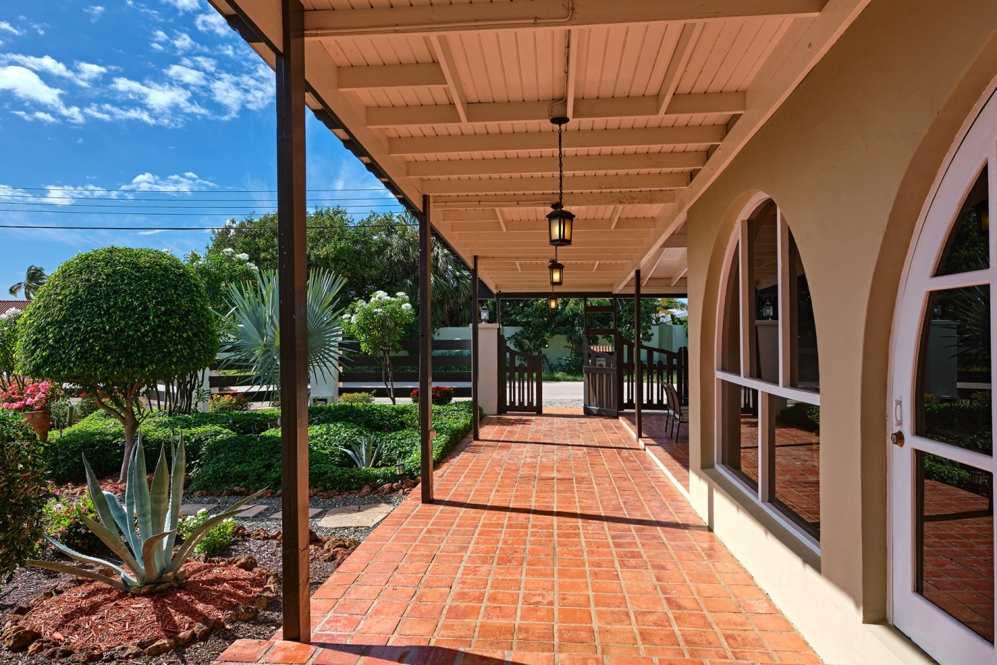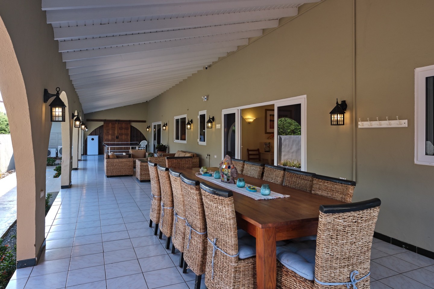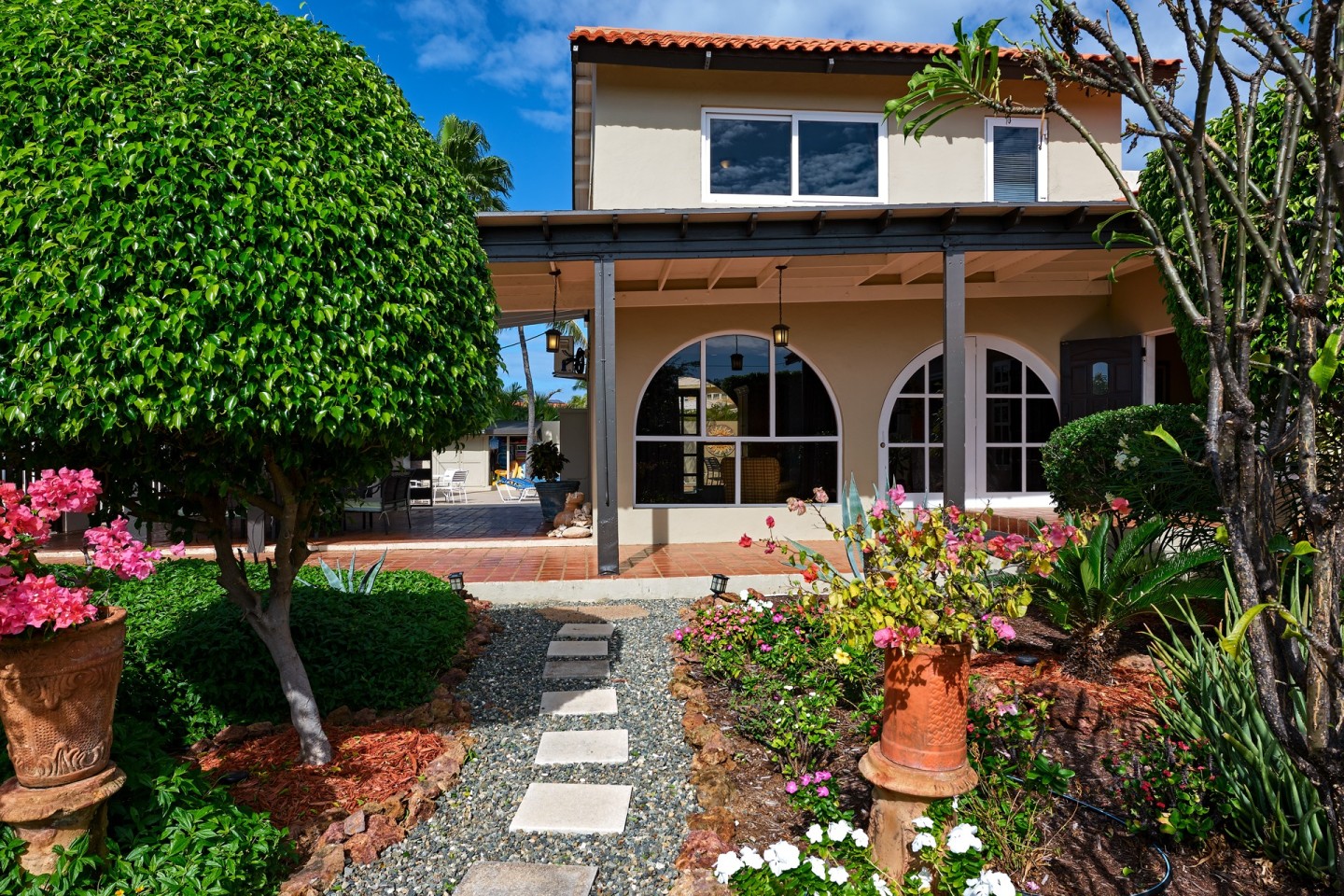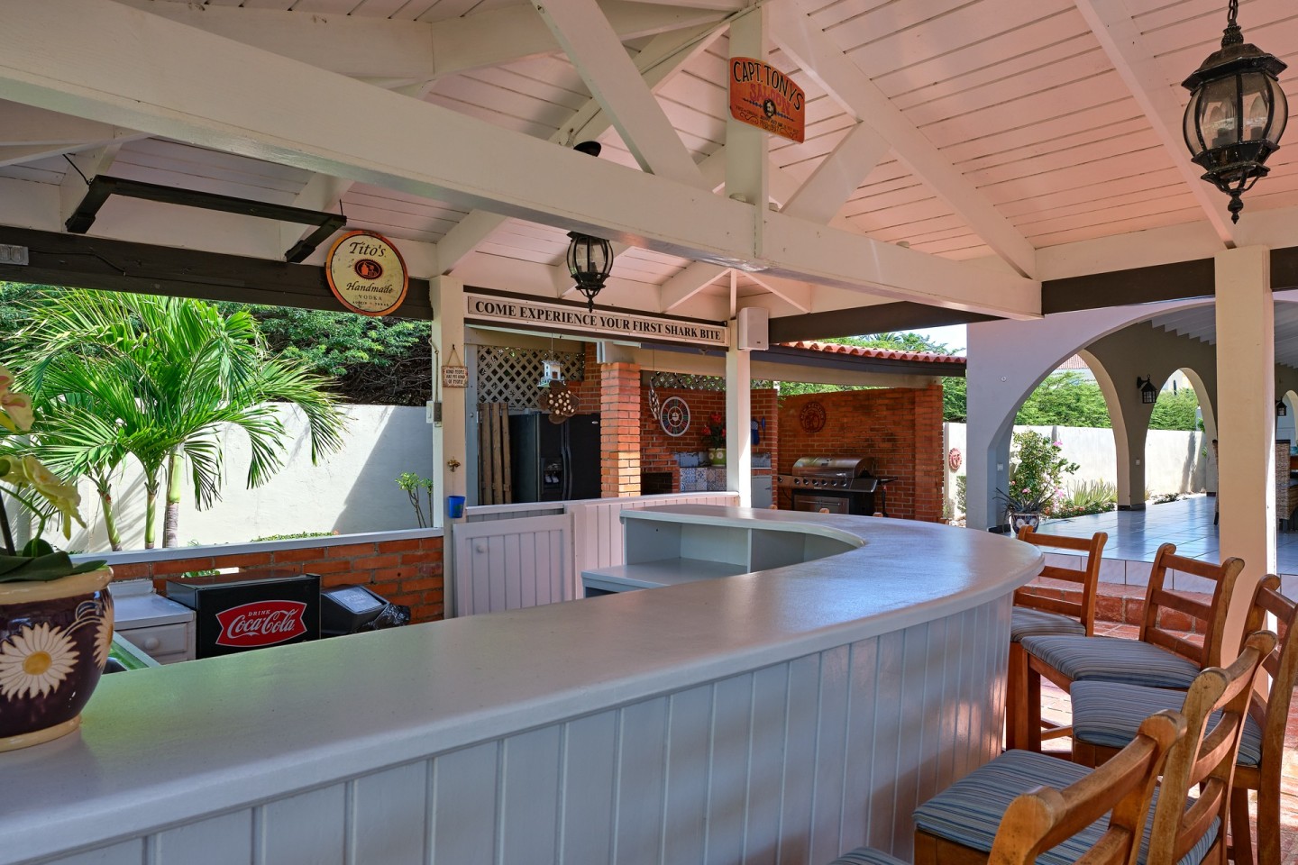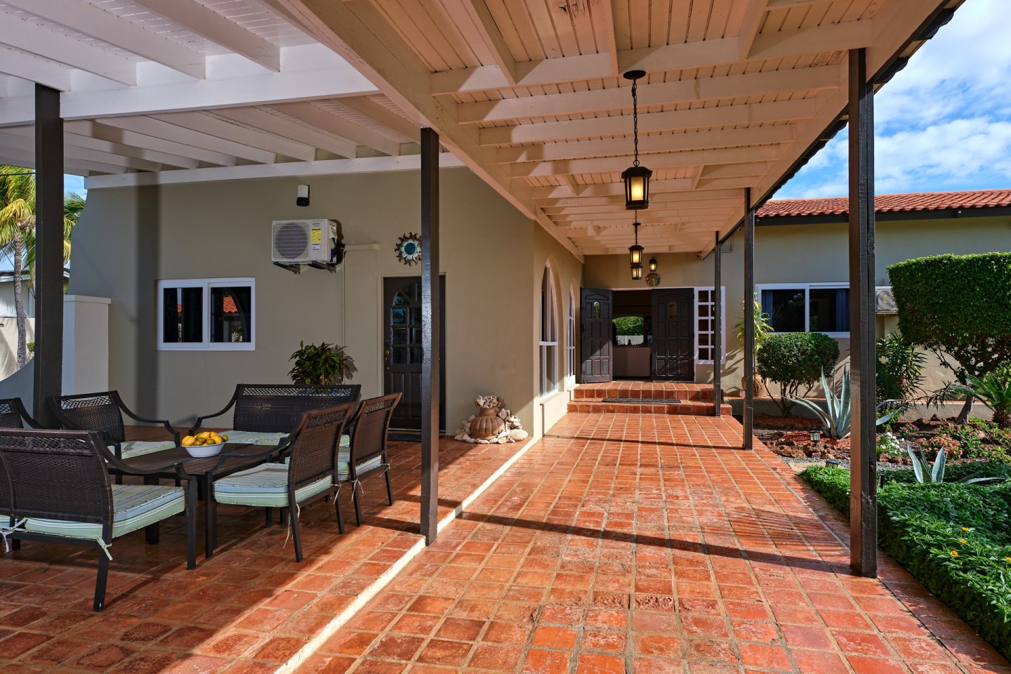 The large covered patio with dining and seating area is perfect for al fresco dining and enjoying the warm Caribbean breeze. The second-floor guest suite is accessible via the outdoor stairs in the garden.