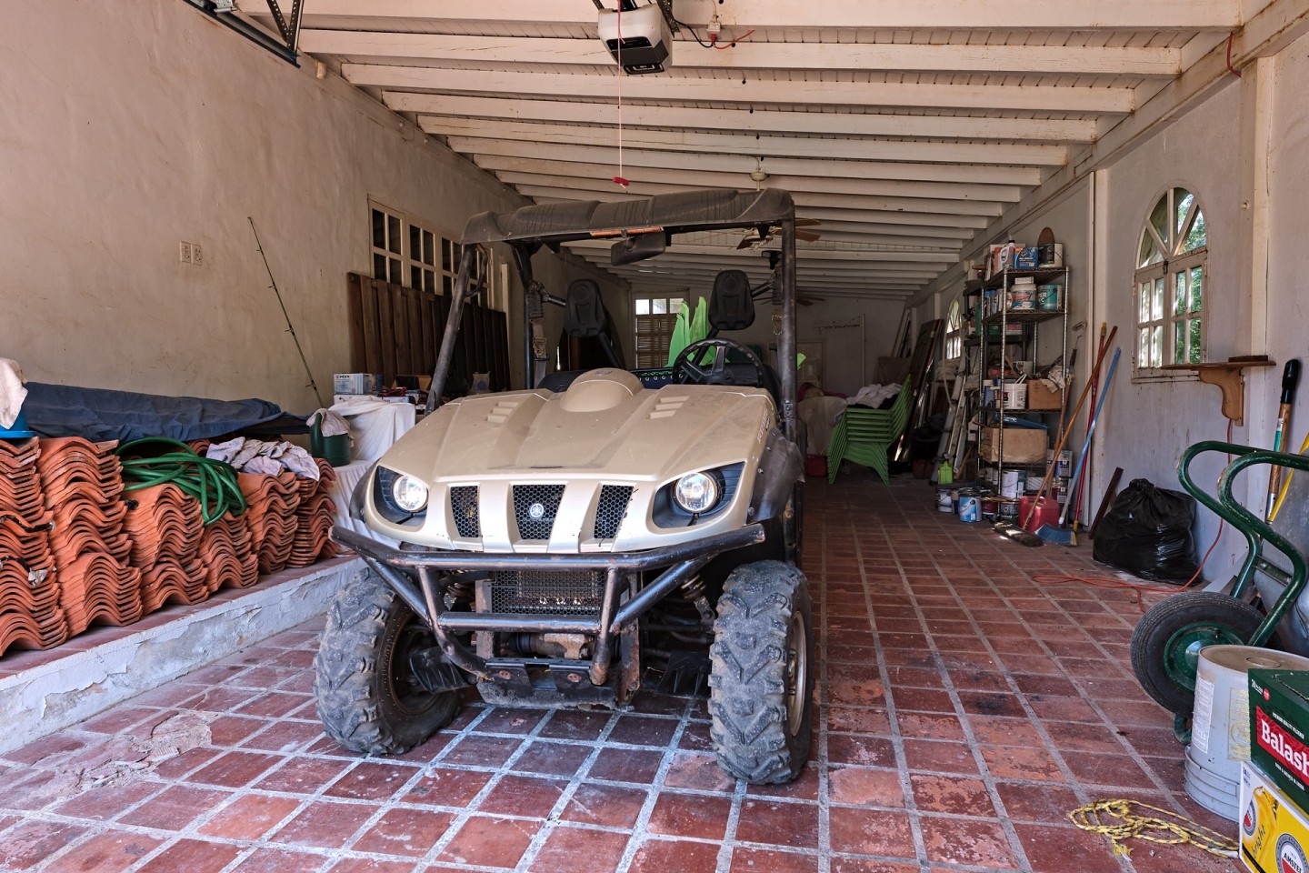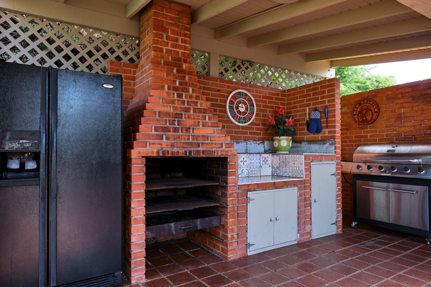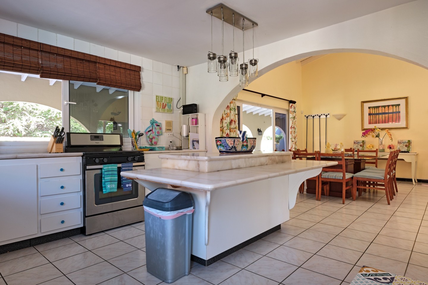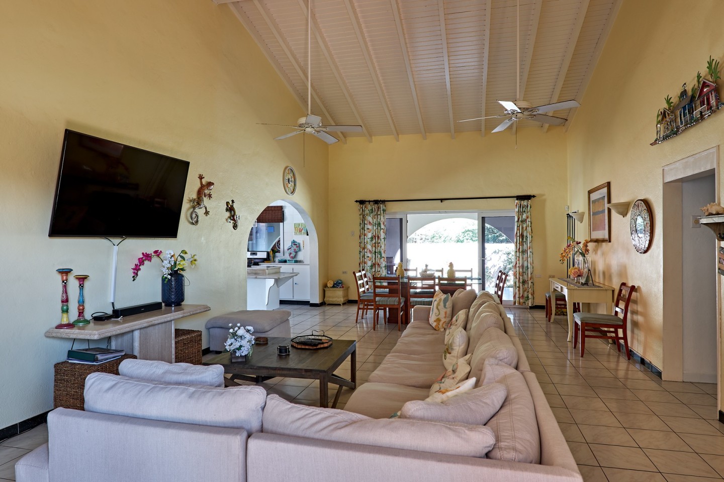 The large covered patio with dining and seating area is perfect for al fresco dining and enjoying the warm Caribbean breeze. The second-floor guest suite is accessible via the outdoor stairs in the garden.