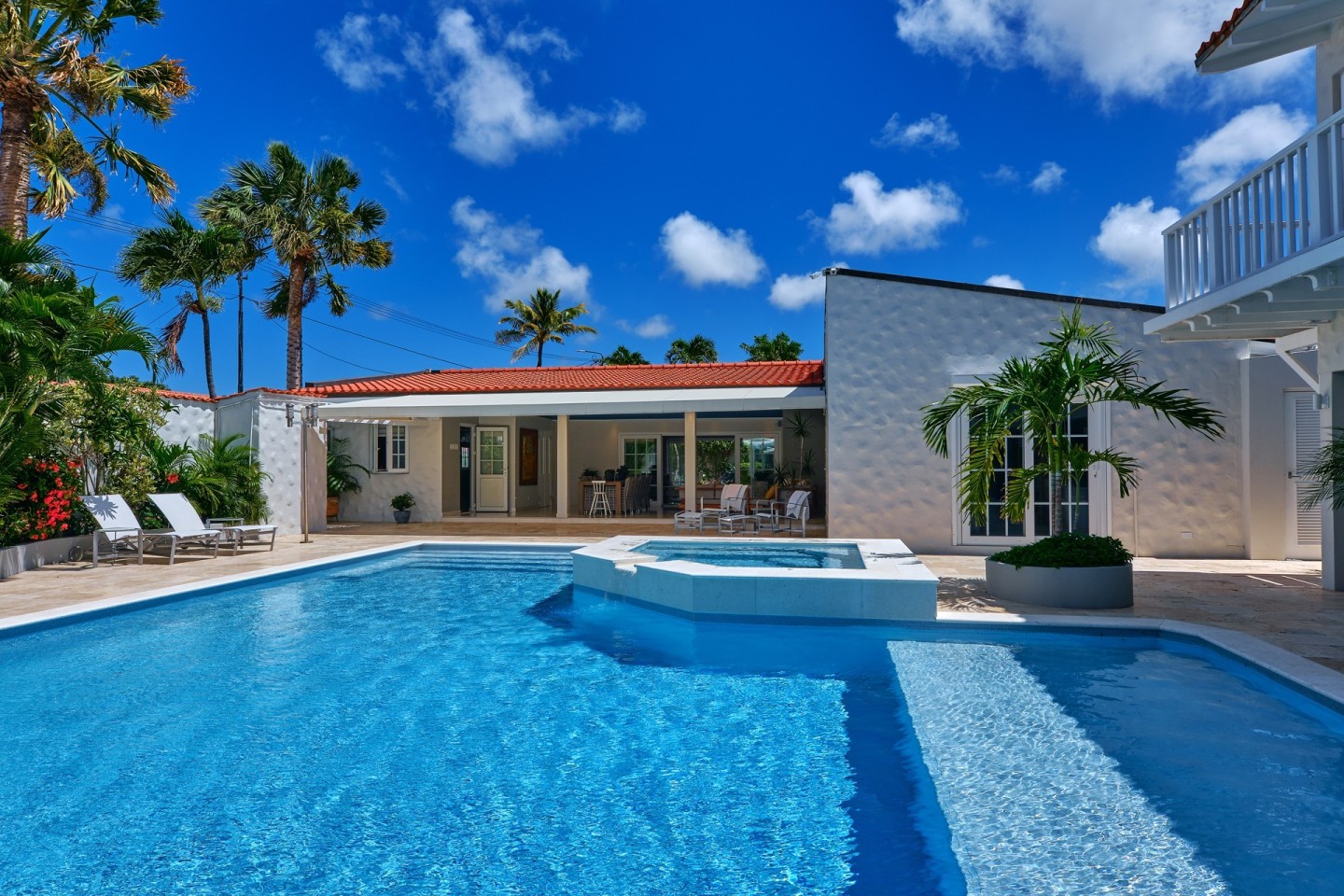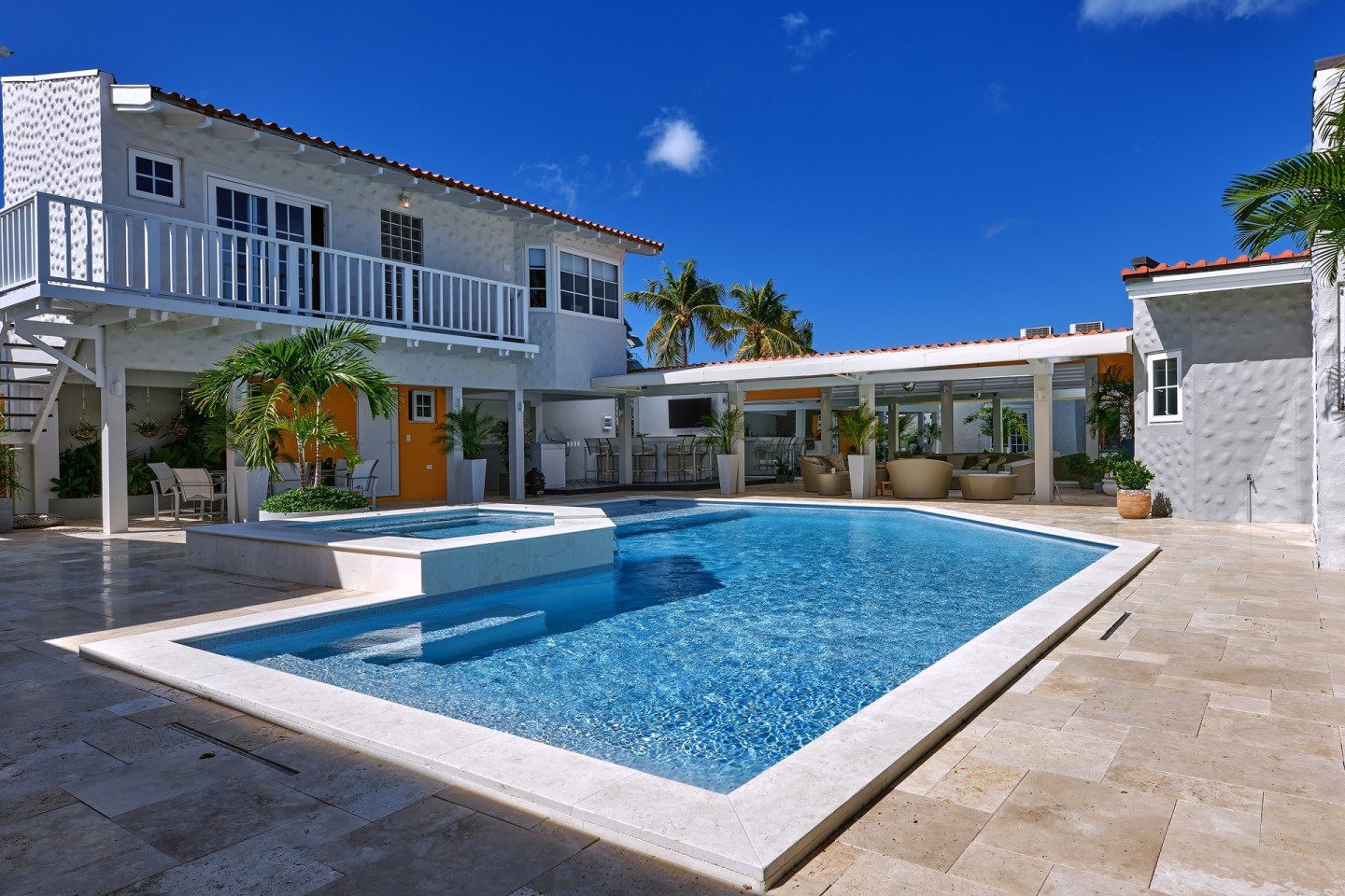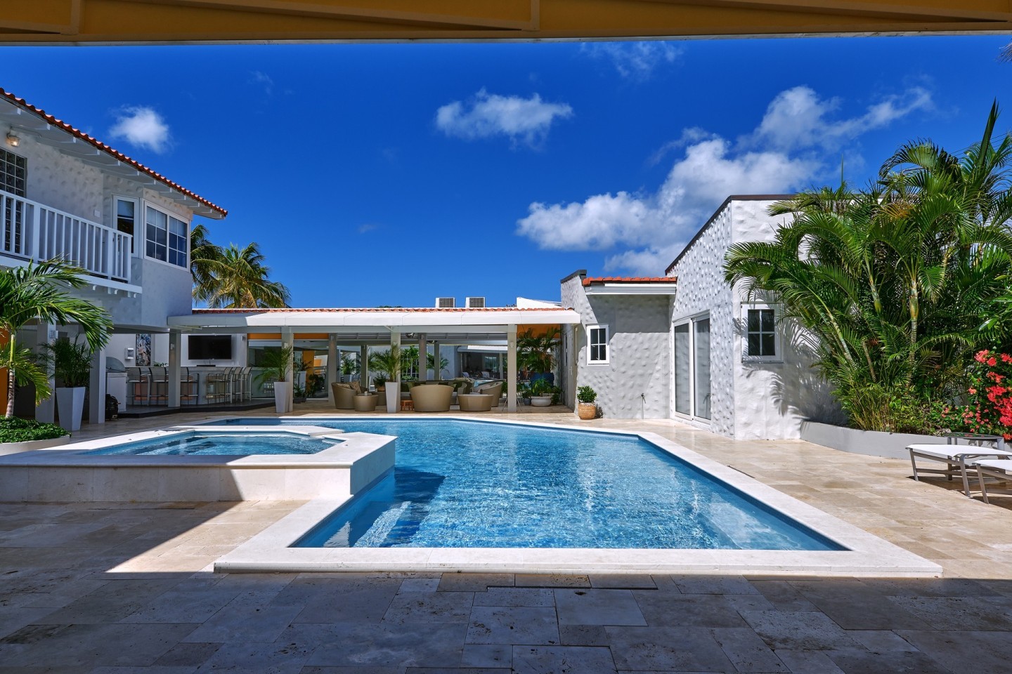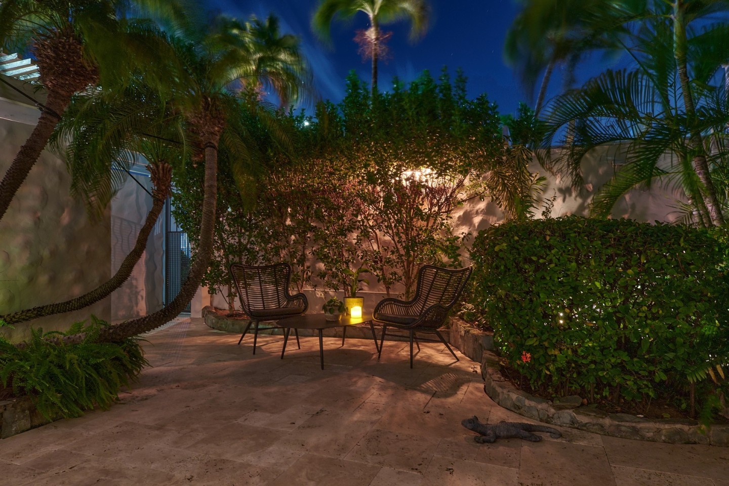 The master bedroom suite includes a massive walk-in closet, an en-suite bathroom with double-sink and walk-in shower, and access to the tropical garden. Two other sizeable guest bedrooms with built-in closets share the same bathroom. The outdoor area provides a sheltered patio, ideal for get-togethers and celebrations, including a large dining area and a cozy lounge area. Additionally, the newly set up pool with a heated Jacuzzi is encircled by lush tropical landscaping and travertine natural stone flooring, creating a personal paradise for rest and relaxation. There is also a bar, outdoor kitchen with marble tile, a full bathroom, and a Sonos wireless music system throughout the house. Also featured is an office with full bathroom that could be converted into a guest bedroom, as well as a second-floor studio apartment with access from the garden and pool area.