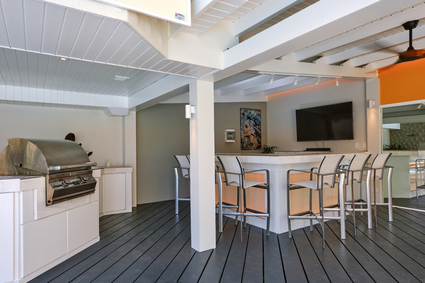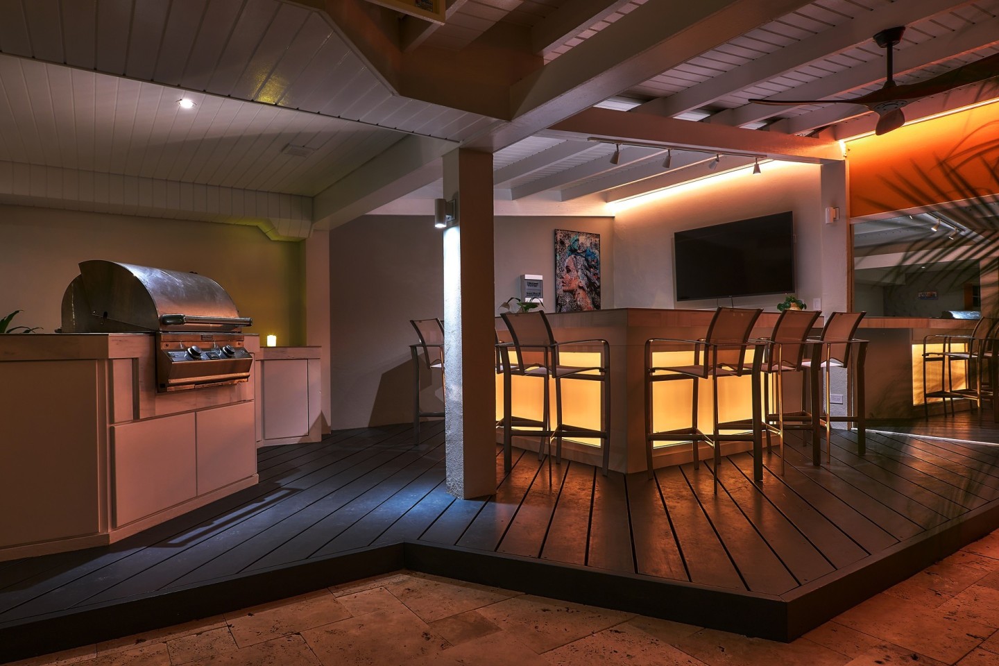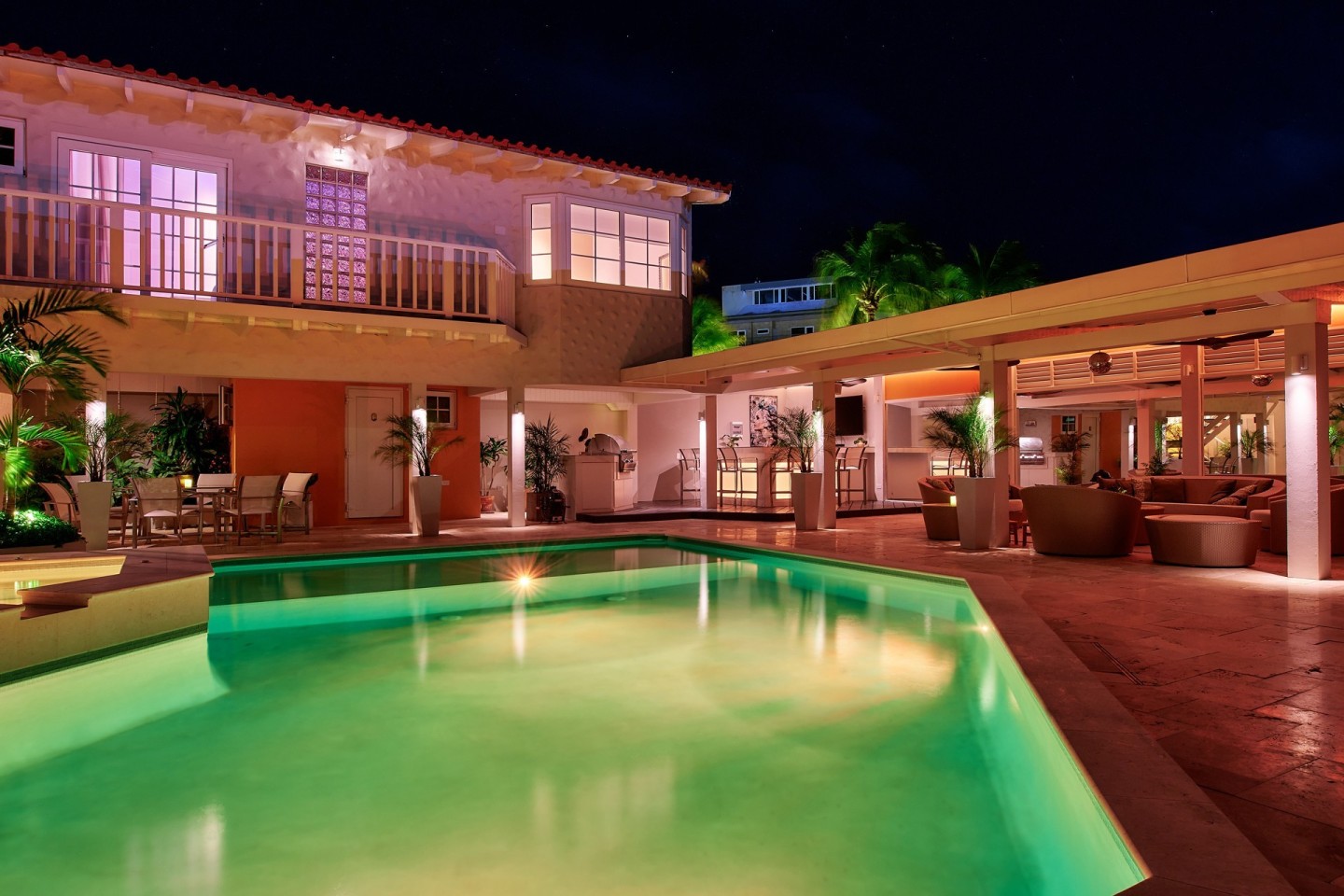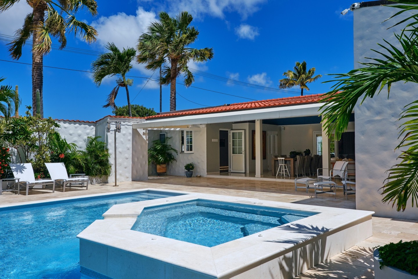 The master bedroom suite includes a massive walk-in closet, an en-suite bathroom with double-sink and walk-in shower, and access to the tropical garden. Two other sizeable guest bedrooms with built-in closets share the same bathroom. The outdoor area provides a sheltered patio, ideal for get-togethers and celebrations, including a large dining area and a cozy lounge area. Additionally, the newly set up pool with a heated Jacuzzi is encircled by lush tropical landscaping and travertine natural stone flooring, creating a personal paradise for rest and relaxation. There is also a bar, outdoor kitchen with marble tile, a full bathroom, and a Sonos wireless music system throughout the house. Also featured is an office with full bathroom that could be converted into a guest bedroom, as well as a second-floor studio apartment with access from the garden and pool area.
