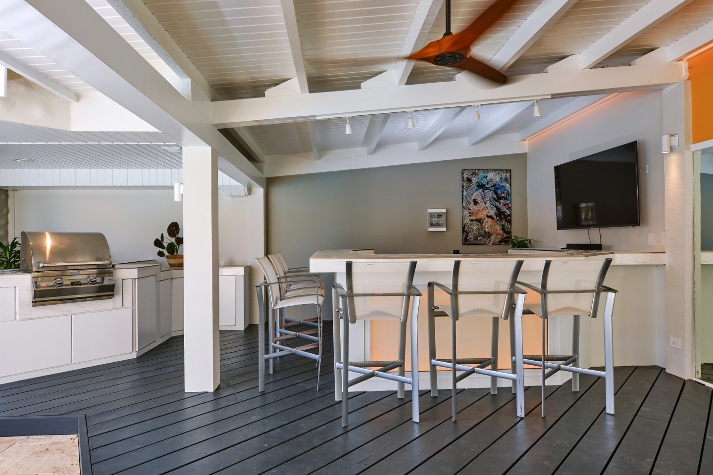 Step inside and uncover a stunningly renovated interior that has been refined to the highest level. The top-of-the-line European kitchen is a chef's paradise, featuring premium appliances and smooth finishes. The sizable living and dining areas are great for hosting guests, with ample space for relaxation and socializing. The living room is designed to open up to two sides, revealing a vast porch and pool area on one end, and an enclosed tropical garden on the other. Classy cedar wood high ceilings further accentuate the interior of the living room and bedrooms, creating a magnificent ambiance.