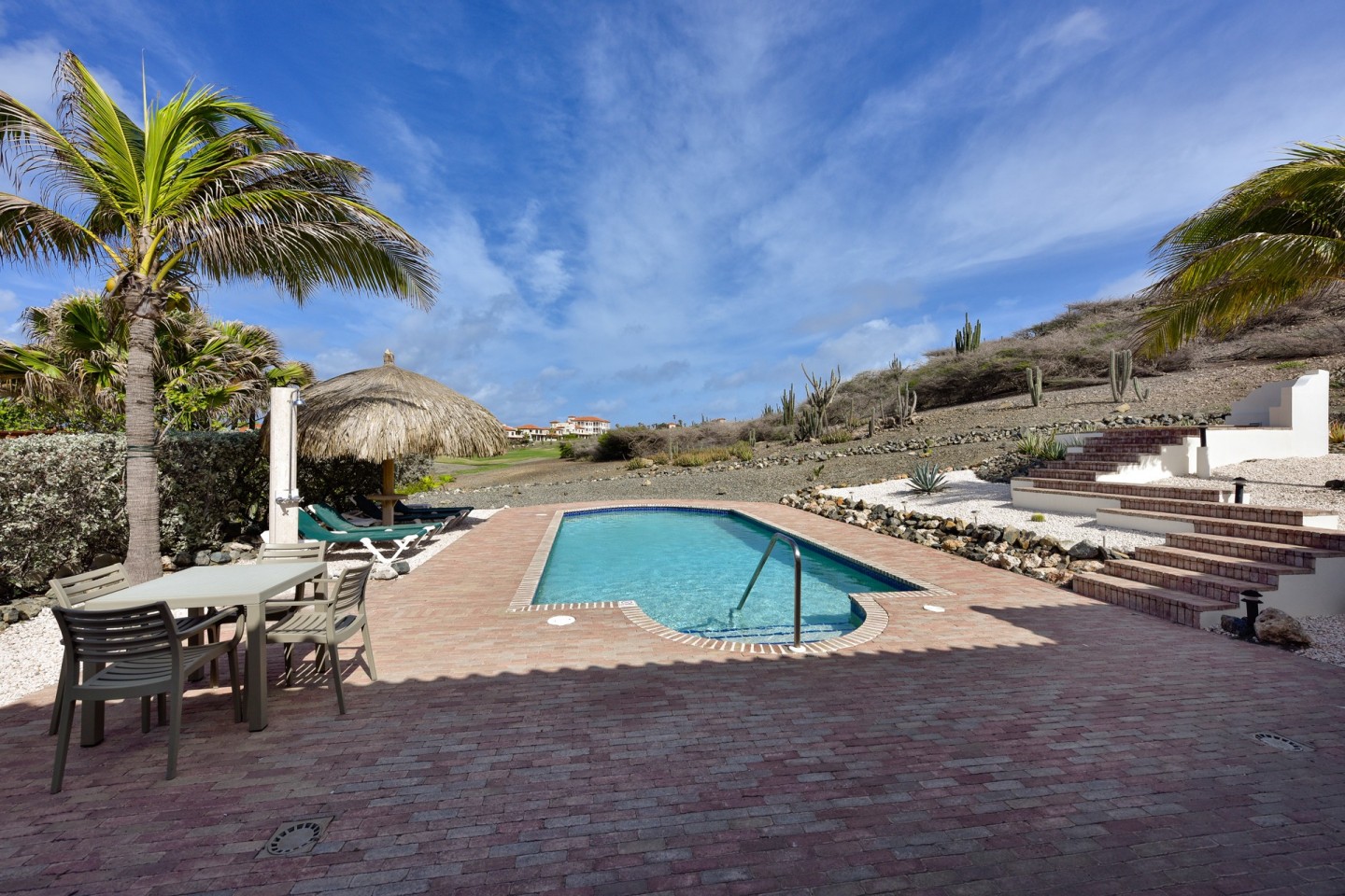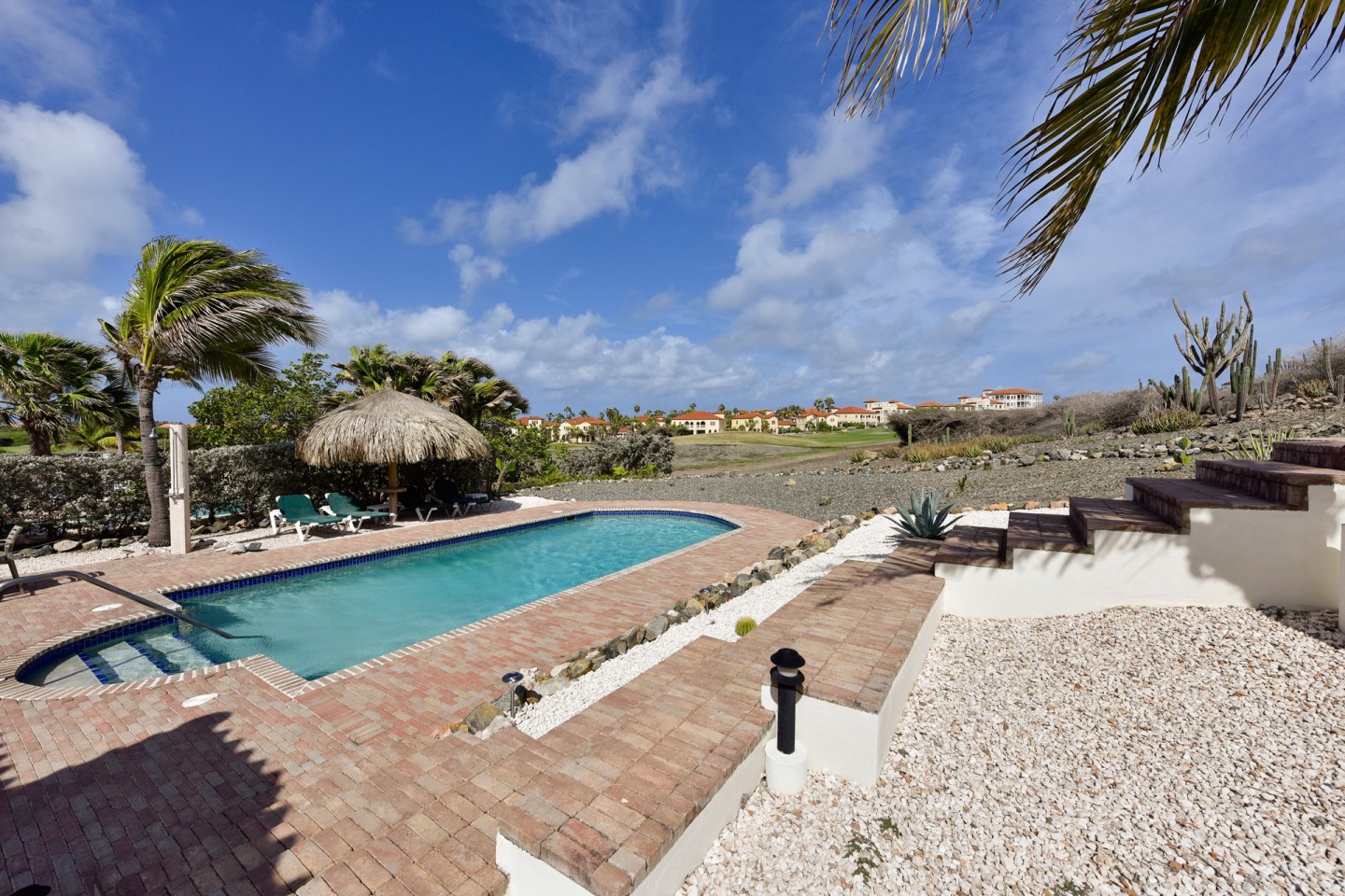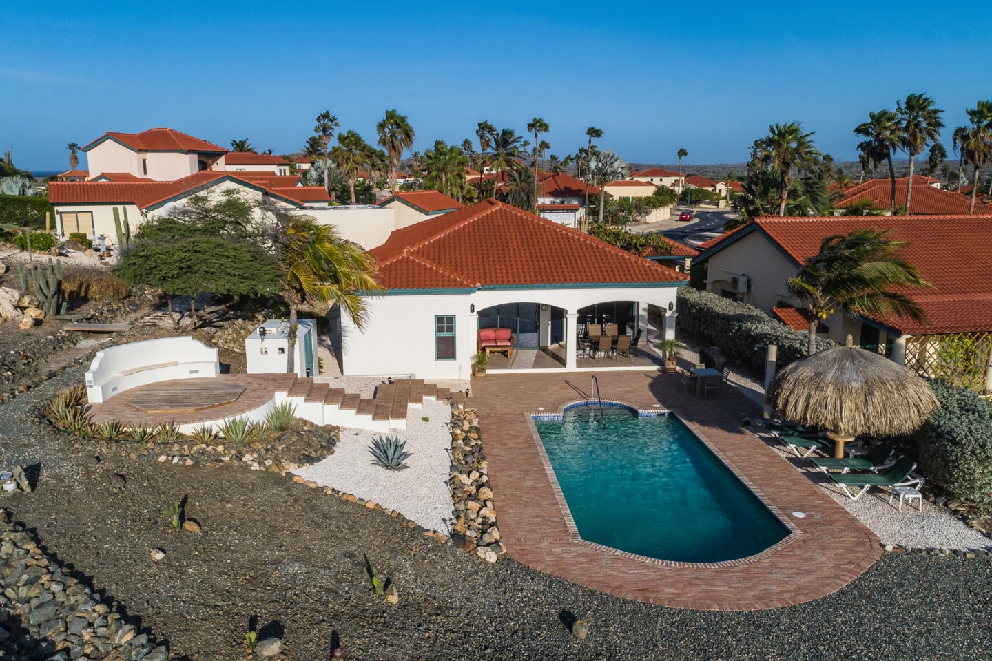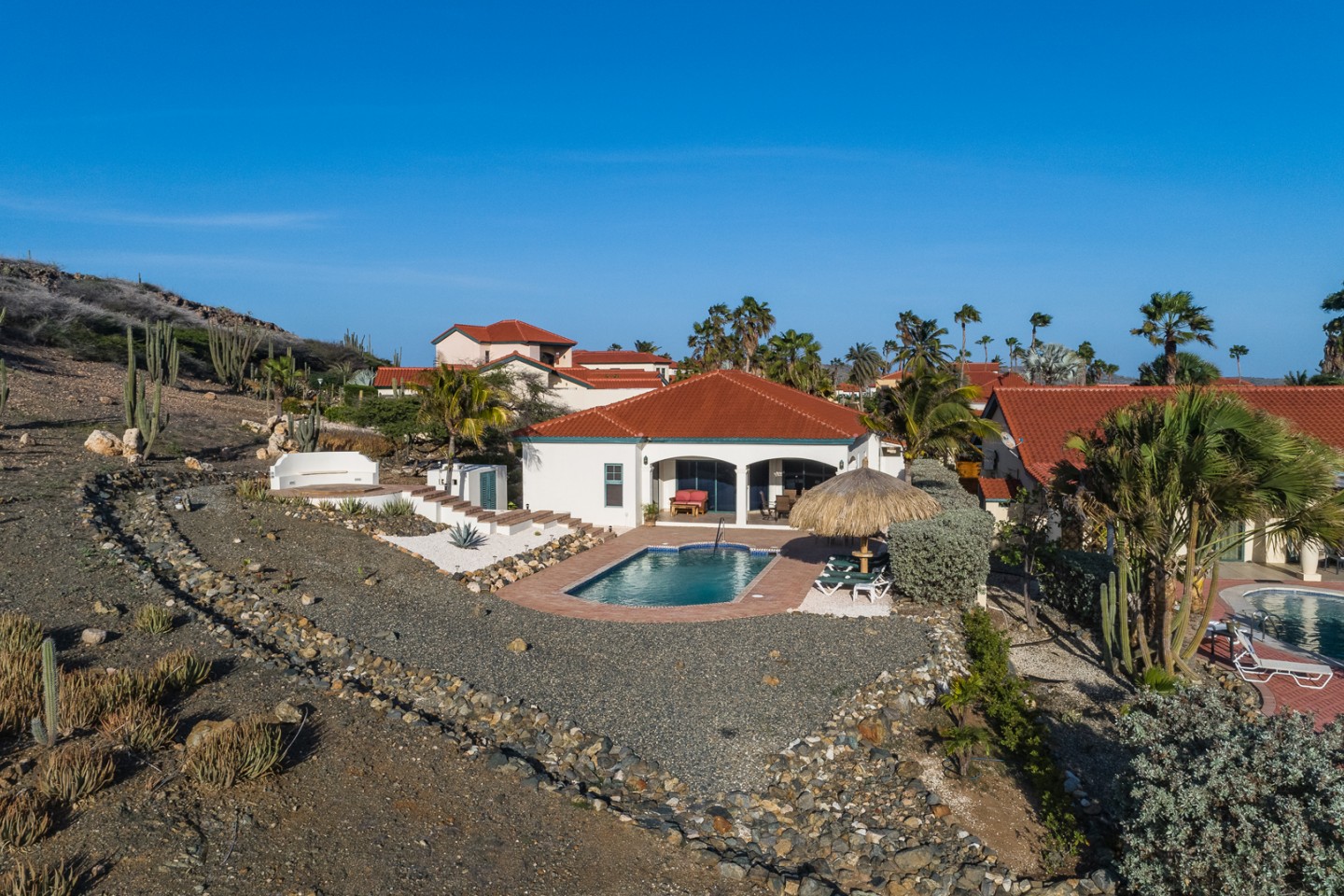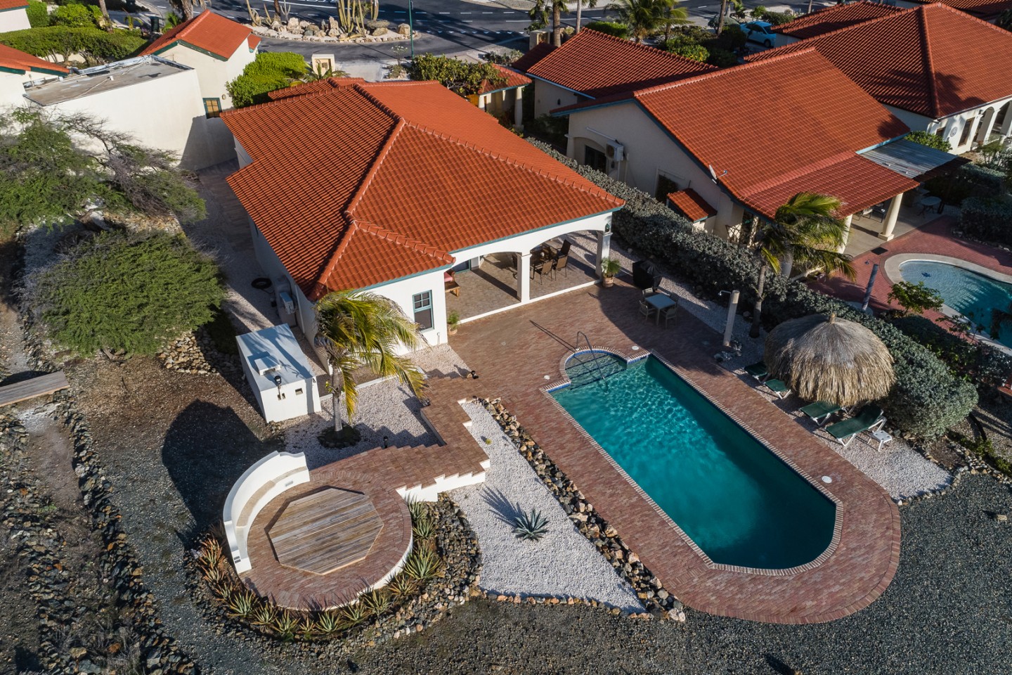 The master suite with access to the covered backyard offers a large bedroom , ensuite bathroom and a walk-in closet. The two other bedrooms are situated on the front side of the house and share one bathroom. The tropical backyard will be the place to relax during the day where the pool and spa awaits you. This villa is in excellent condition and will be sold completely furnished.