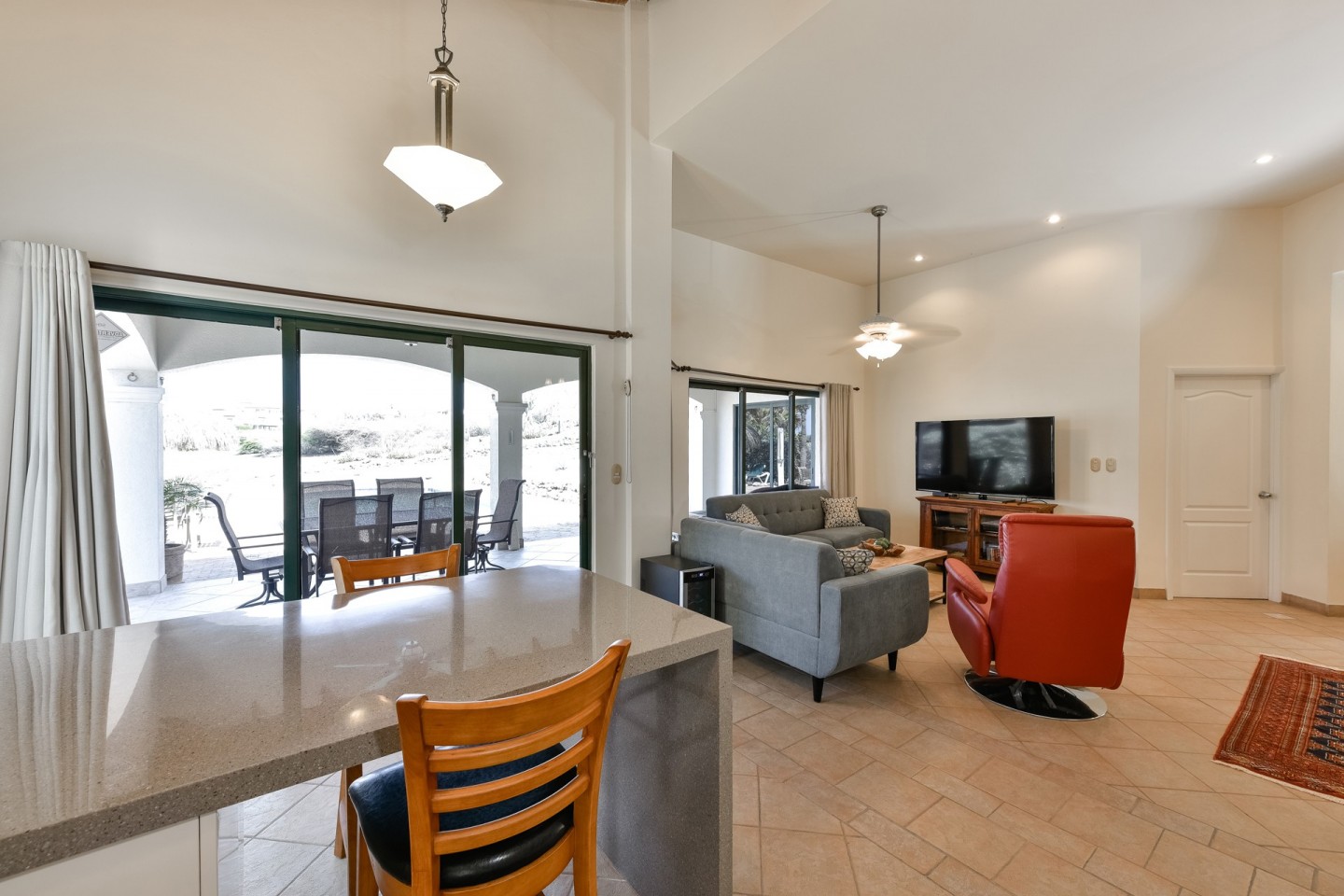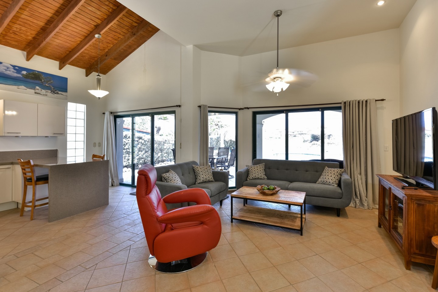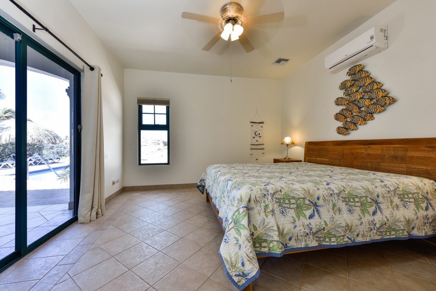 The main living space consists of an open concept living and dining area with large sliding doors with access to the pool area. The sliding doors and the windows are all equipped with heat-resistant glass. From the kitchen you have access to the garage that fits one car and also includes the laundry area.