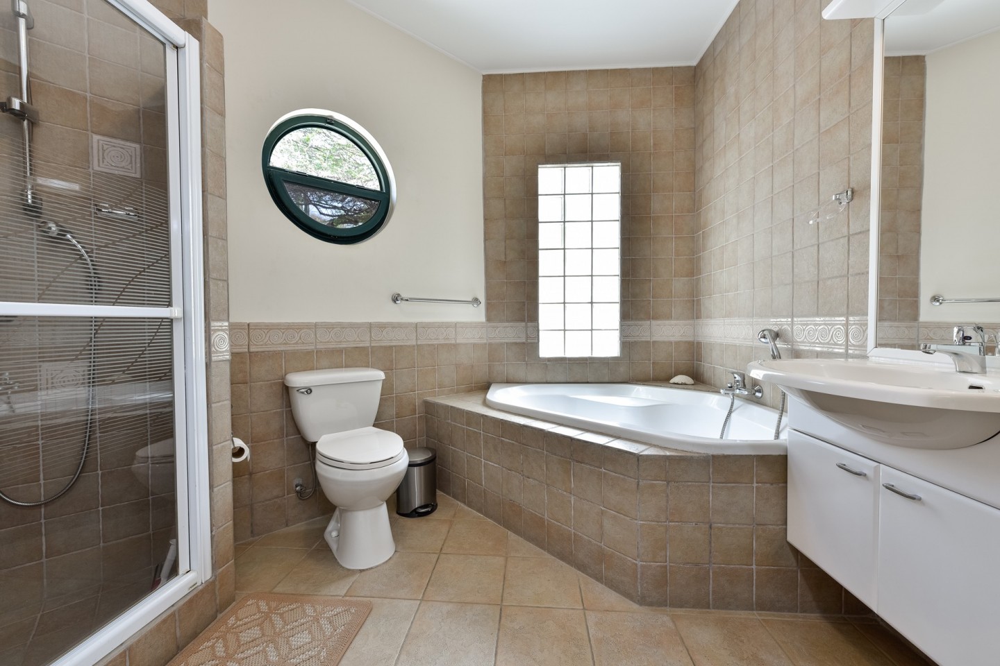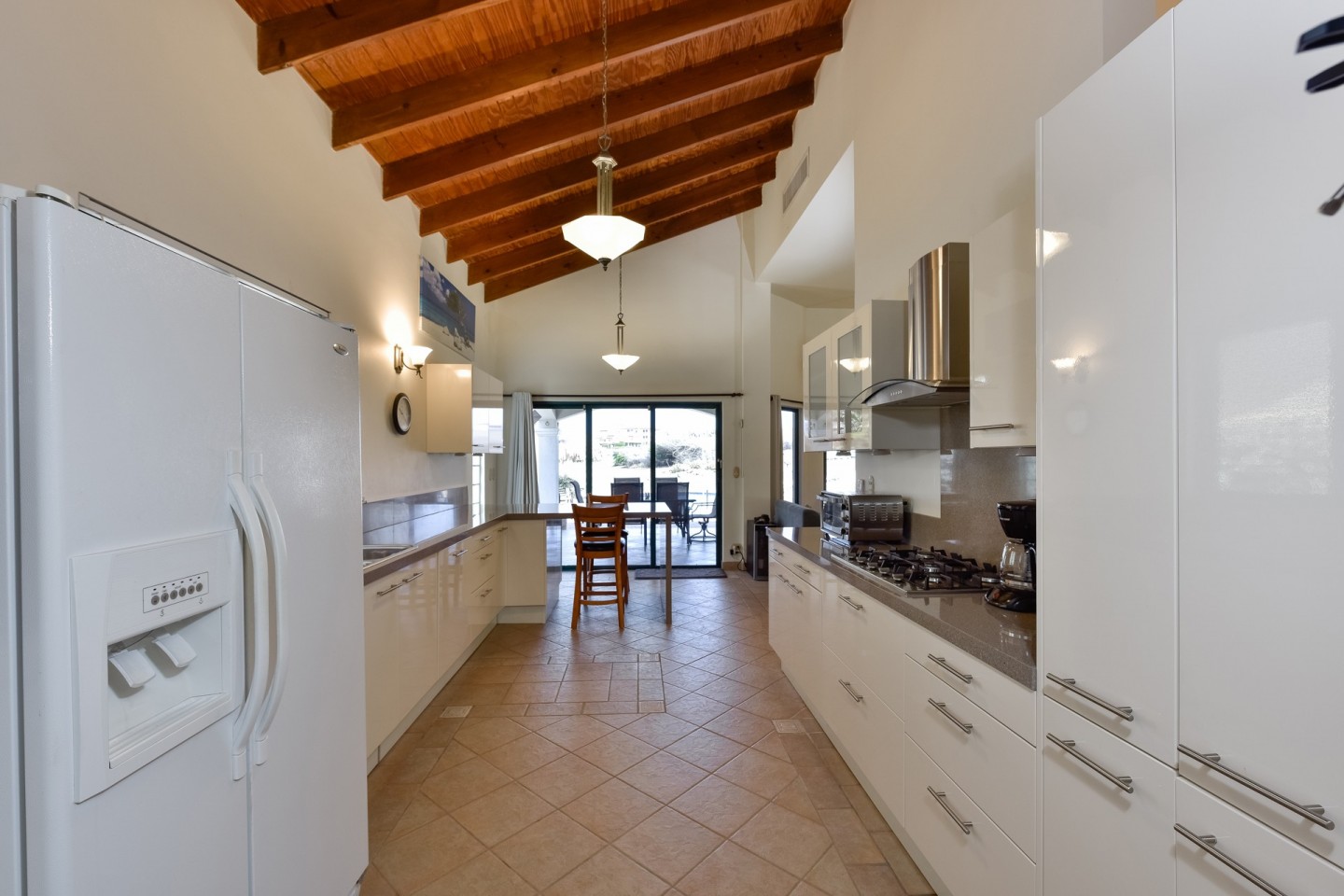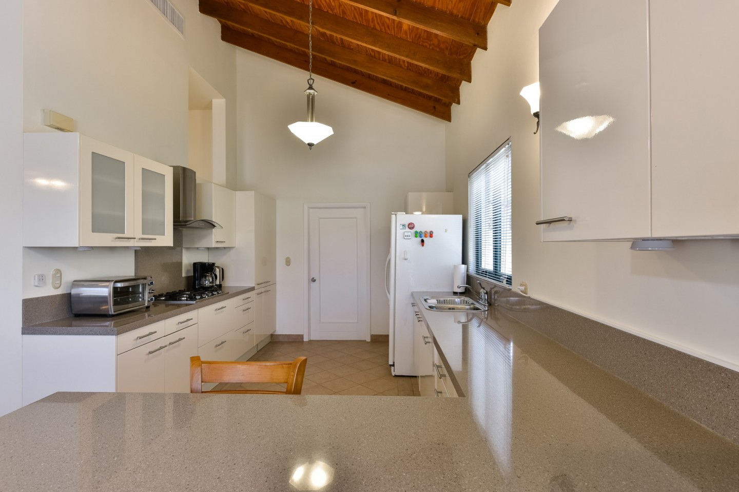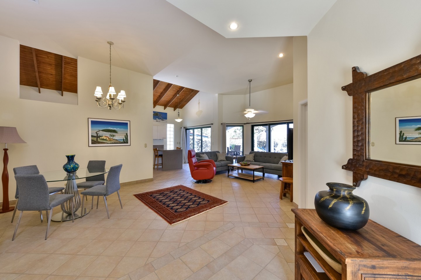 The main living space consists of an open concept living and dining area with large sliding doors with access to the pool area. The sliding doors and the windows are all equipped with heat-resistant glass. From the kitchen you have access to the garage that fits one car and also includes the laundry area.
