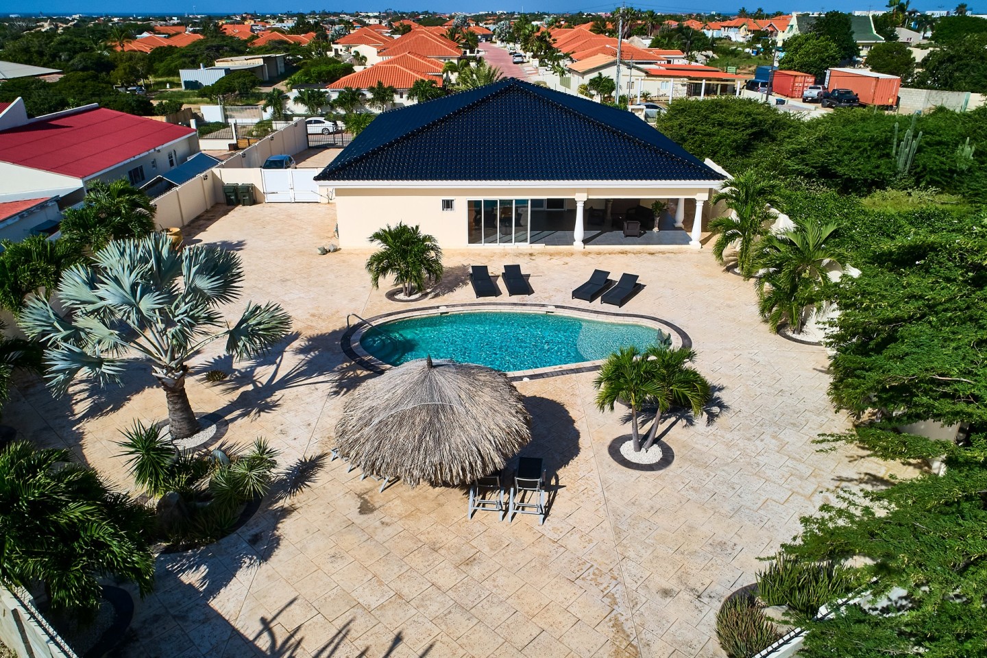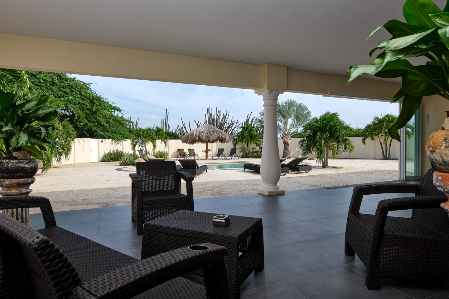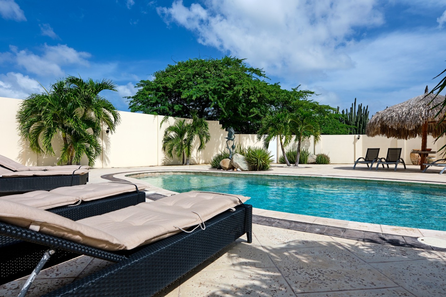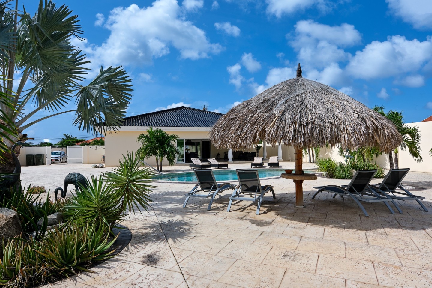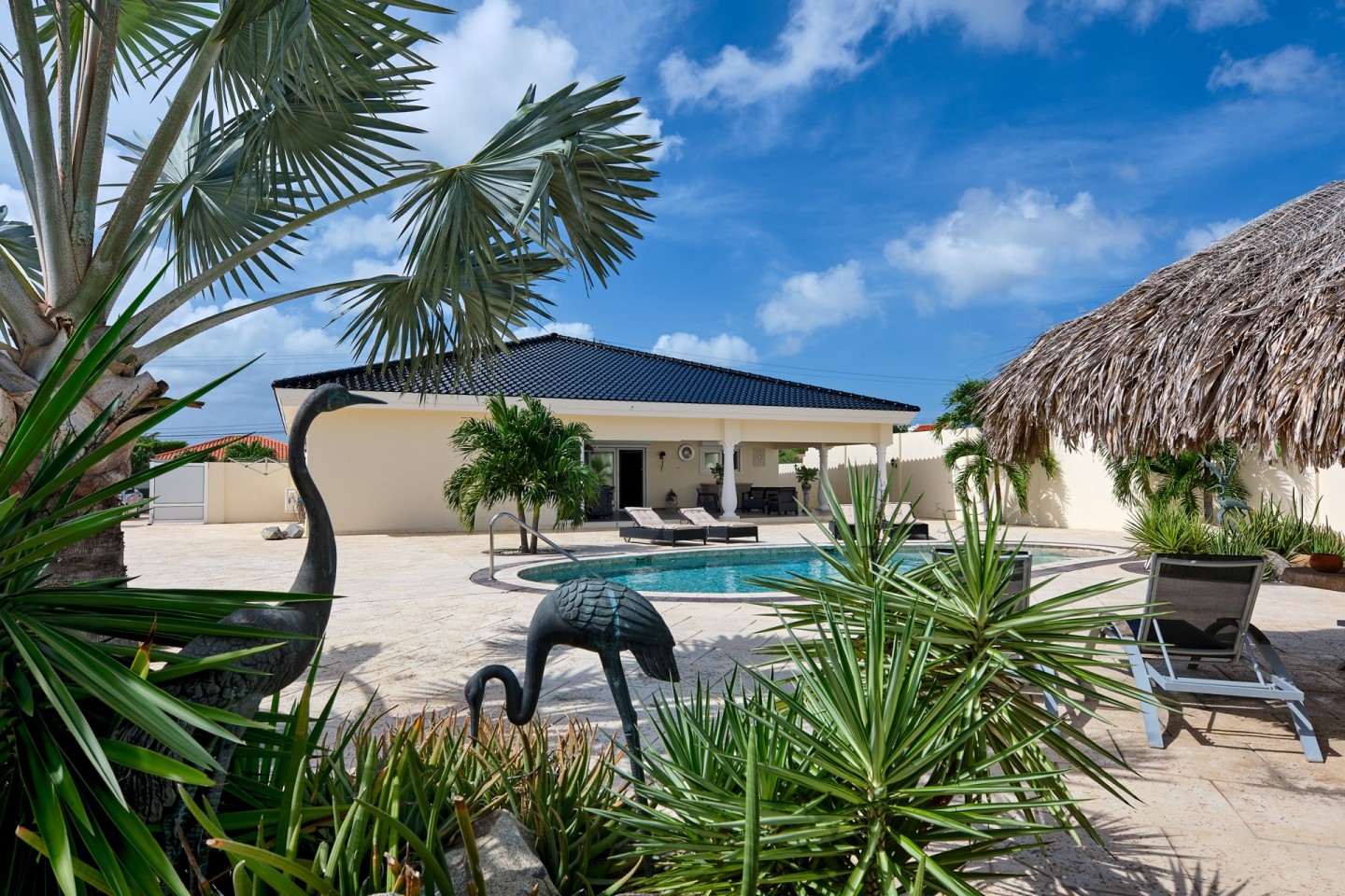 The grand covered back porch is literally an extension of the living/dining room. It is the perfect outdoor space where you can sit and enjoy the Aruban breeze and entertain friends and family while enjoying the backyard views. By lounging at the pool and the palapa and you will notice the tranquility and privacy the garden has to offer. The property comes fully furnished, fully airconditioned and provides ample parking space.