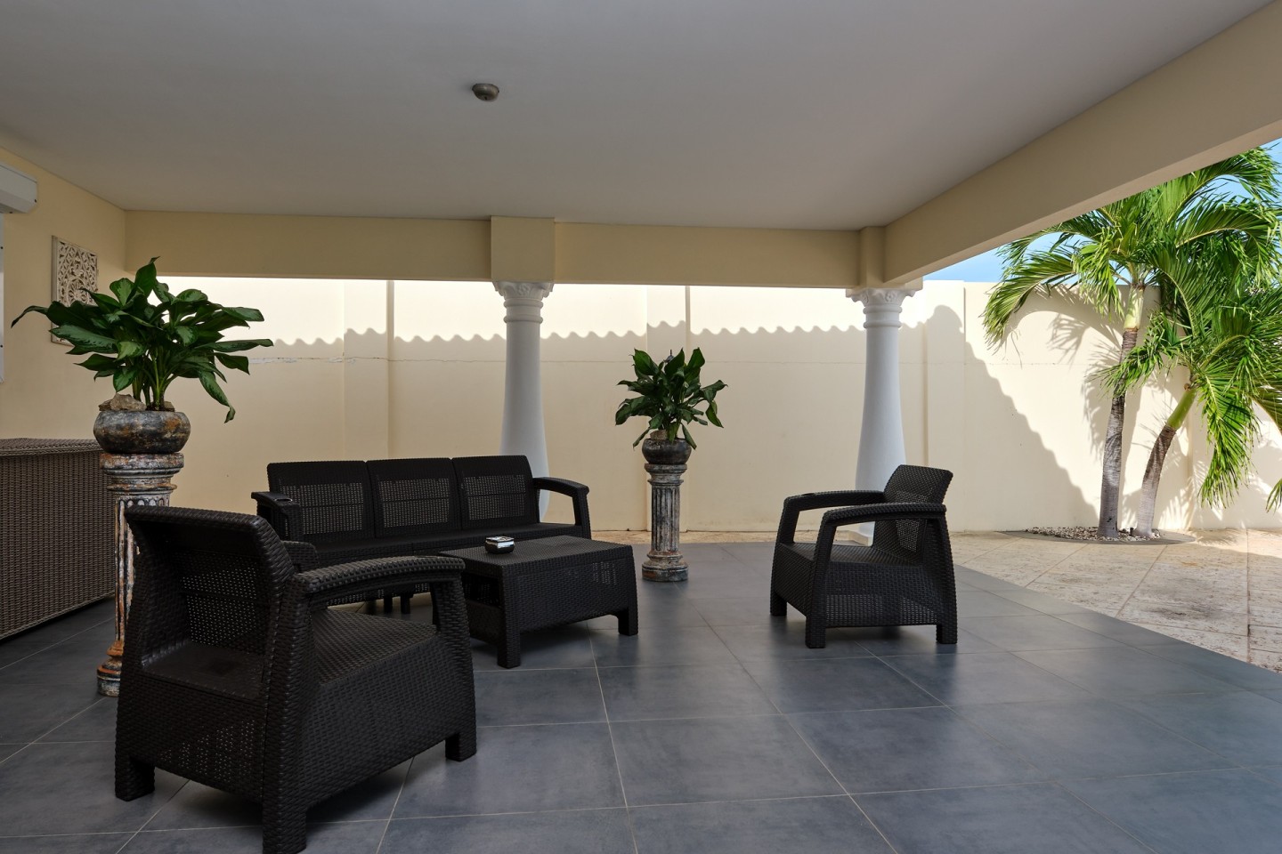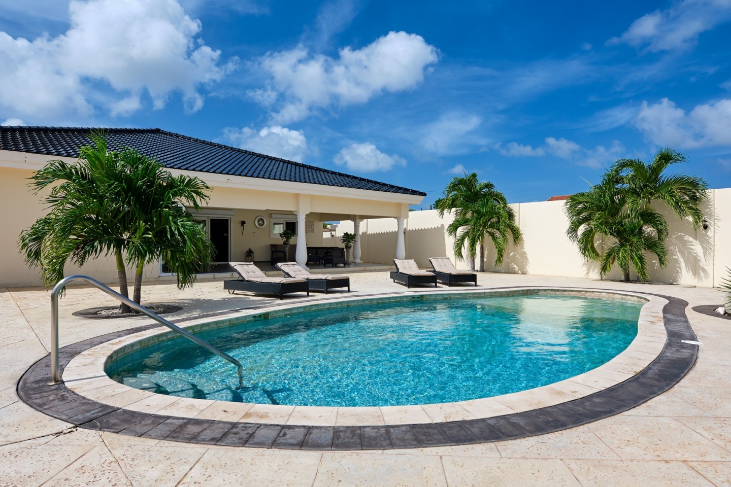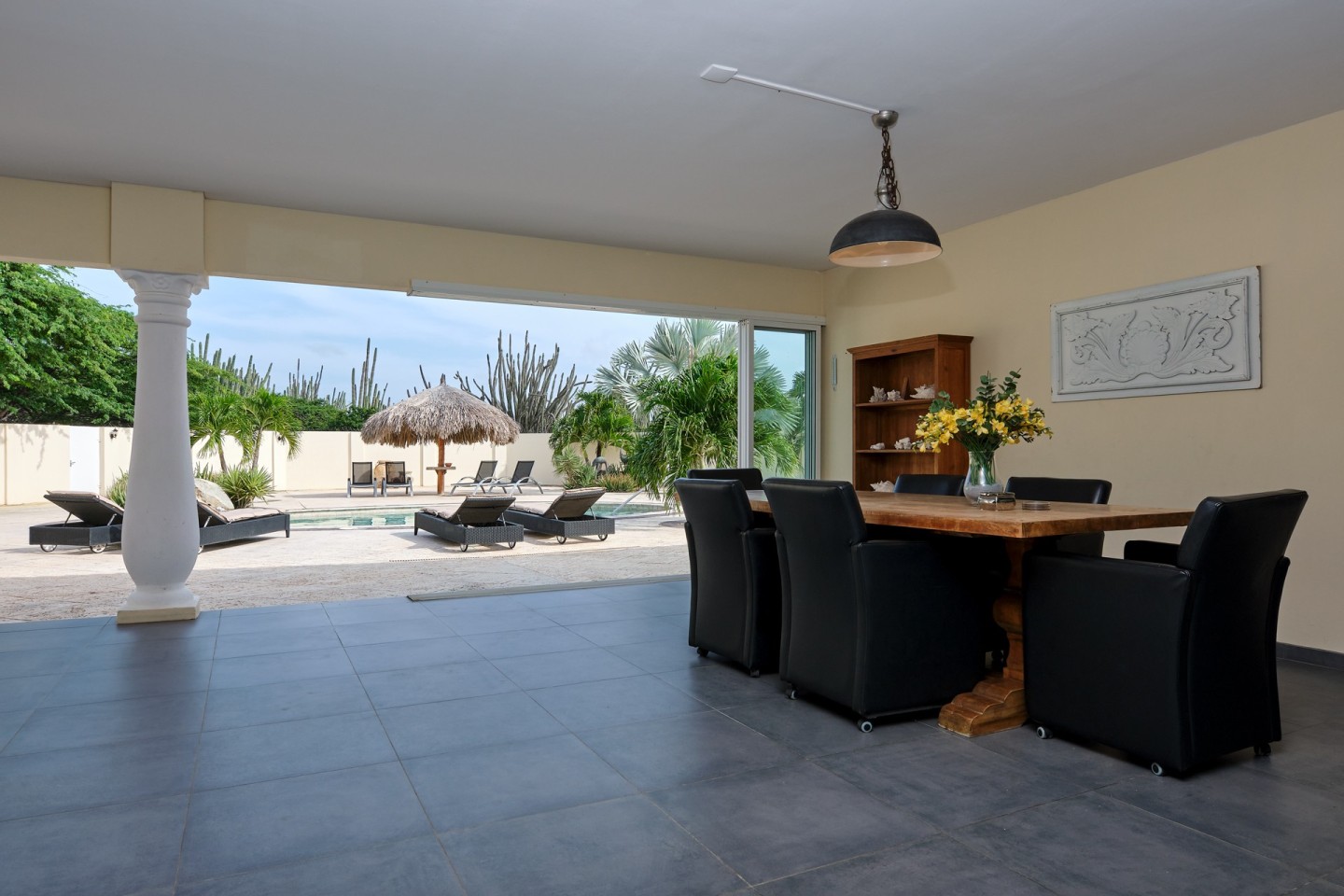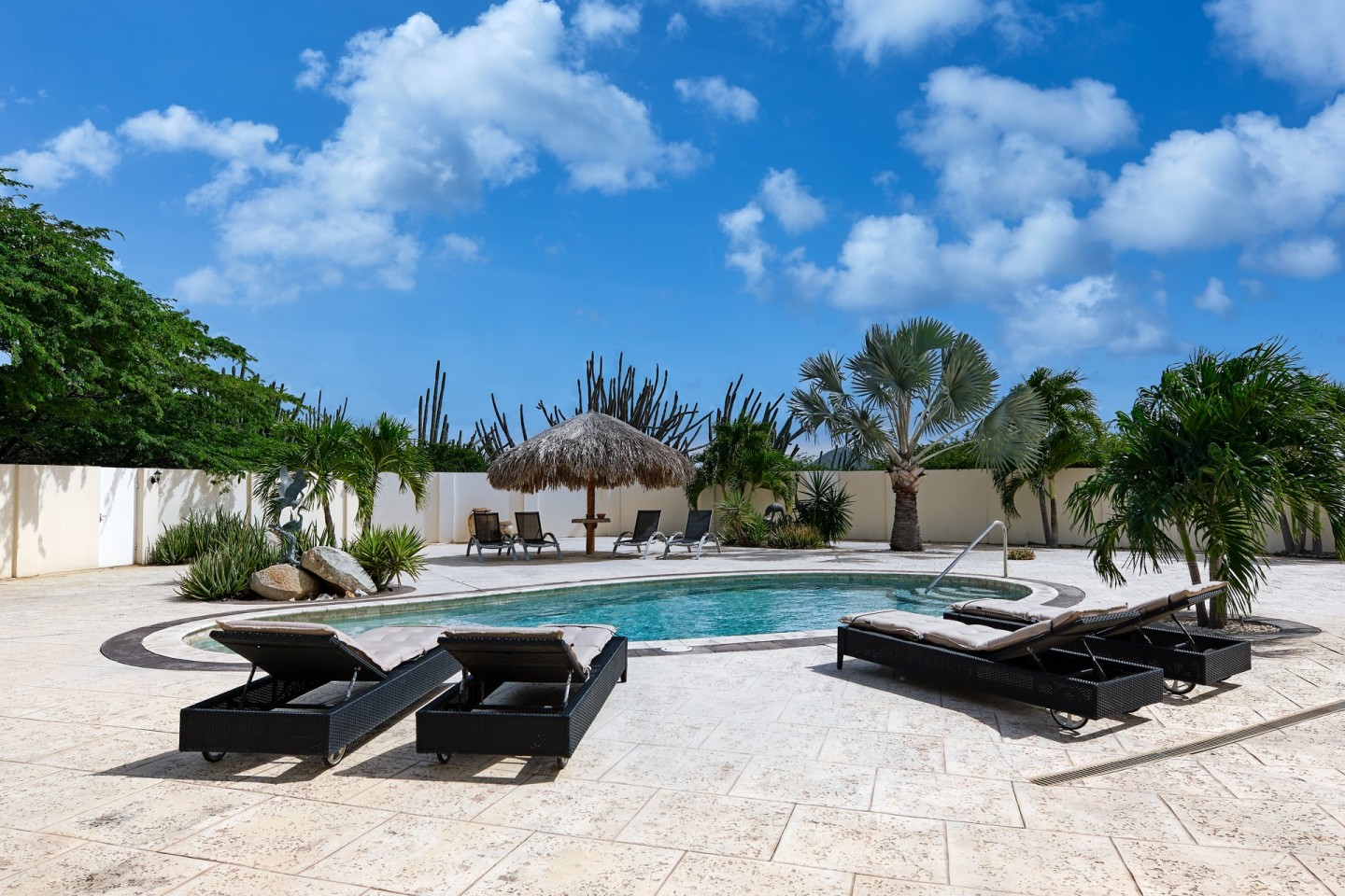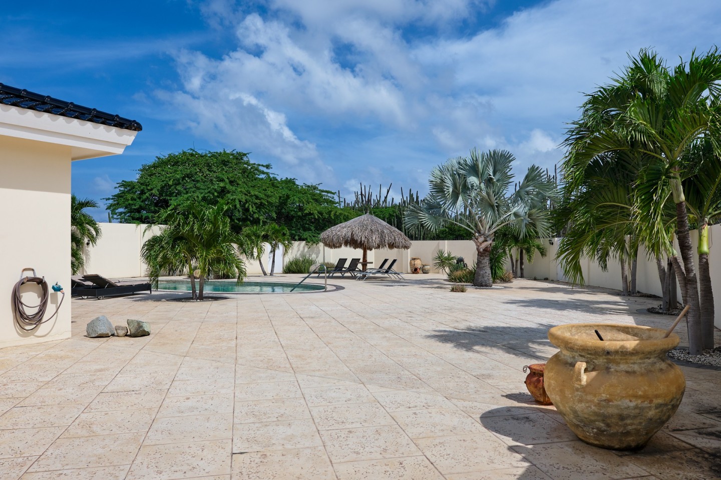 The grand covered back porch is literally an extension of the living/dining room. It is the perfect outdoor space where you can sit and enjoy the Aruban breeze and entertain friends and family while enjoying the backyard views. By lounging at the pool and the palapa and you will notice the tranquility and privacy the garden has to offer. The property comes fully furnished, fully airconditioned and provides ample parking space.