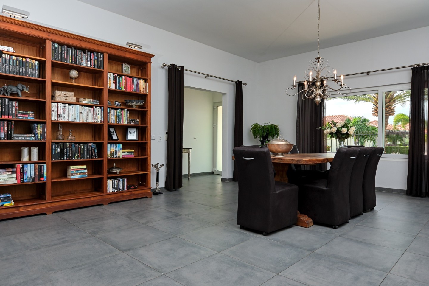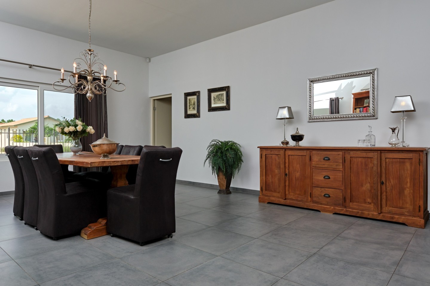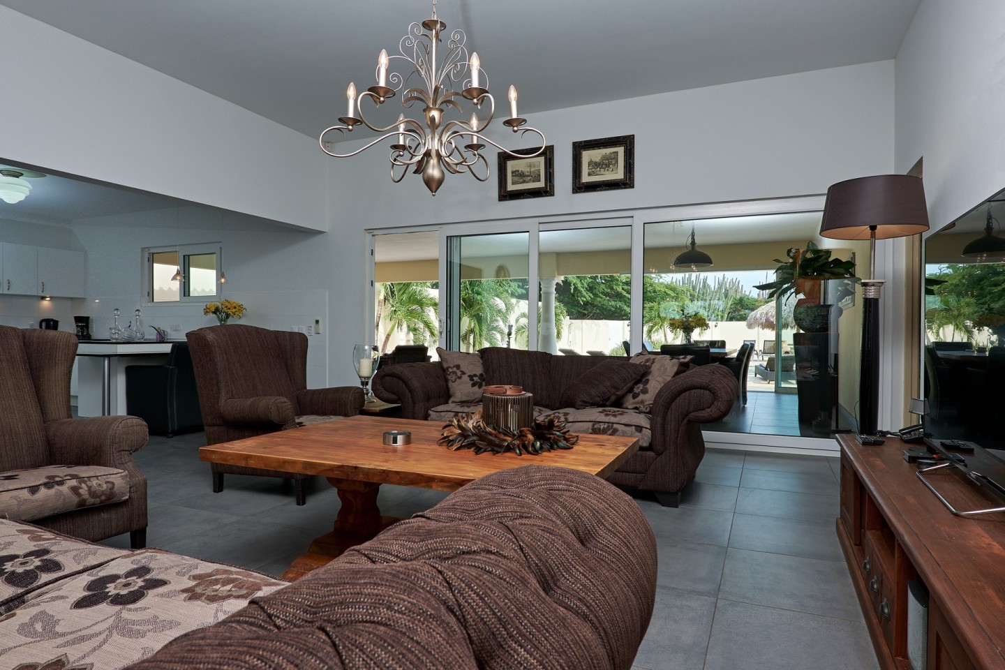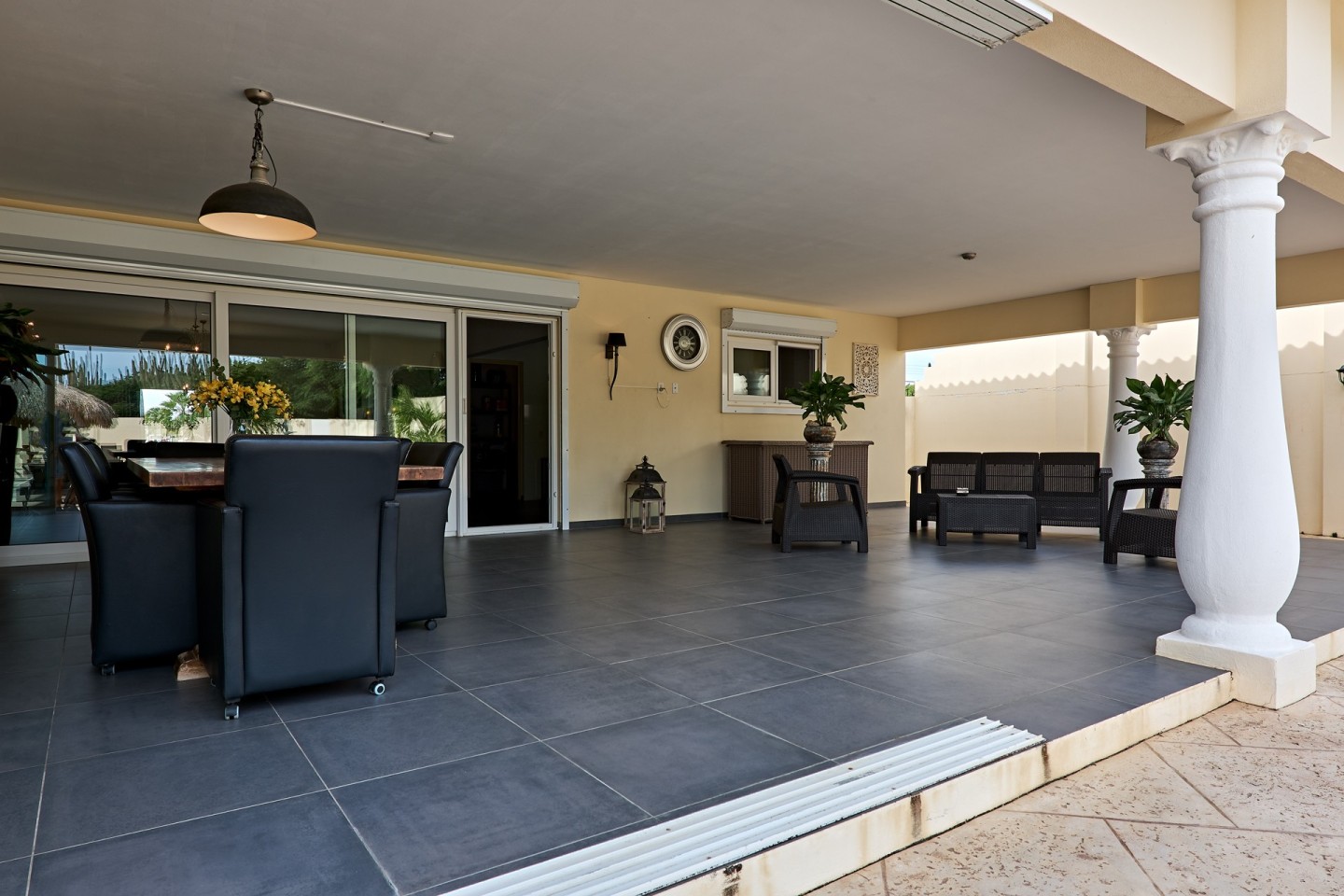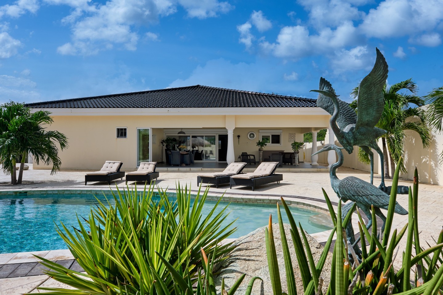 The grand covered back porch is literally an extension of the living/dining room. It is the perfect outdoor space where you can sit and enjoy the Aruban breeze and entertain friends and family while enjoying the backyard views. By lounging at the pool and the palapa and you will notice the tranquility and privacy the garden has to offer. The property comes fully furnished, fully airconditioned and provides ample parking space.