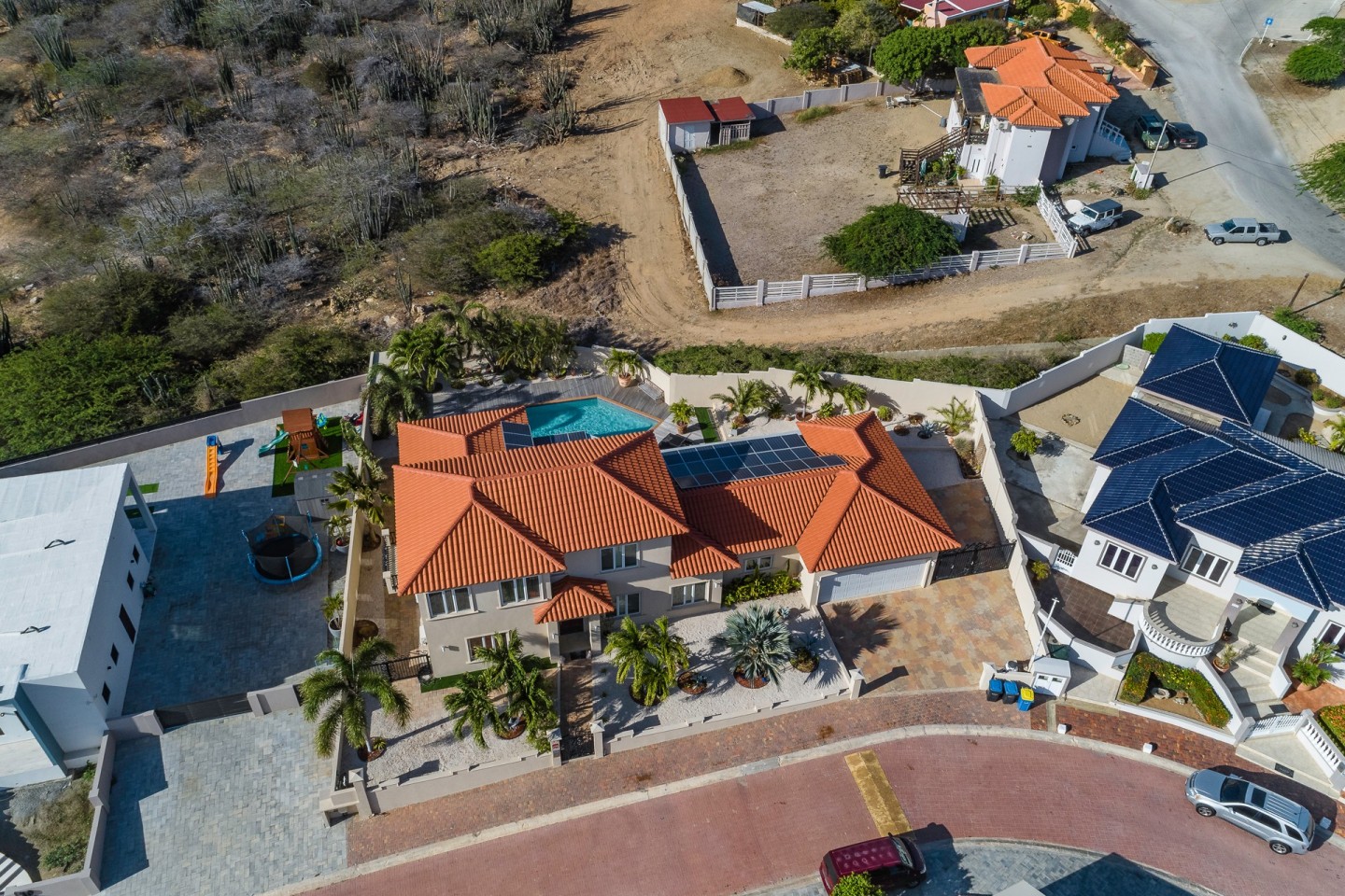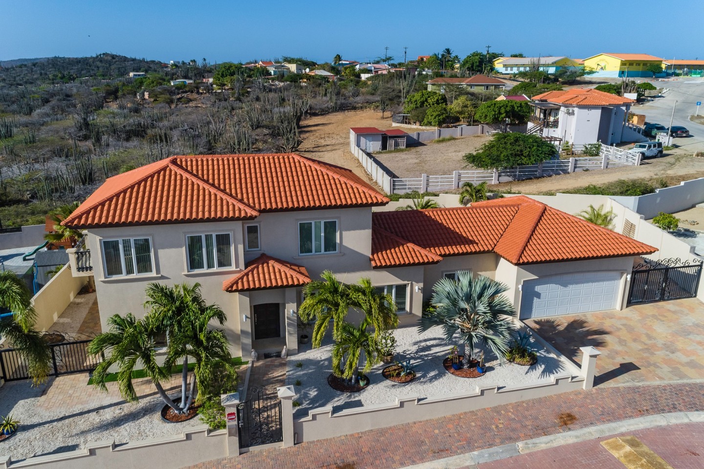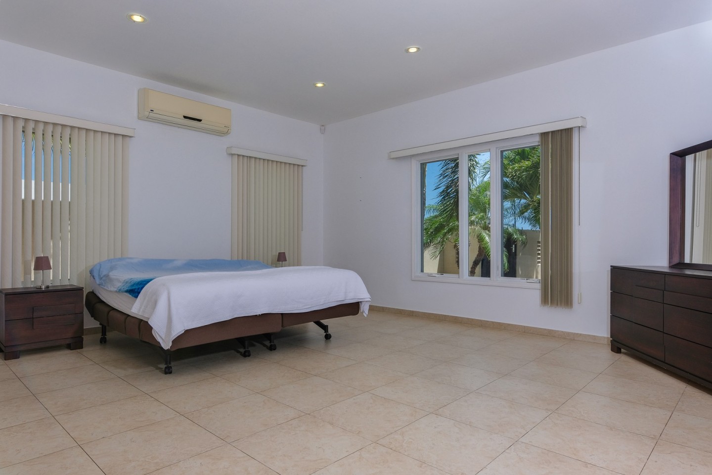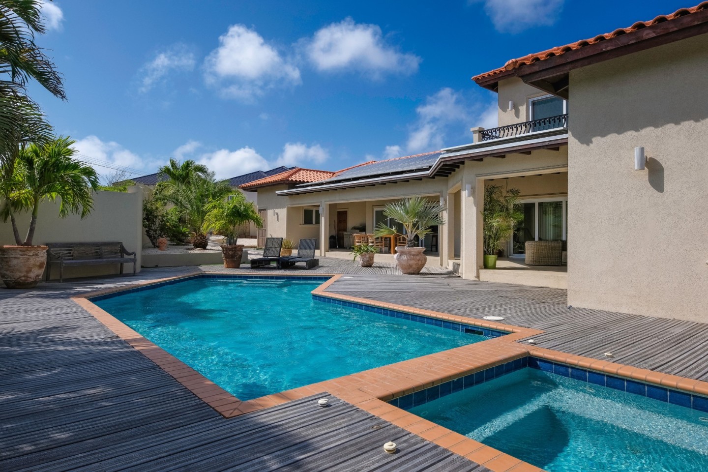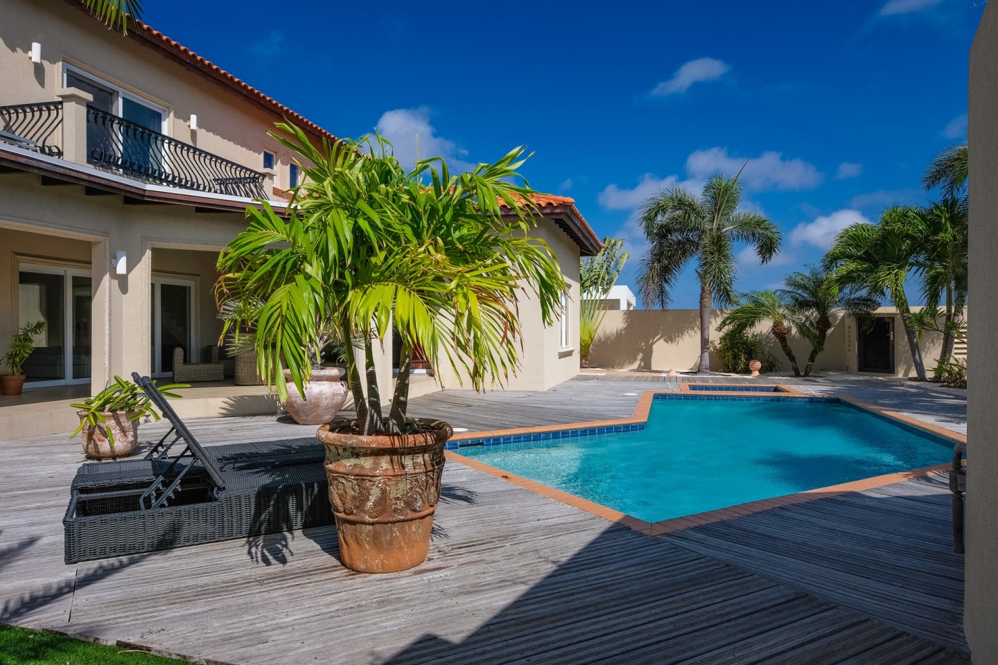 The meticulously landscaped, spacious garden boasts a spacious swimming pool and hot tub with a wooden deck and a covered terrace – a perfect place to relax in the sun or shade while enjoying the refreshing Aruba breeze. The ground floor includes two bedrooms. The master bedroom overlooking the pool has a private walk-in closet and an ensuite bathroom, a double sink, and a spacious shower. The second bedroom also has its bathroom and walk-in closet. The second floor offers two generously sized bedrooms, each with its walk-in closet and en-suite bathroom. One of the bathrooms even has a double shower. Both bedrooms offer breathtaking island views.