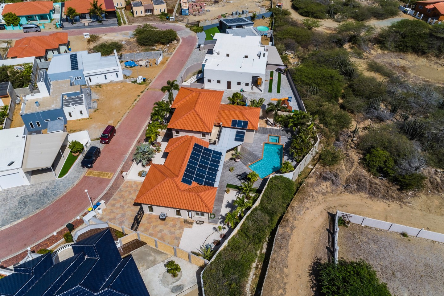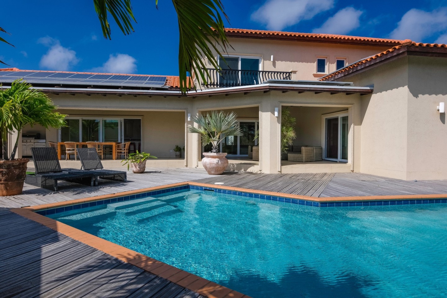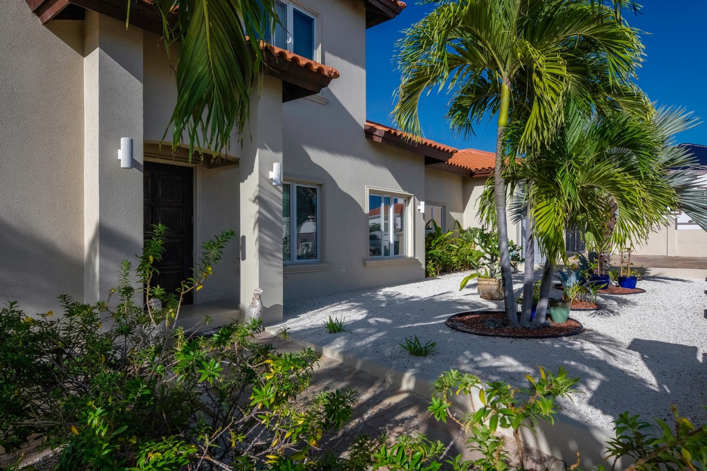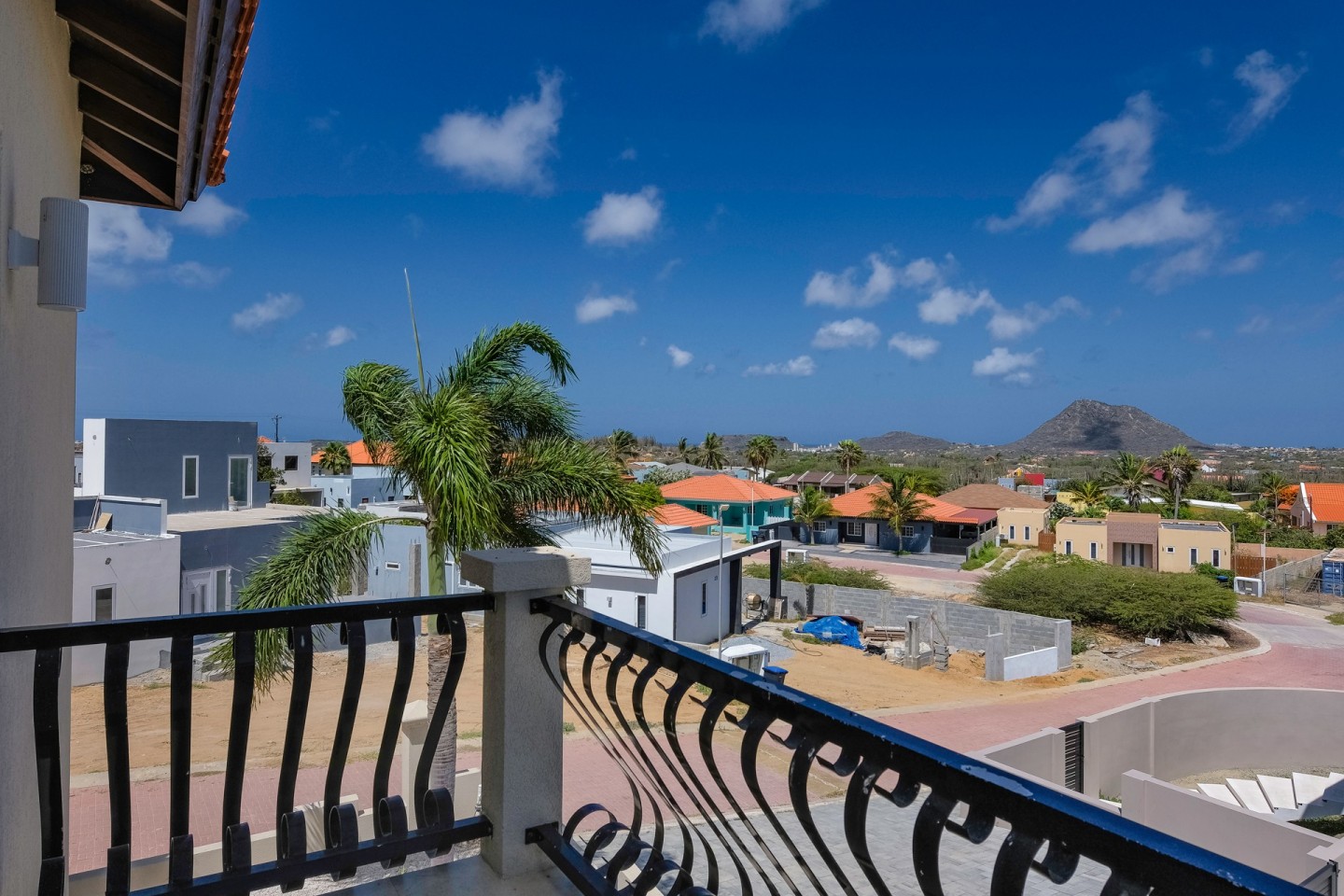 The meticulously landscaped, spacious garden boasts a spacious swimming pool and hot tub with a wooden deck and a covered terrace – a perfect place to relax in the sun or shade while enjoying the refreshing Aruba breeze. The ground floor includes two bedrooms. The master bedroom overlooking the pool has a private walk-in closet and an ensuite bathroom, a double sink, and a spacious shower. The second bedroom also has its bathroom and walk-in closet. The second floor offers two generously sized bedrooms, each with its walk-in closet and en-suite bathroom. One of the bathrooms even has a double shower. Both bedrooms offer breathtaking island views.