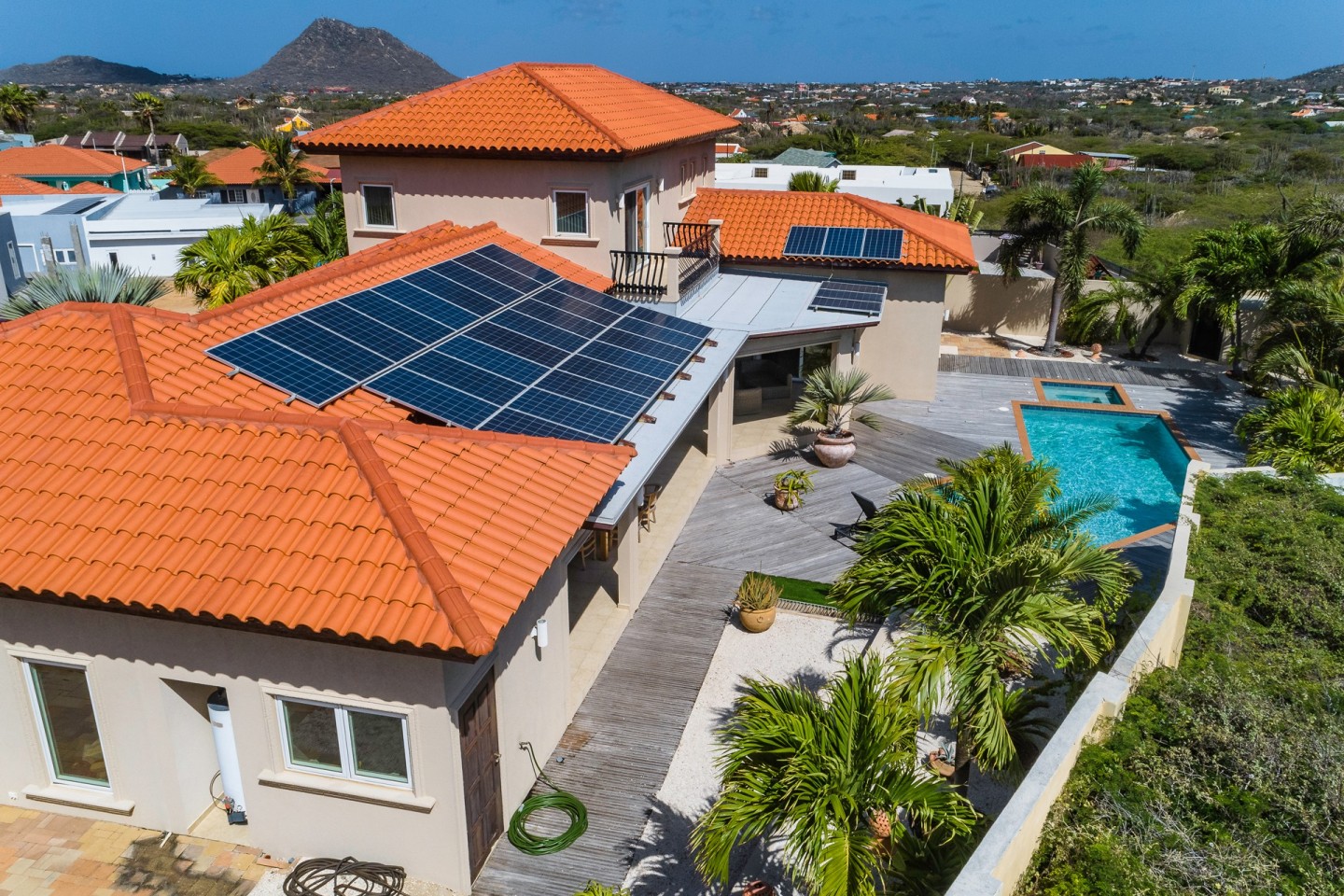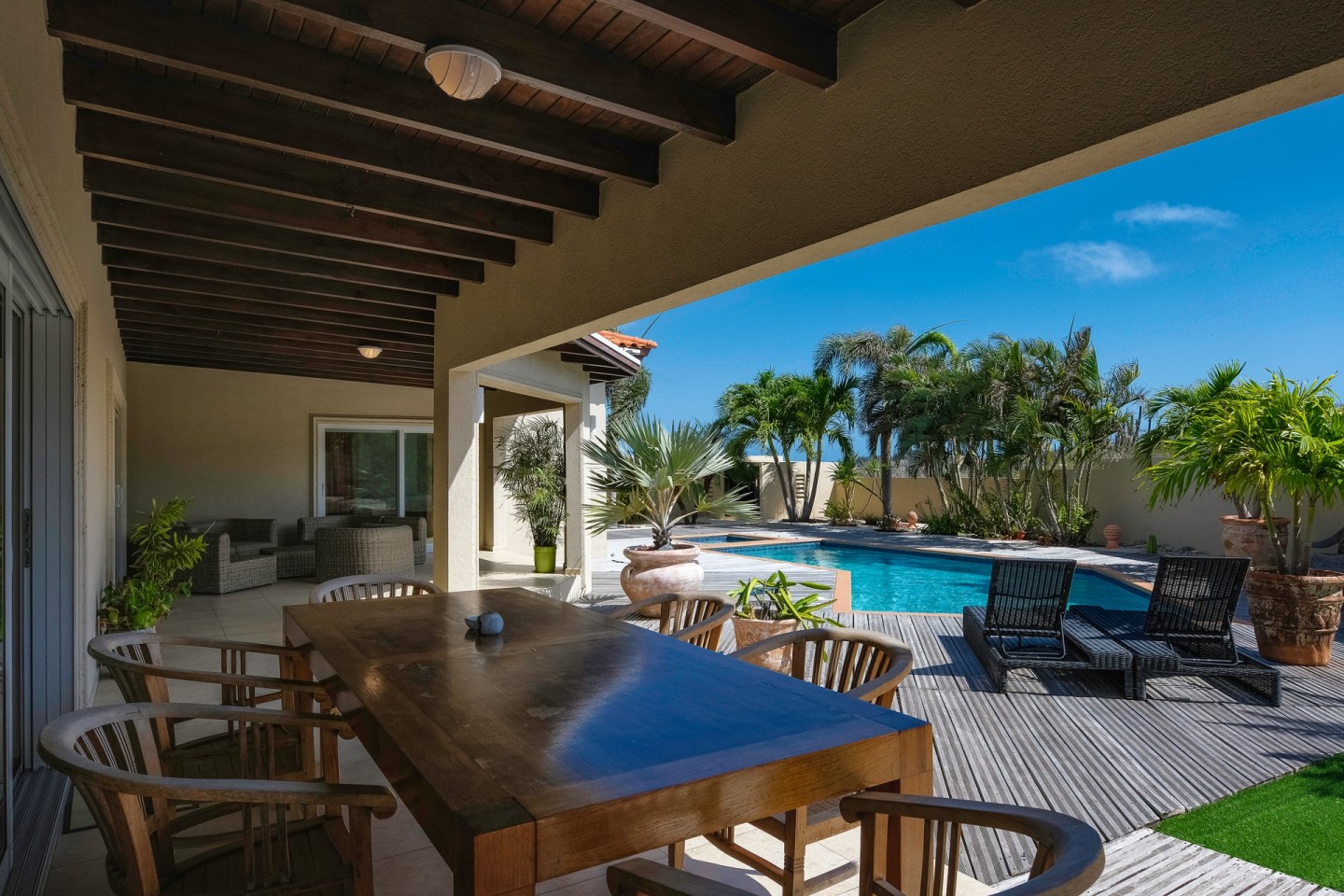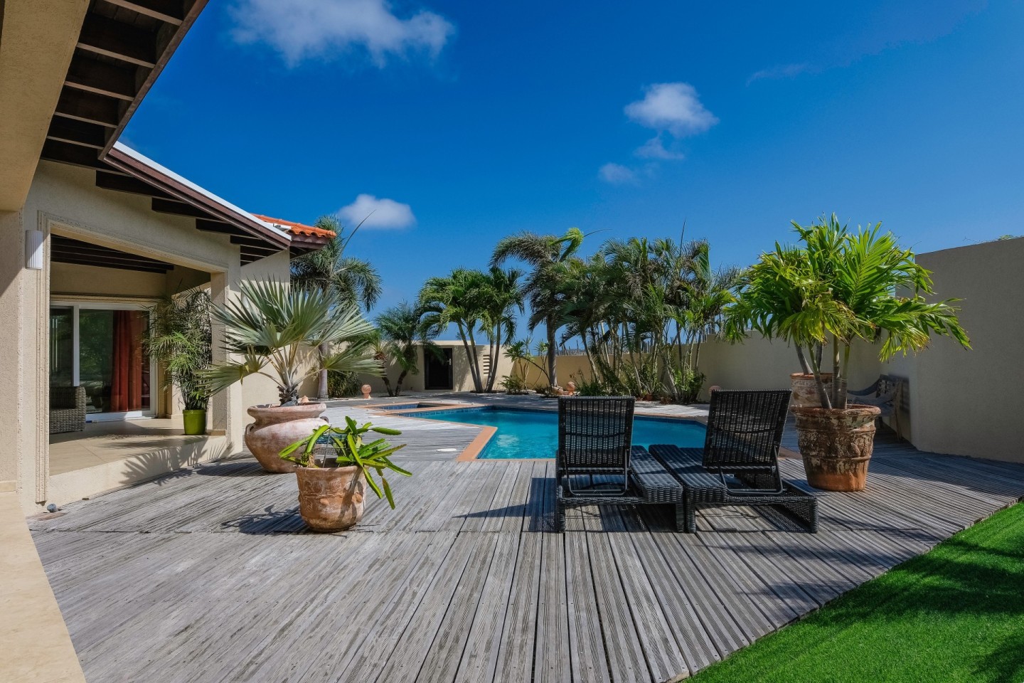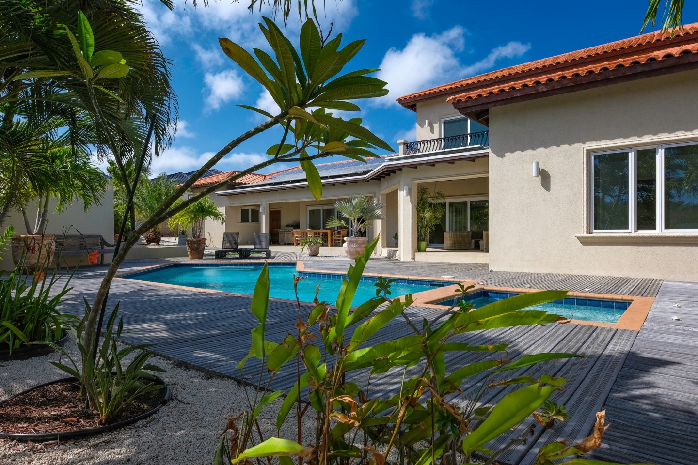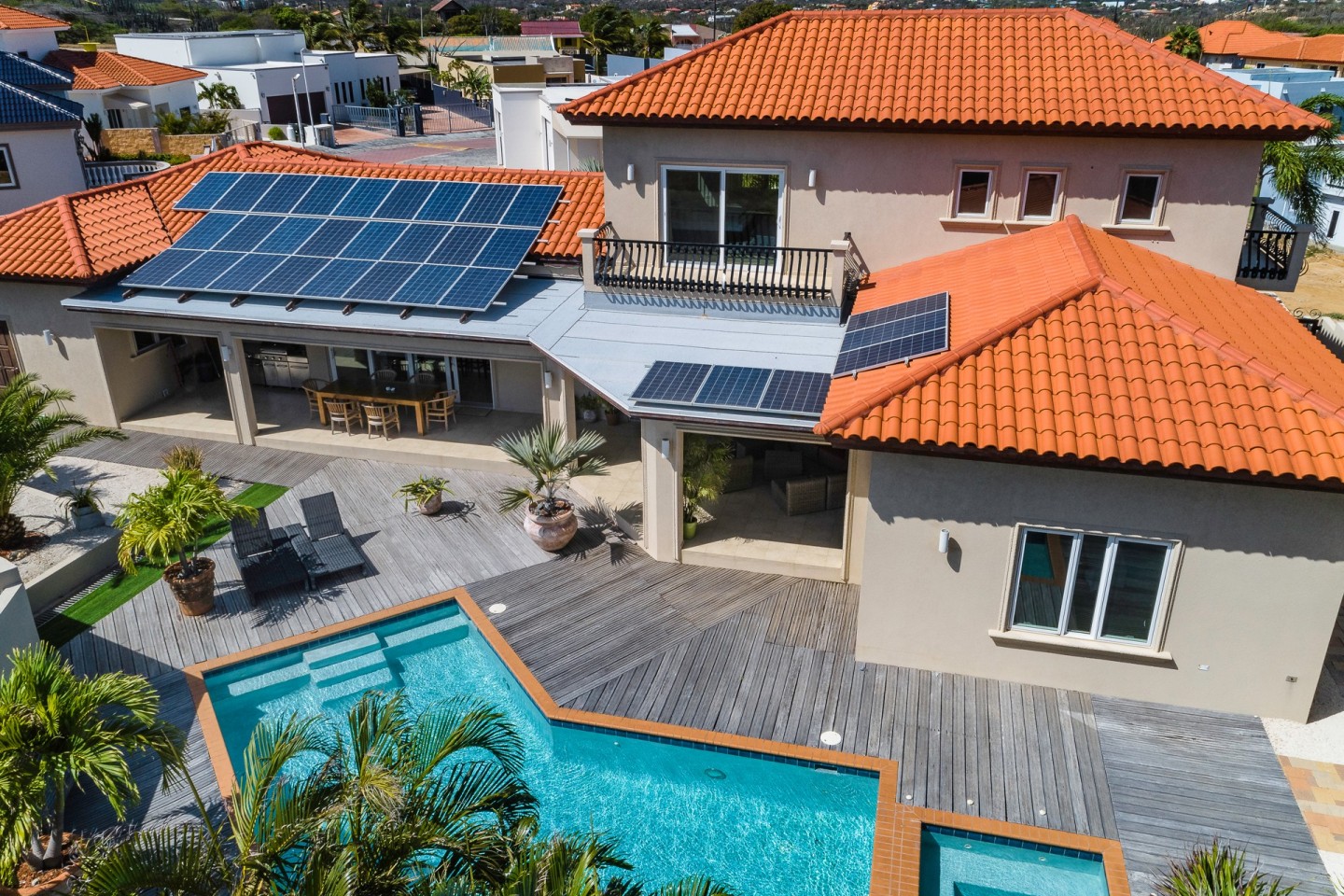 The meticulously landscaped, spacious garden boasts a spacious swimming pool and hot tub with a wooden deck and a covered terrace – a perfect place to relax in the sun or shade while enjoying the refreshing Aruba breeze. The ground floor includes two bedrooms. The master bedroom overlooking the pool has a private walk-in closet and an ensuite bathroom, a double sink, and a spacious shower. The second bedroom also has its bathroom and walk-in closet. The second floor offers two generously sized bedrooms, each with its walk-in closet and en-suite bathroom. One of the bathrooms even has a double shower. Both bedrooms offer breathtaking island views.