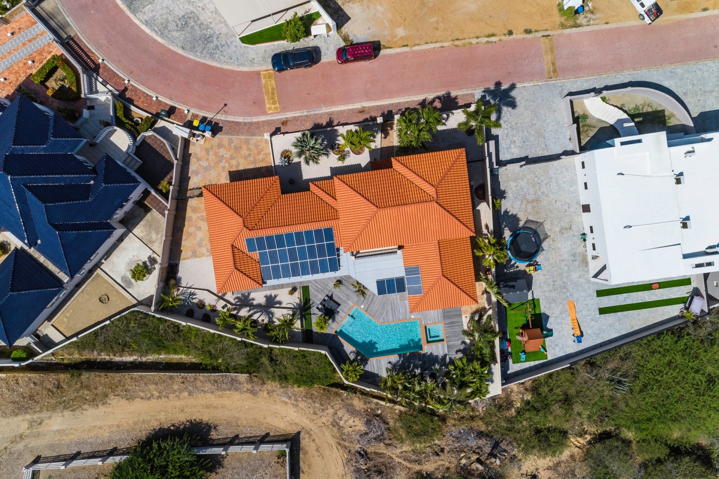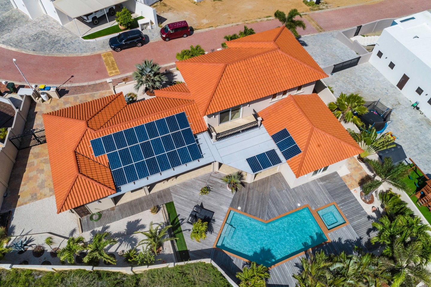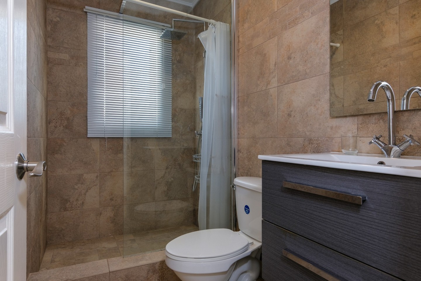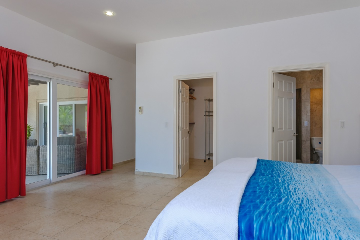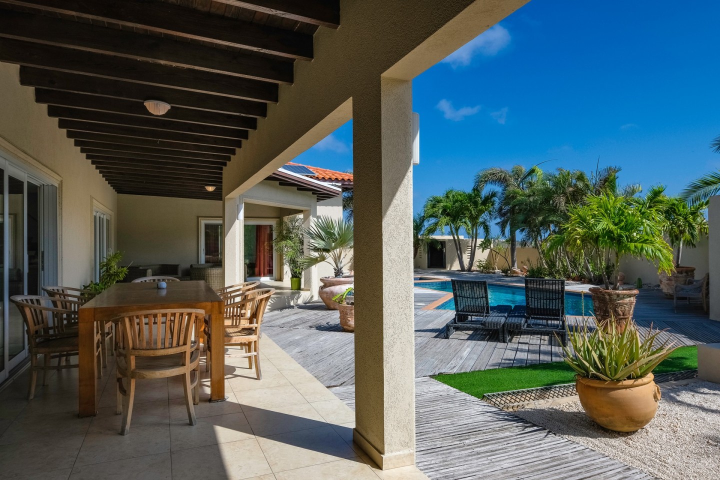 The meticulously landscaped, spacious garden boasts a spacious swimming pool and hot tub with a wooden deck and a covered terrace – a perfect place to relax in the sun or shade while enjoying the refreshing Aruba breeze. The ground floor includes two bedrooms. The master bedroom overlooking the pool has a private walk-in closet and an ensuite bathroom, a double sink, and a spacious shower. The second bedroom also has its bathroom and walk-in closet. The second floor offers two generously sized bedrooms, each with its walk-in closet and en-suite bathroom. One of the bathrooms even has a double shower. Both bedrooms offer breathtaking island views.