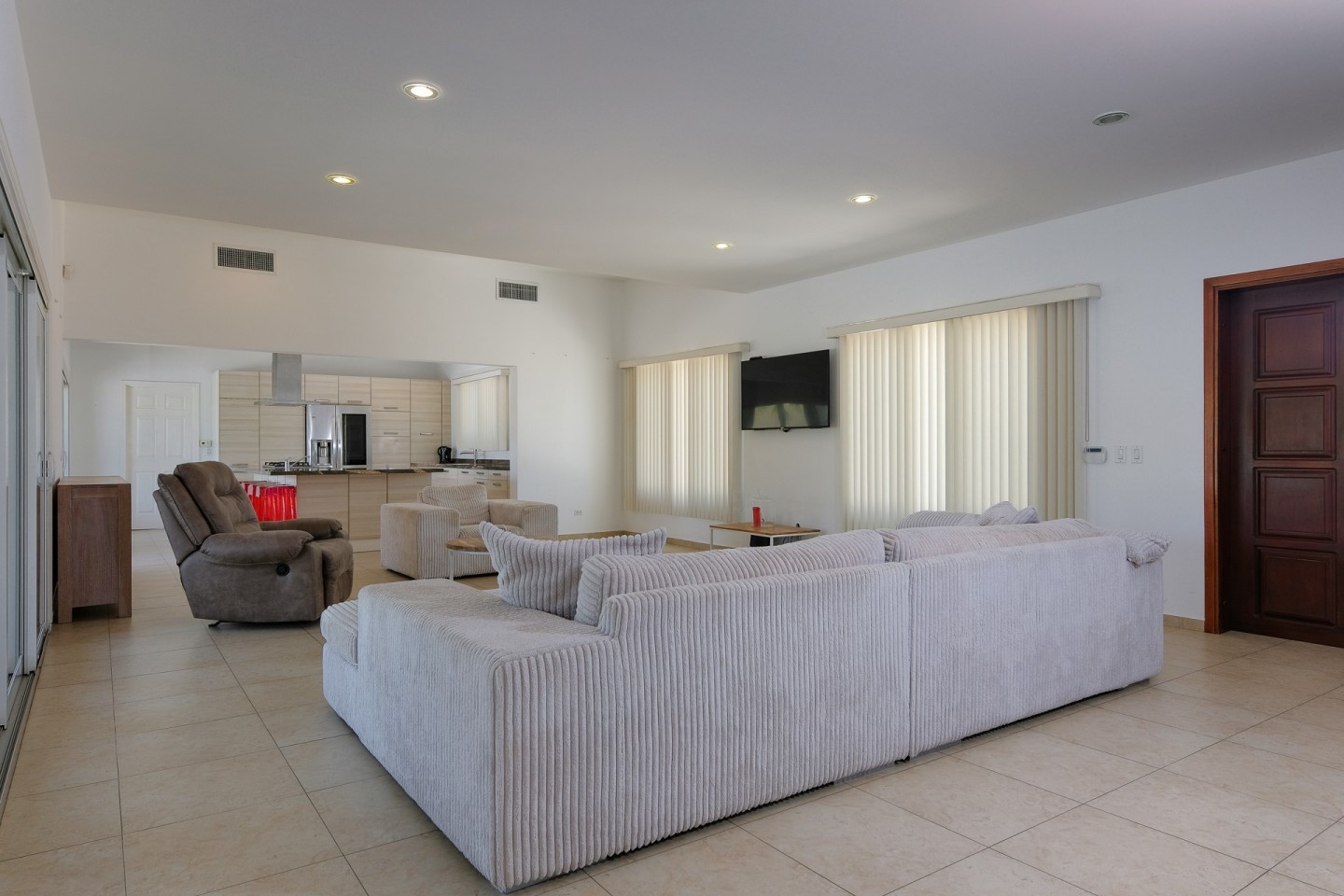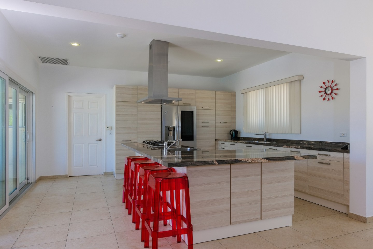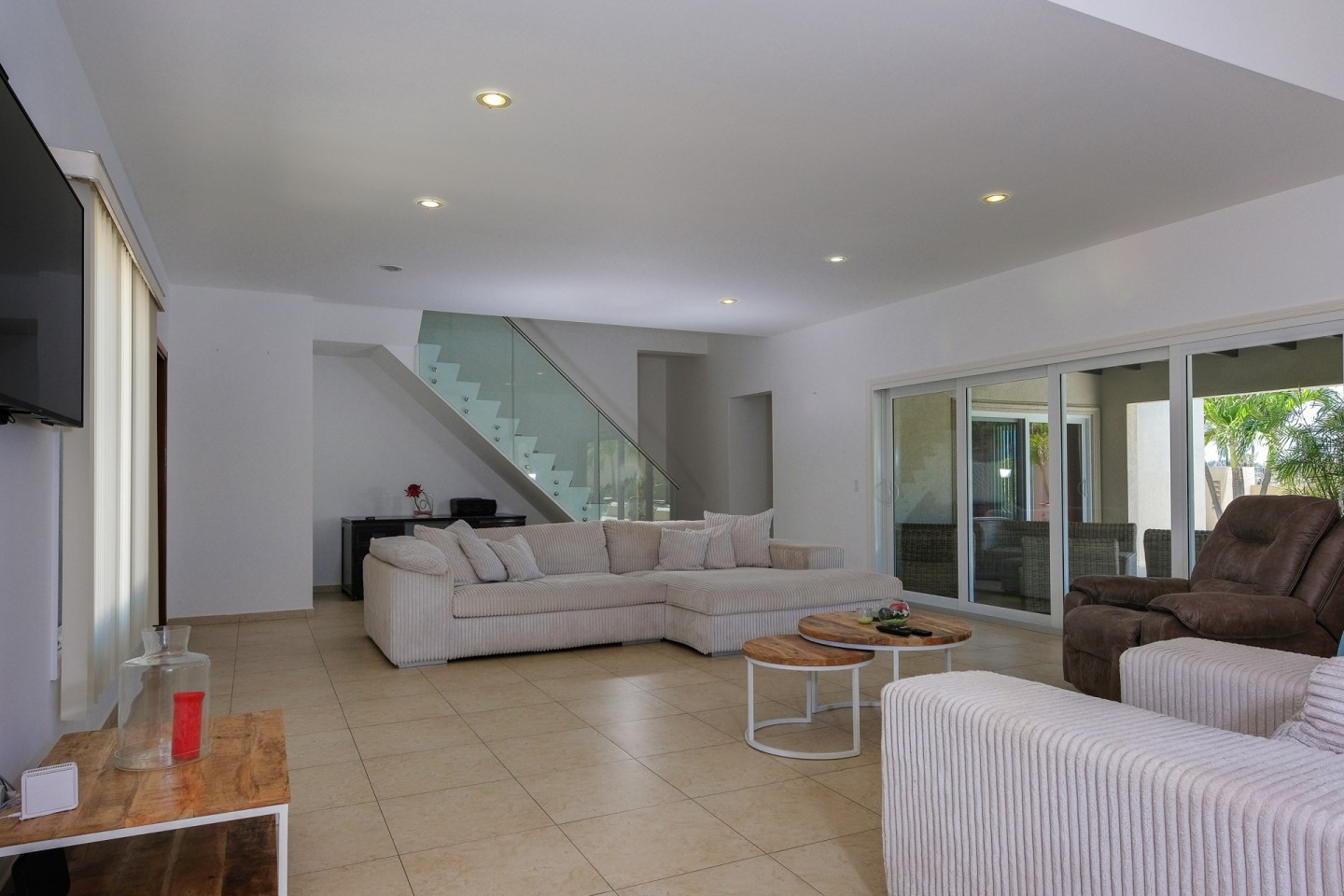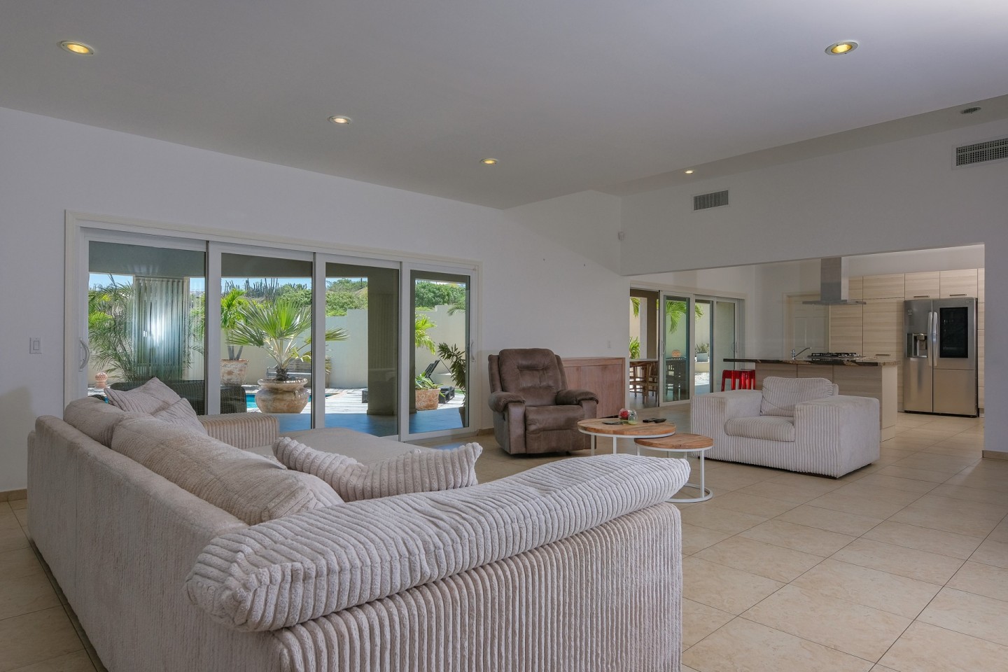The meticulously landscaped, spacious garden boasts a spacious swimming pool and hot tub with a wooden deck and a covered terrace – a perfect place to relax in the sun or shade while enjoying the refreshing Aruba breeze. The ground floor includes two bedrooms. The master bedroom overlooking the pool has a private walk-in closet and an ensuite bathroom, a double sink, and a spacious shower. The second bedroom also has its bathroom and walk-in closet. The second floor offers two generously sized bedrooms, each with its walk-in closet and en-suite bathroom. One of the bathrooms even has a double shower. Both bedrooms offer breathtaking island views.