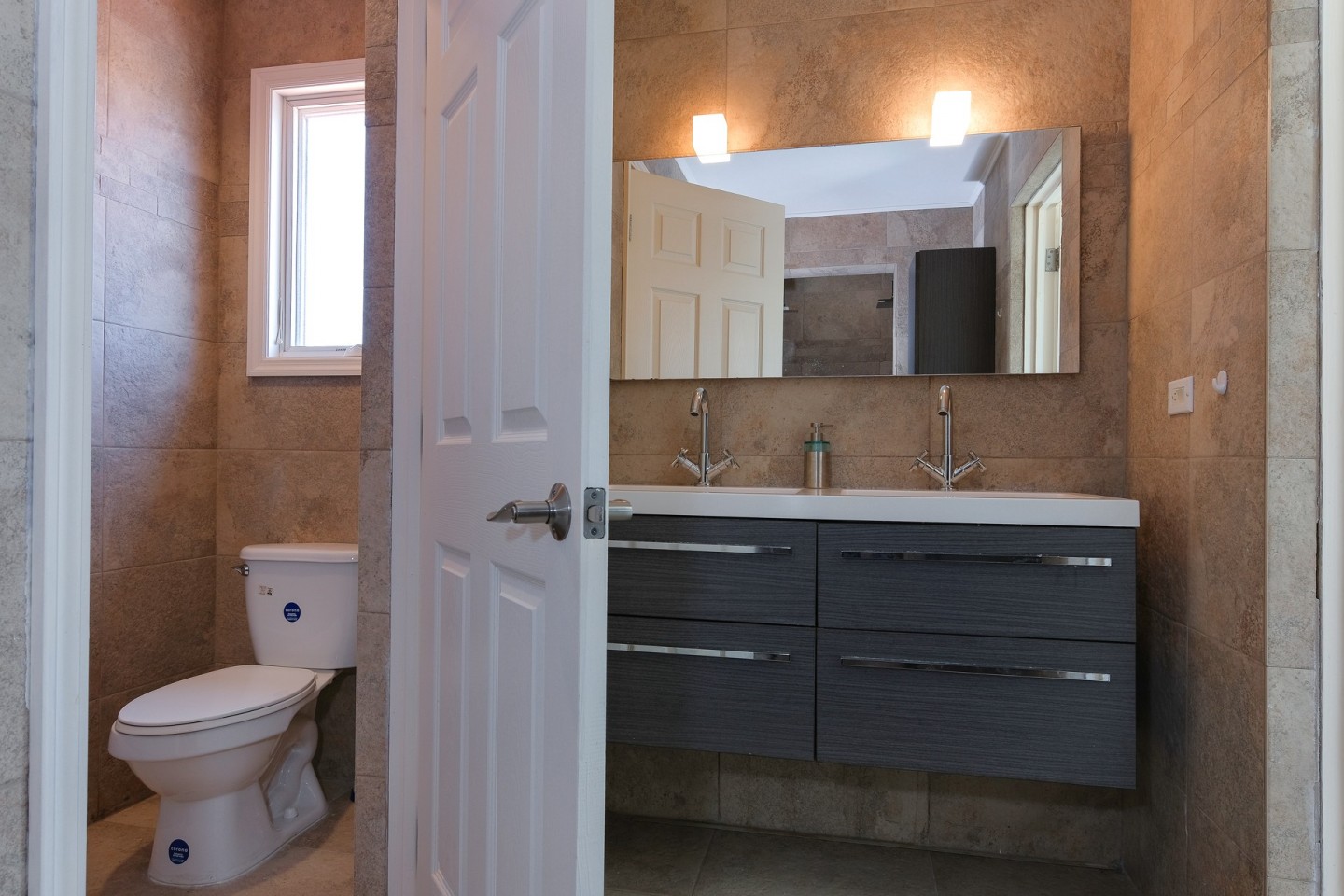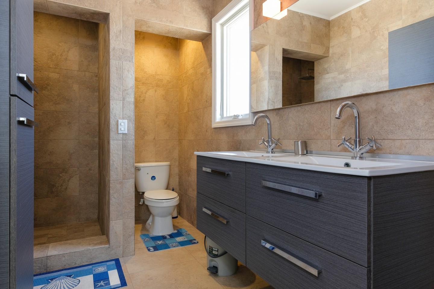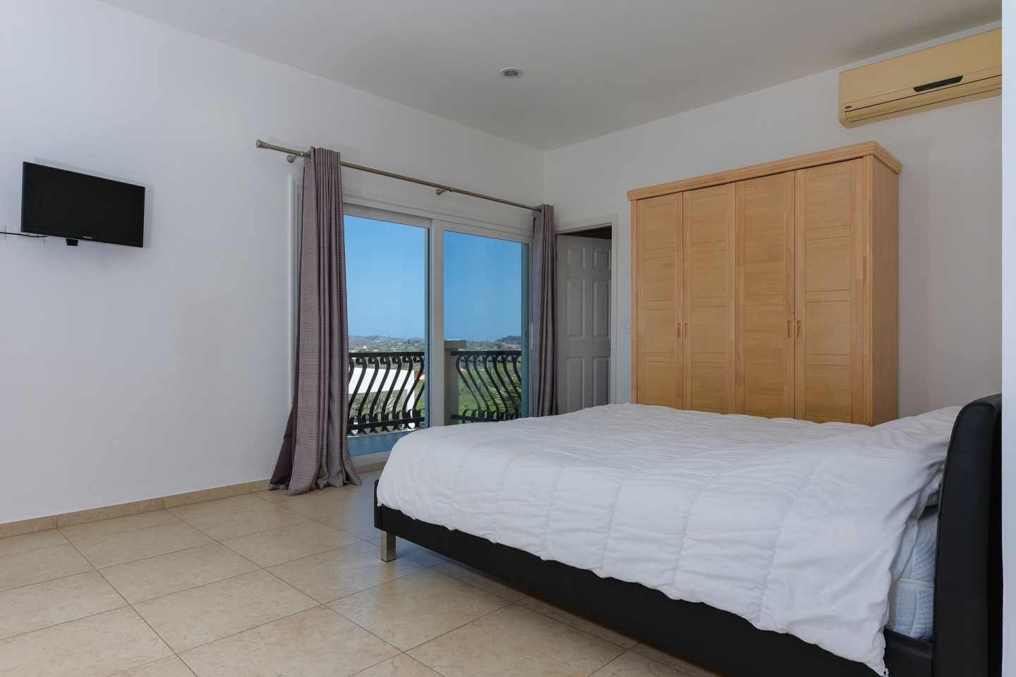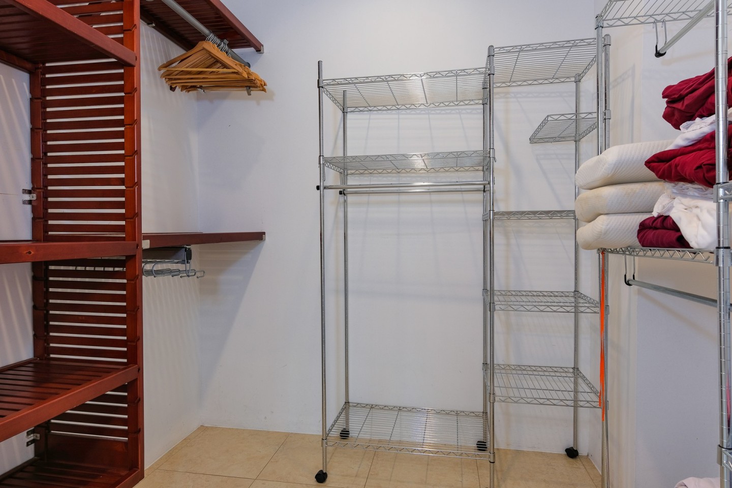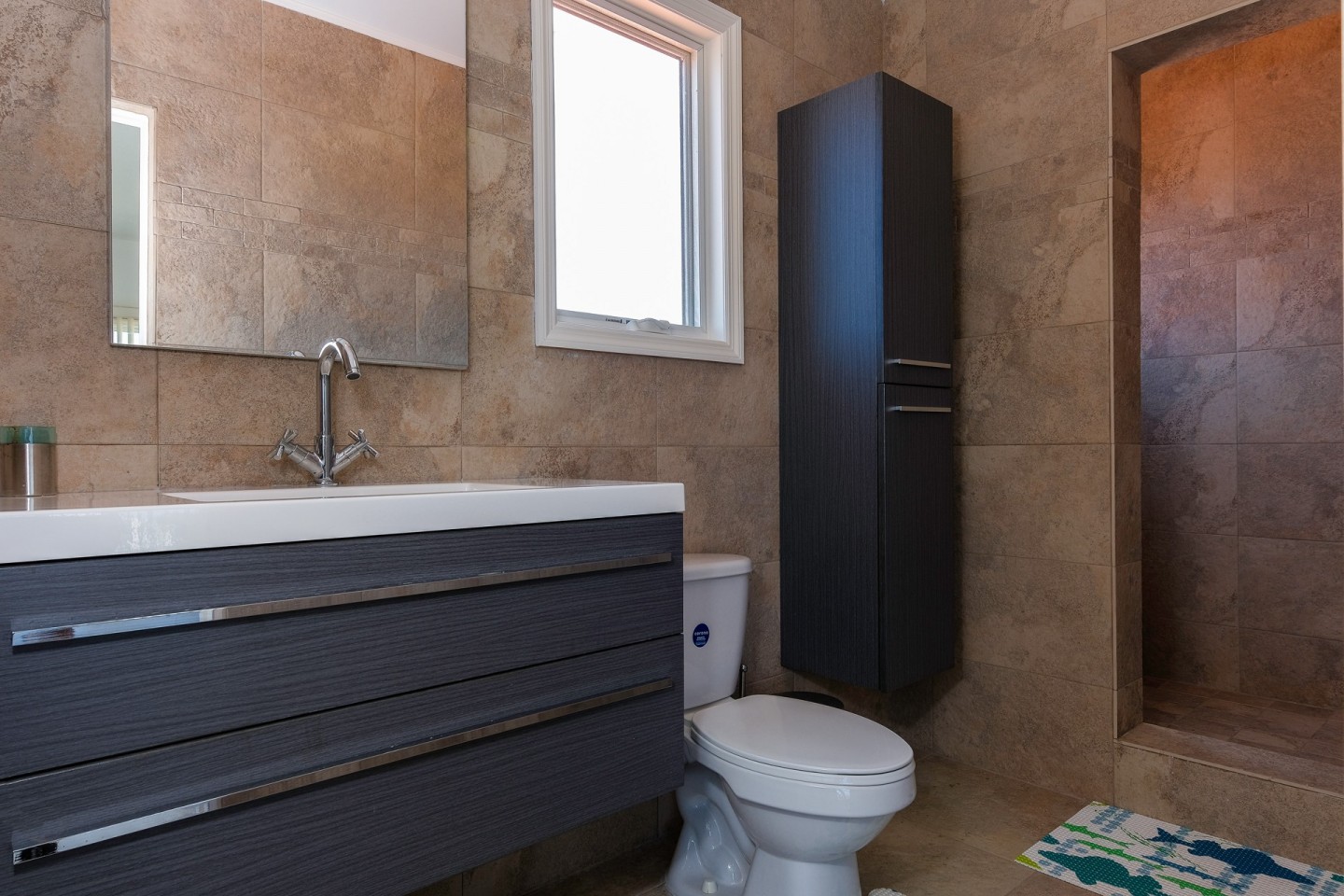 The meticulously landscaped, spacious garden boasts a spacious swimming pool and hot tub with a wooden deck and a covered terrace – a perfect place to relax in the sun or shade while enjoying the refreshing Aruba breeze. The ground floor includes two bedrooms. The master bedroom overlooking the pool has a private walk-in closet and an ensuite bathroom, a double sink, and a spacious shower. The second bedroom also has its bathroom and walk-in closet. The second floor offers two generously sized bedrooms, each with its walk-in closet and en-suite bathroom. One of the bathrooms even has a double shower. Both bedrooms offer breathtaking island views.