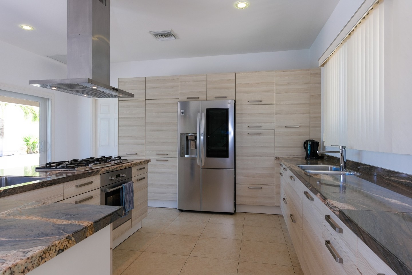 Upon entering this exceptional residence, you'll find an expansive open living concept. The contemporary kitchen is fully outfitted with a kitchen island and top-tier stainless steel appliances, including a built-in dishwasher, oven, and a 6-burner cooktop. The airy living room and kitchen provide a wonderful view of the garden and pool area, accessible through high-quality sliding doors.