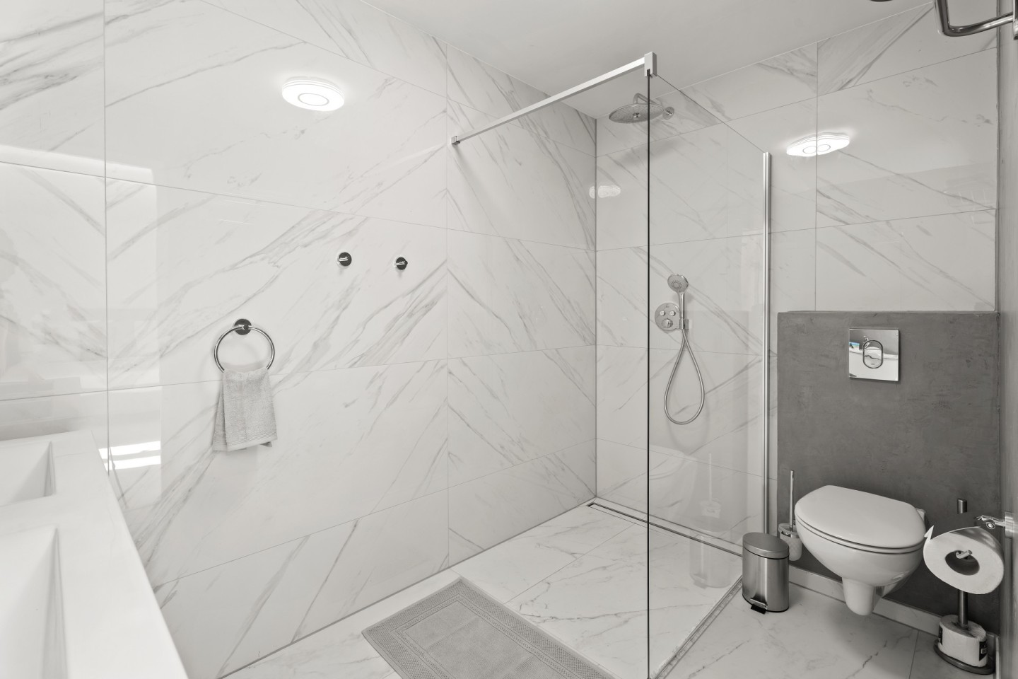 An open-concept living area benefits from natural light streaming through a striking glass façade, creating a bright and airy ambiance. Additional features such as a pool table and arcade game add a touch of character and enjoyment to the home. Every space is air-conditioned and finished to a high standard.