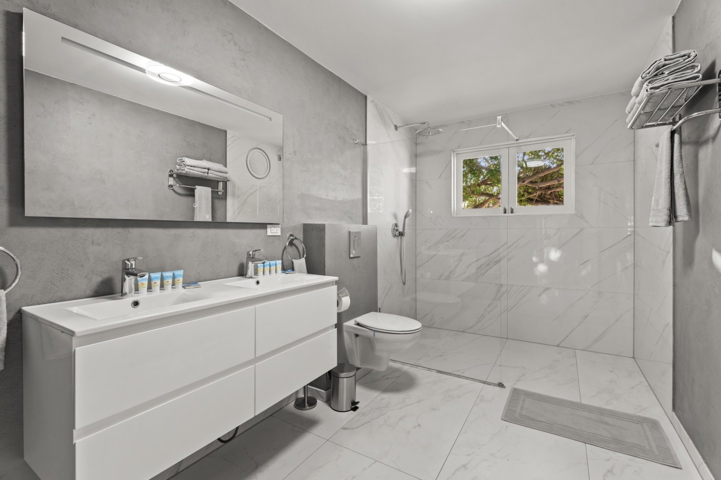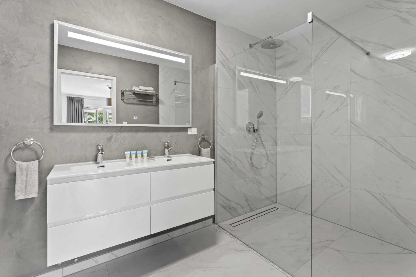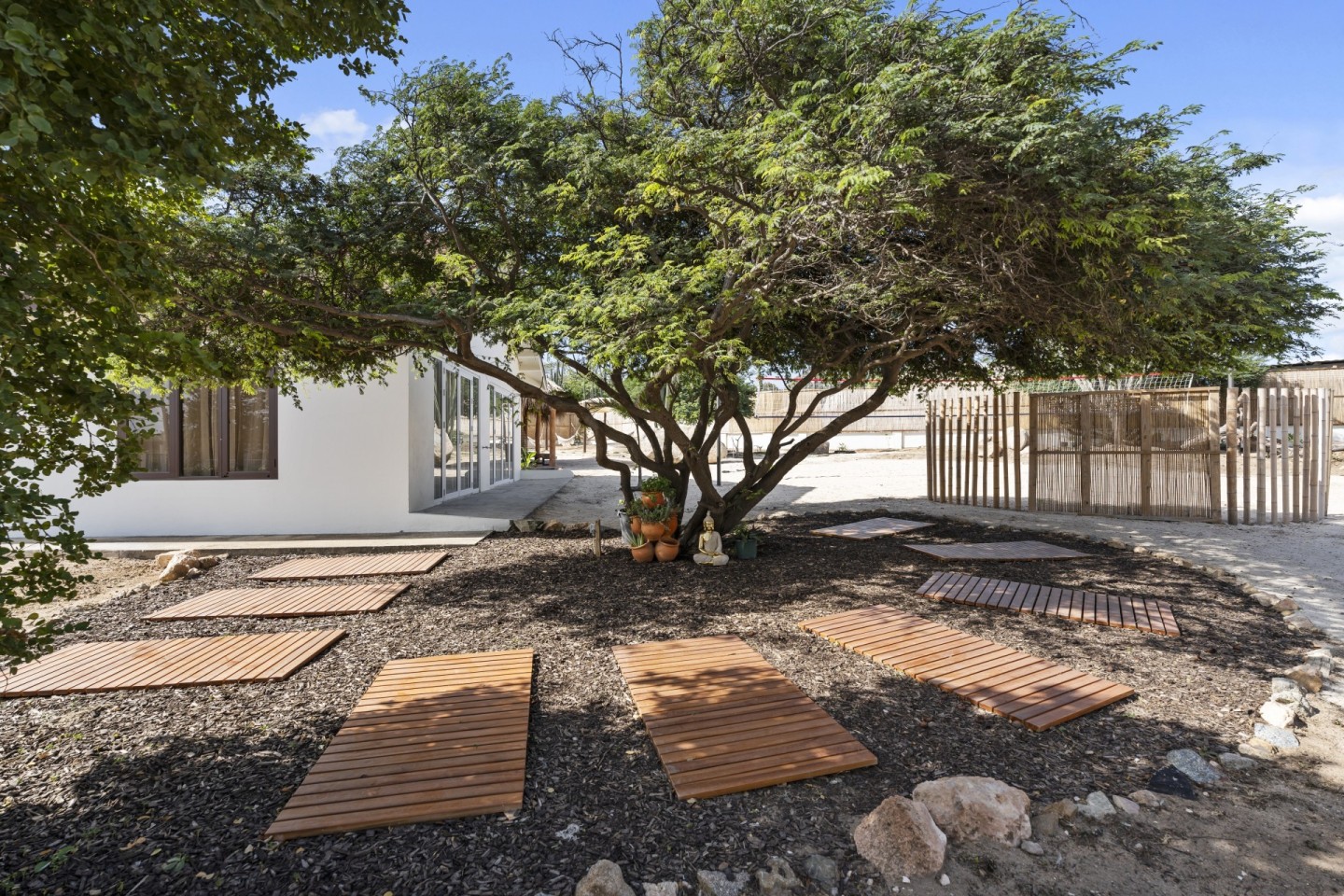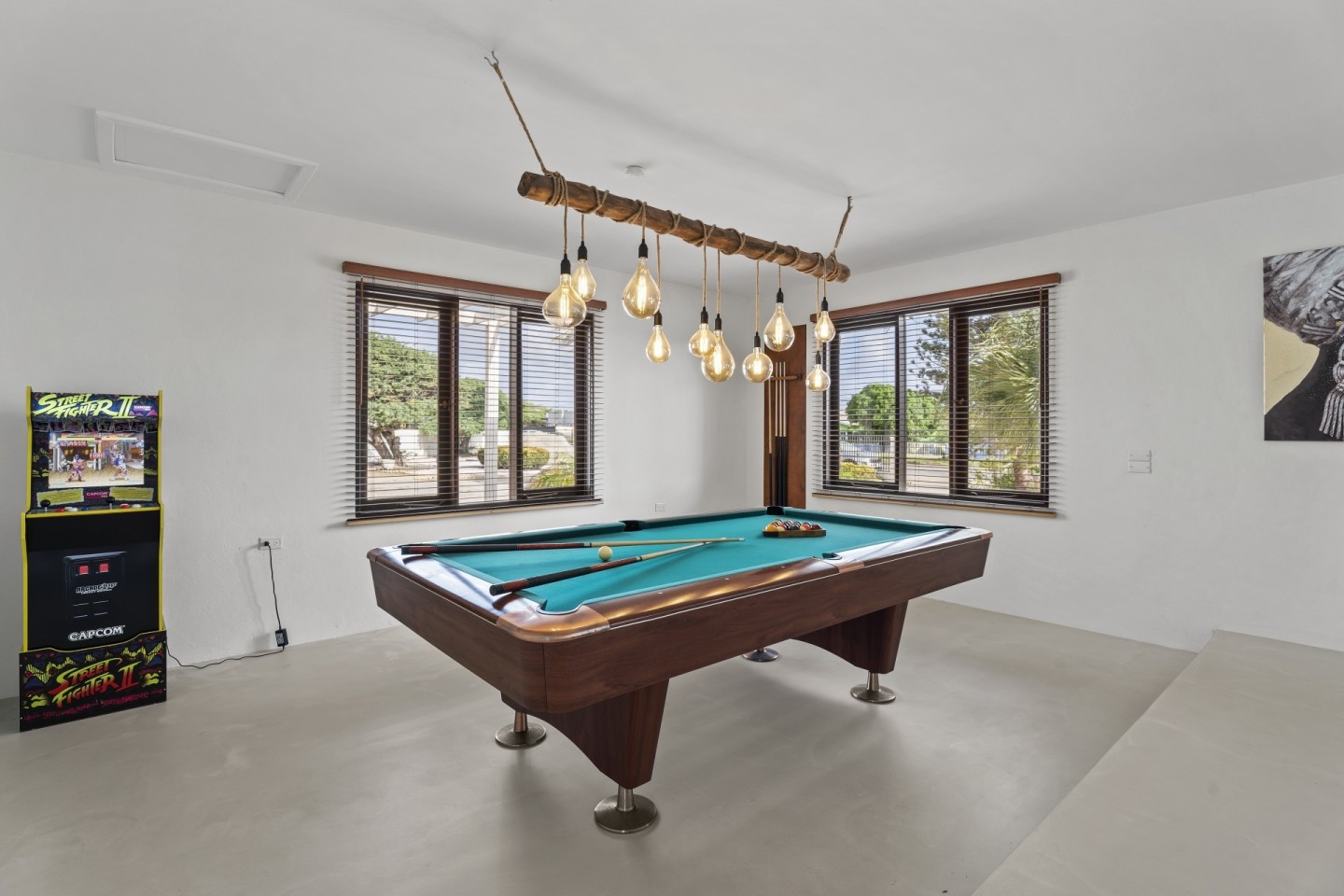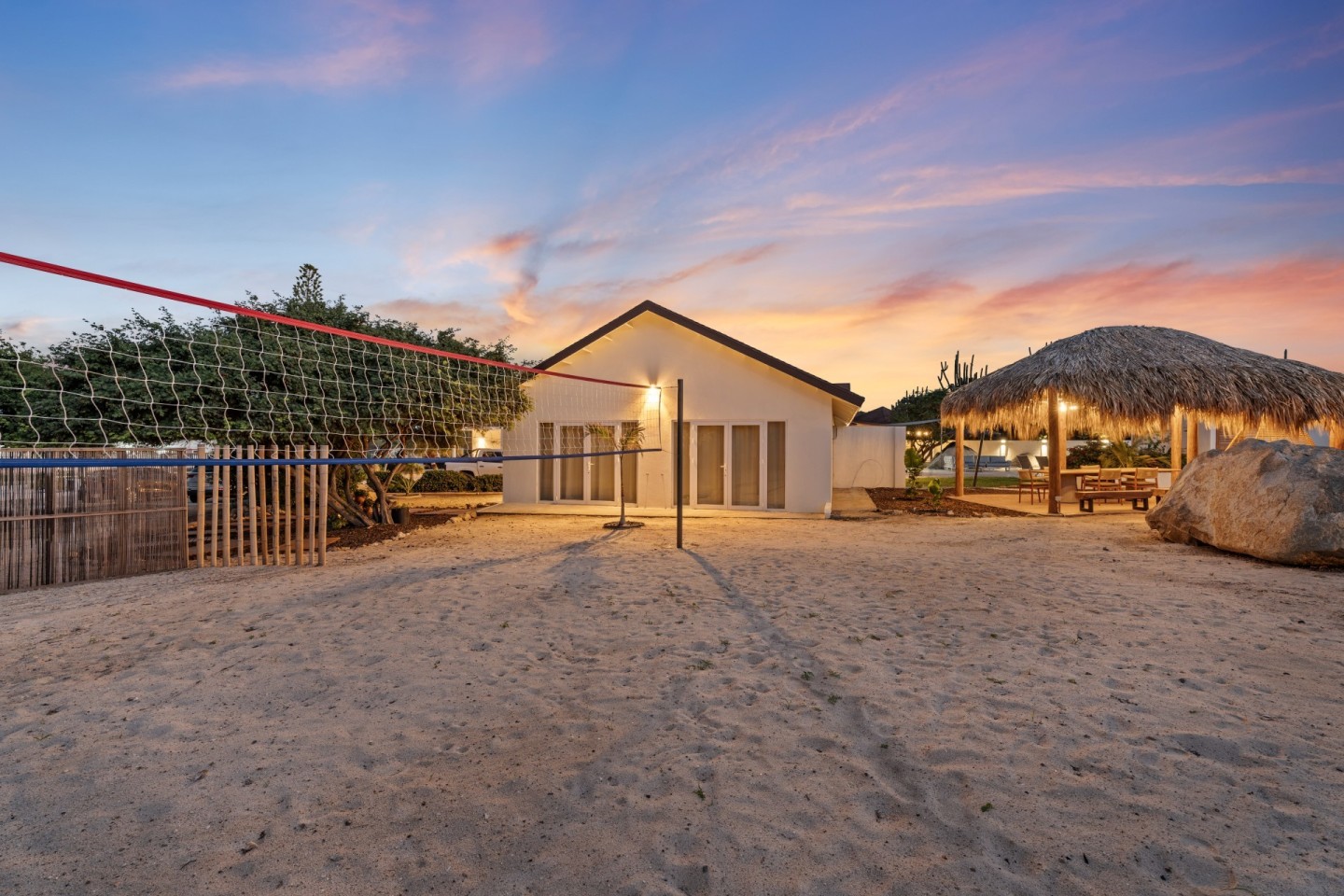 The outdoor space has been thoughtfully designed to offer both relaxation and recreation in a private, tropical setting. Enjoy a refreshing dip in the swimming pool, or unwind in the shaded lounge areas and hammocks. The beach-style sand area features a volleyball court and outdoor games, while a dedicated yoga space invites moments of calm and mindfulness. An outdoor bar with cooler, BBQ area provide a perfect setting for entertaining or enjoying Aruba’s tropical climate. Additional practical features include a laundry room with washer and dryer, an outdoor half bathroom and ample storage space, making everyday living convenient and easy.
