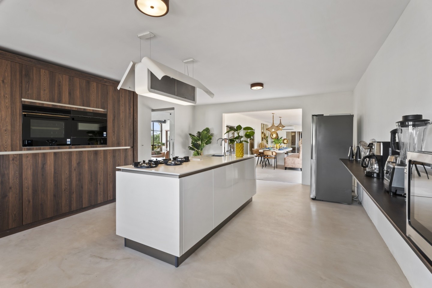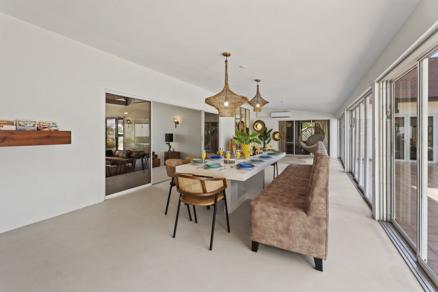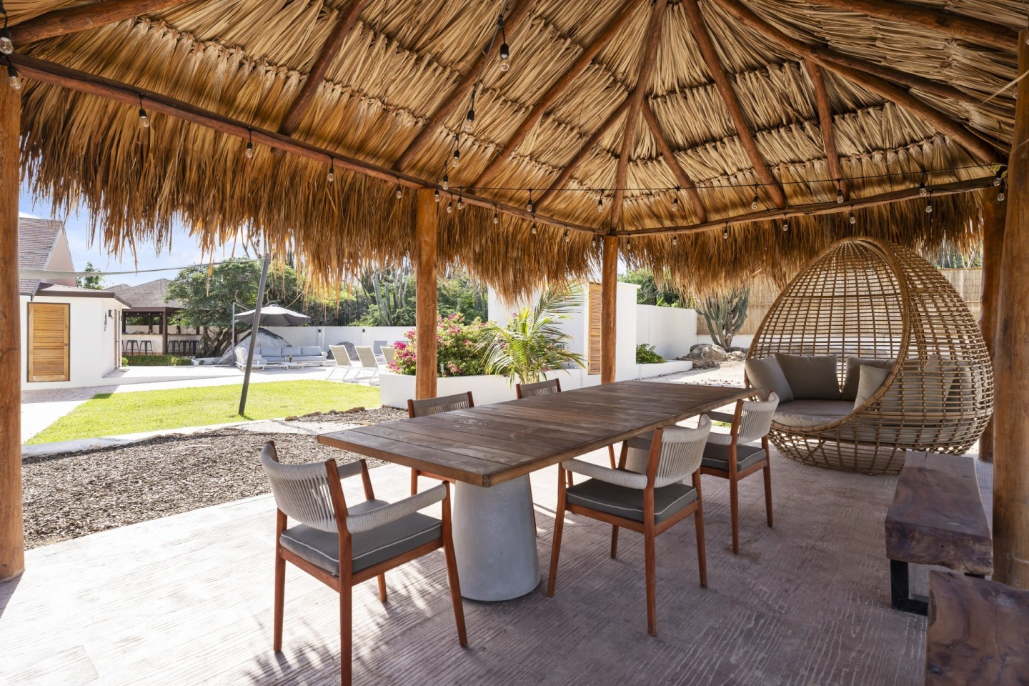 At the heart of the villa is a spacious, fully equipped kitchen with premium appliances including two refrigerators, two freezers, a Quooker and ample workspace. The kitchen flows directly into a large indoor dining area with a substantial family-style table, which is perfect for shared meals and casual connection. Dining can also be enjoyed outdoors under a shaded palapa surrounded by lush landscaping.