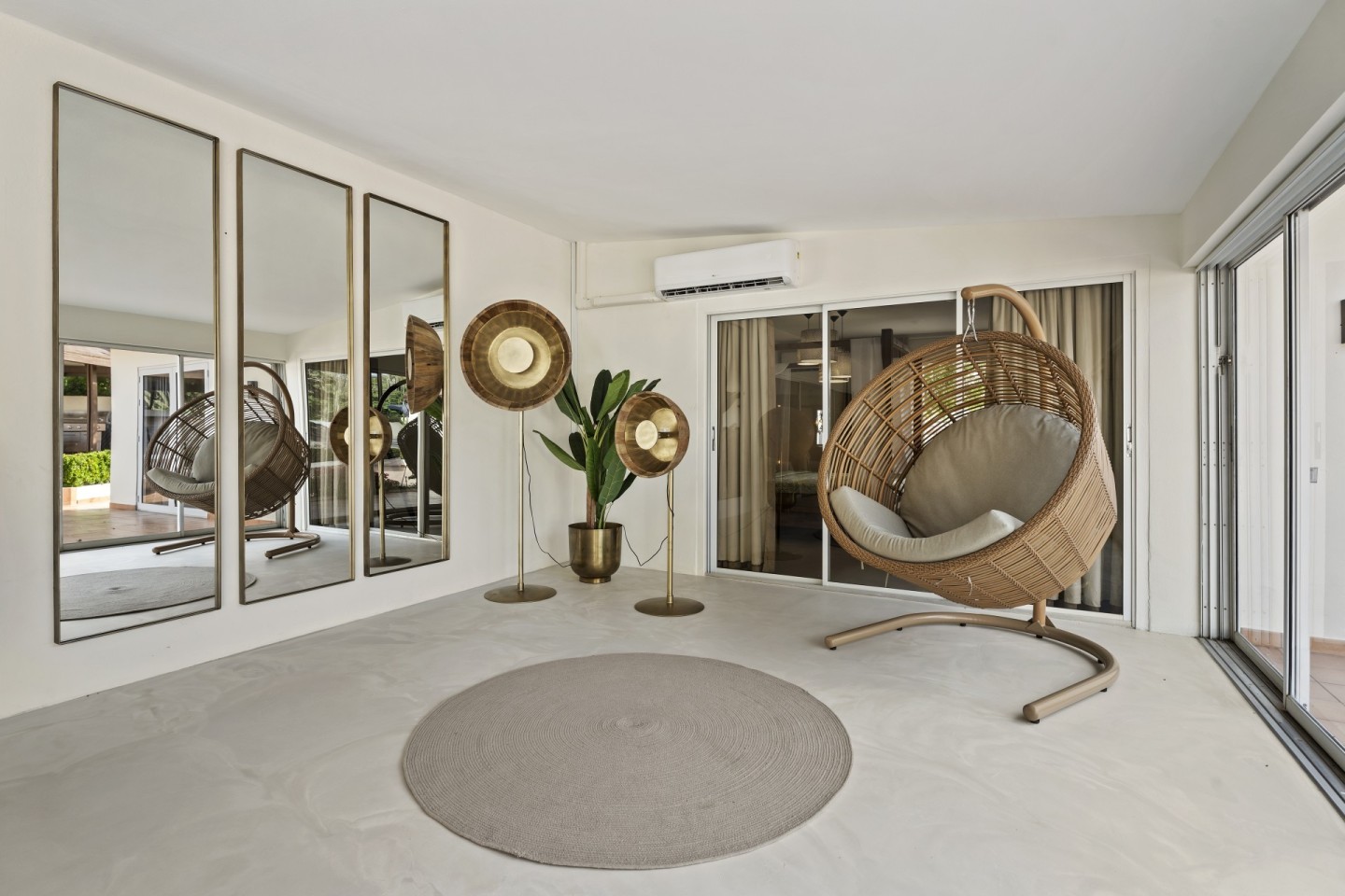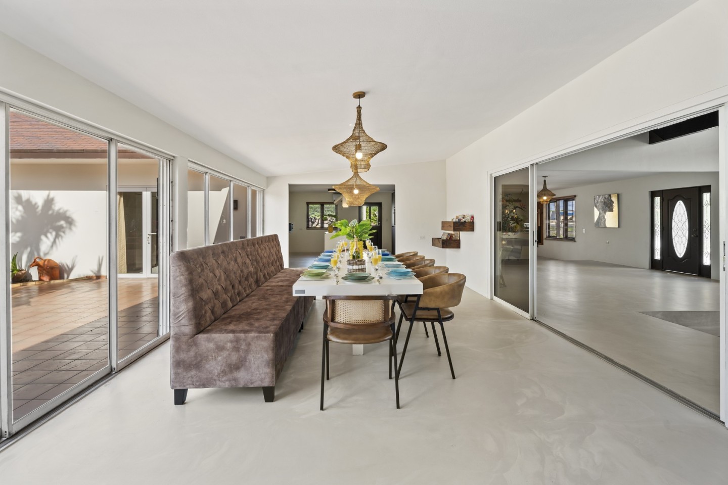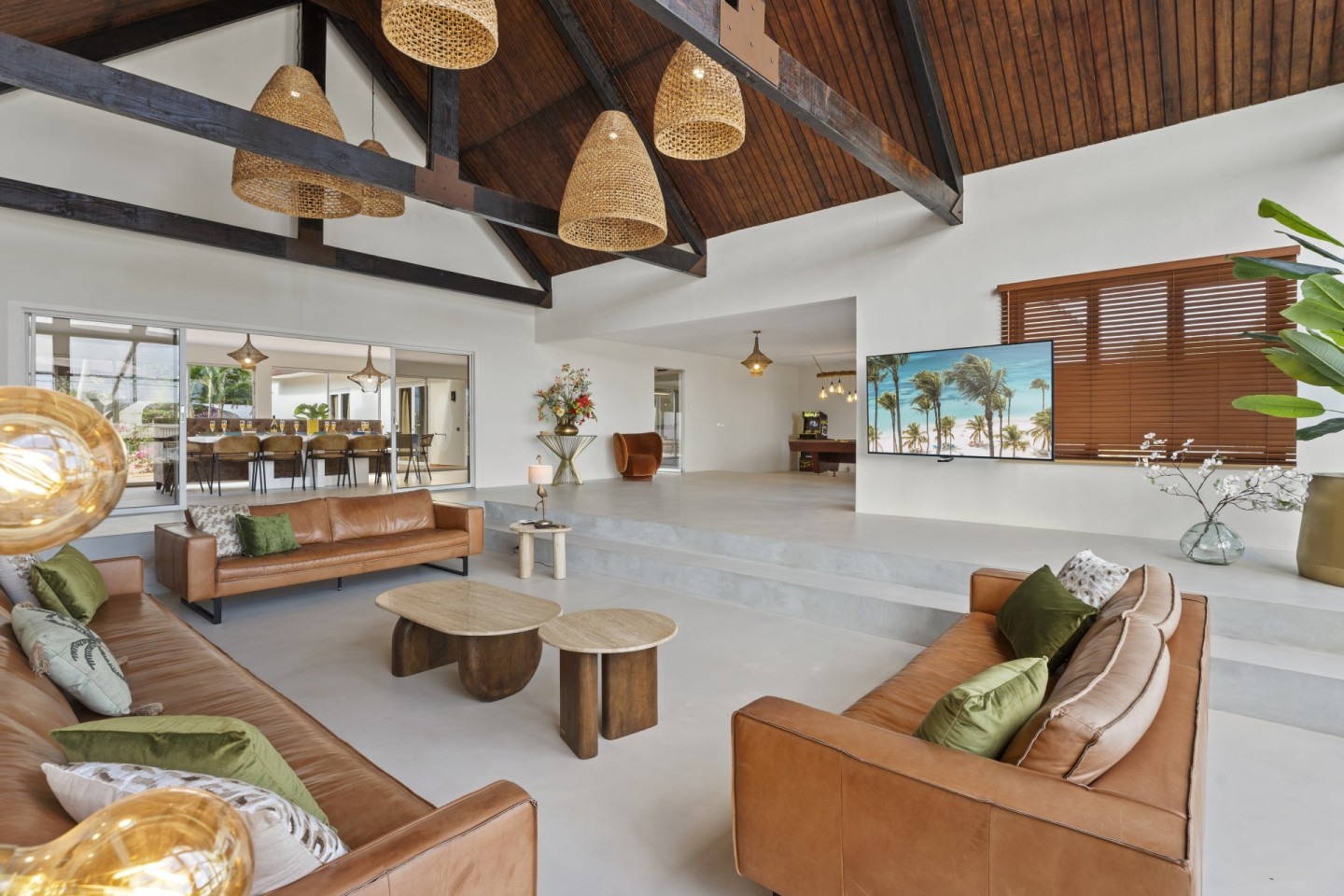 At the heart of the villa is a spacious, fully equipped kitchen with premium appliances including two refrigerators, two freezers, a Quooker and ample workspace. The kitchen flows directly into a large indoor dining area with a substantial family-style table, which is perfect for shared meals and casual connection. Dining can also be enjoyed outdoors under a shaded palapa surrounded by lush landscaping.
