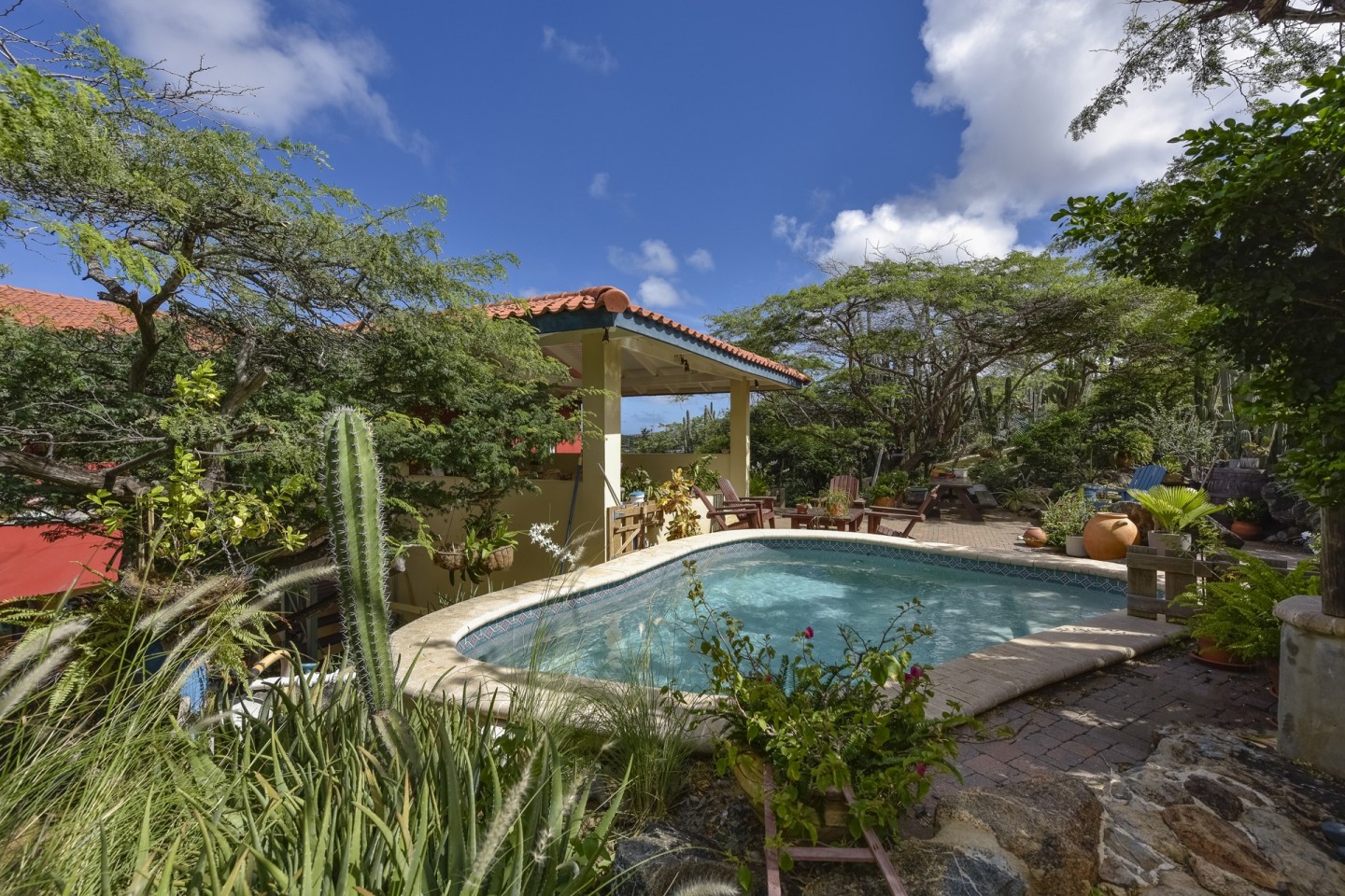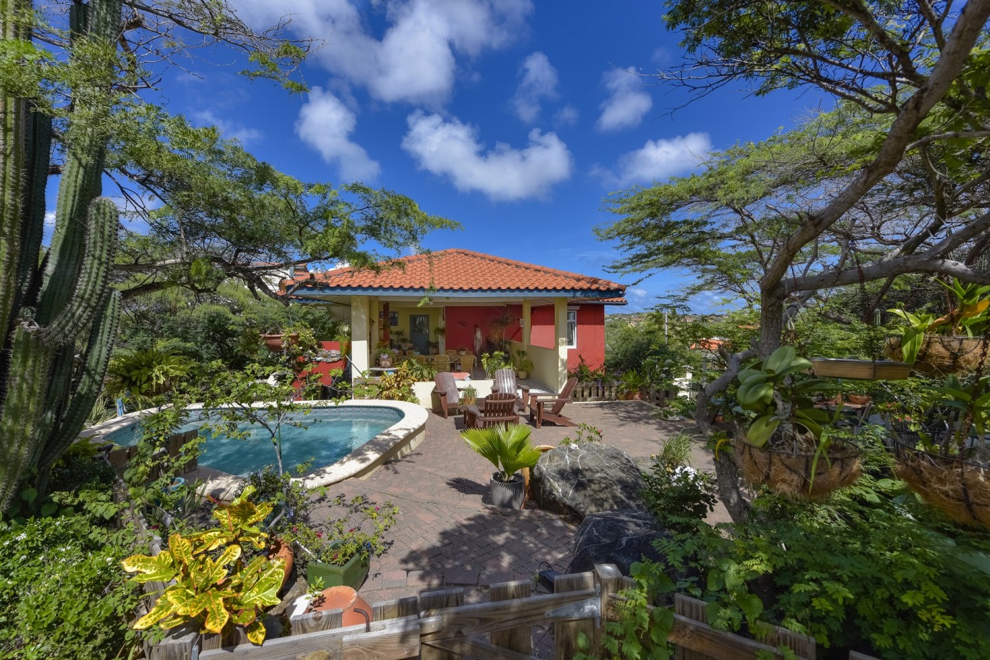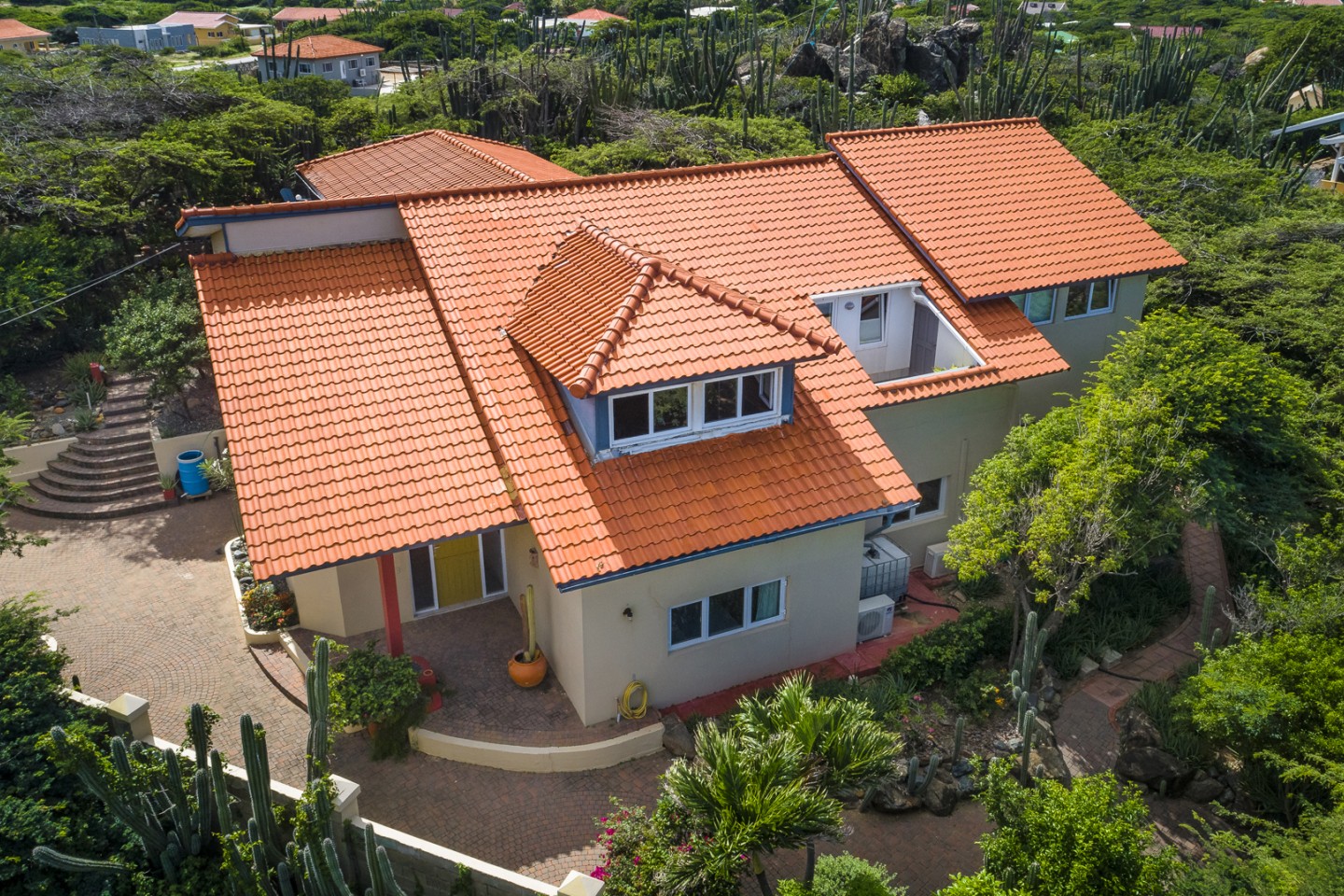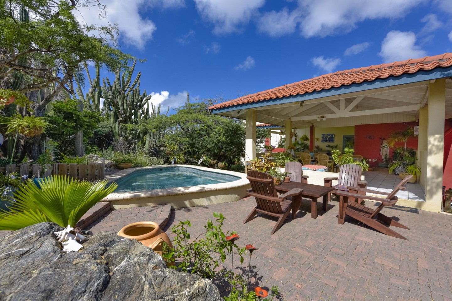 When first arriving at the home, a long drive way welcomes you to the front gate. Entering the property, the front yard and paved steps guide you to the back entrance and pool area, whereas the front door leads to the entryway and stairway. Underneath the stairway is a half bath. Through the hallway on the main floor are three bedrooms with bathrooms. The first and second guest rooms share Jack and Jill style bathrooms while the third bedroom has its own bathroom and private door leading out the the terrance. Upstairs, on the right is the modern fully-equipped open kitchen with dining area. The kitchen offers built-in stainless steel appliances (e.g. stove, cook top, range hood, dishwasher) and under cabinet lighting. To the left you will find the spacious living room with beautiful tall wood beam ceilings and brand new glass doors leading out to the covered terrace and pool area. Down the hallway between the living room and kitchen is the master bedroom with private en-suite bathroom, built-in closet and private balcony. The back yard is surrounded by amazing greenery and has lots of seating/entertainment space for gatherings with friends and family. Lounge by the pool, take in the hot Caribbean weather or enjoy Aruba's breeze in the sunshine. This home is fully fenced and has large garage with workshop and laundry room.