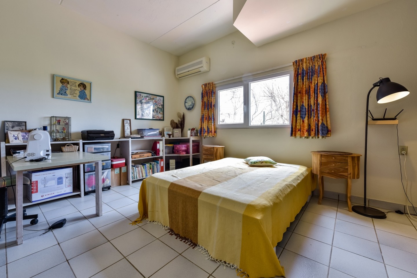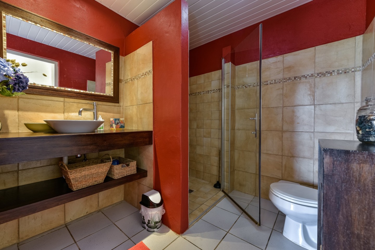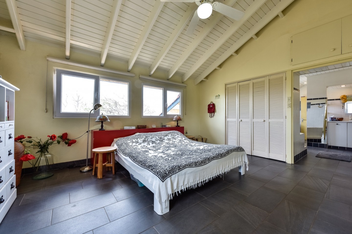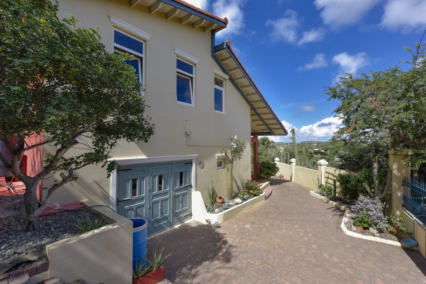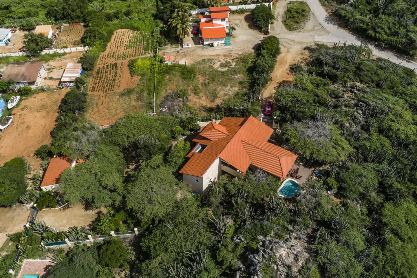 When first arriving at the home, a long drive way welcomes you to the front gate. Entering the property, the front yard and paved steps guide you to the back entrance and pool area, whereas the front door leads to the entryway and stairway. Underneath the stairway is a half bath. Through the hallway on the main floor are three bedrooms with bathrooms. The first and second guest rooms share Jack and Jill style bathrooms while the third bedroom has its own bathroom and private door leading out the the terrance. Upstairs, on the right is the modern fully-equipped open kitchen with dining area. The kitchen offers built-in stainless steel appliances (e.g. stove, cook top, range hood, dishwasher) and under cabinet lighting. To the left you will find the spacious living room with beautiful tall wood beam ceilings and brand new glass doors leading out to the covered terrace and pool area. Down the hallway between the living room and kitchen is the master bedroom with private en-suite bathroom, built-in closet and private balcony. The back yard is surrounded by amazing greenery and has lots of seating/entertainment space for gatherings with friends and family. Lounge by the pool, take in the hot Caribbean weather or enjoy Aruba's breeze in the sunshine. This home is fully fenced and has large garage with workshop and laundry room.