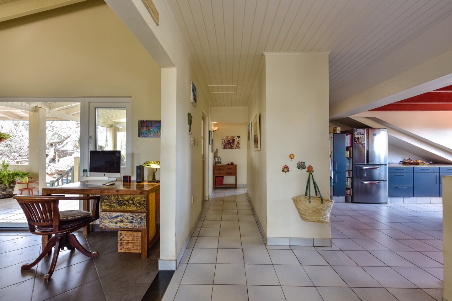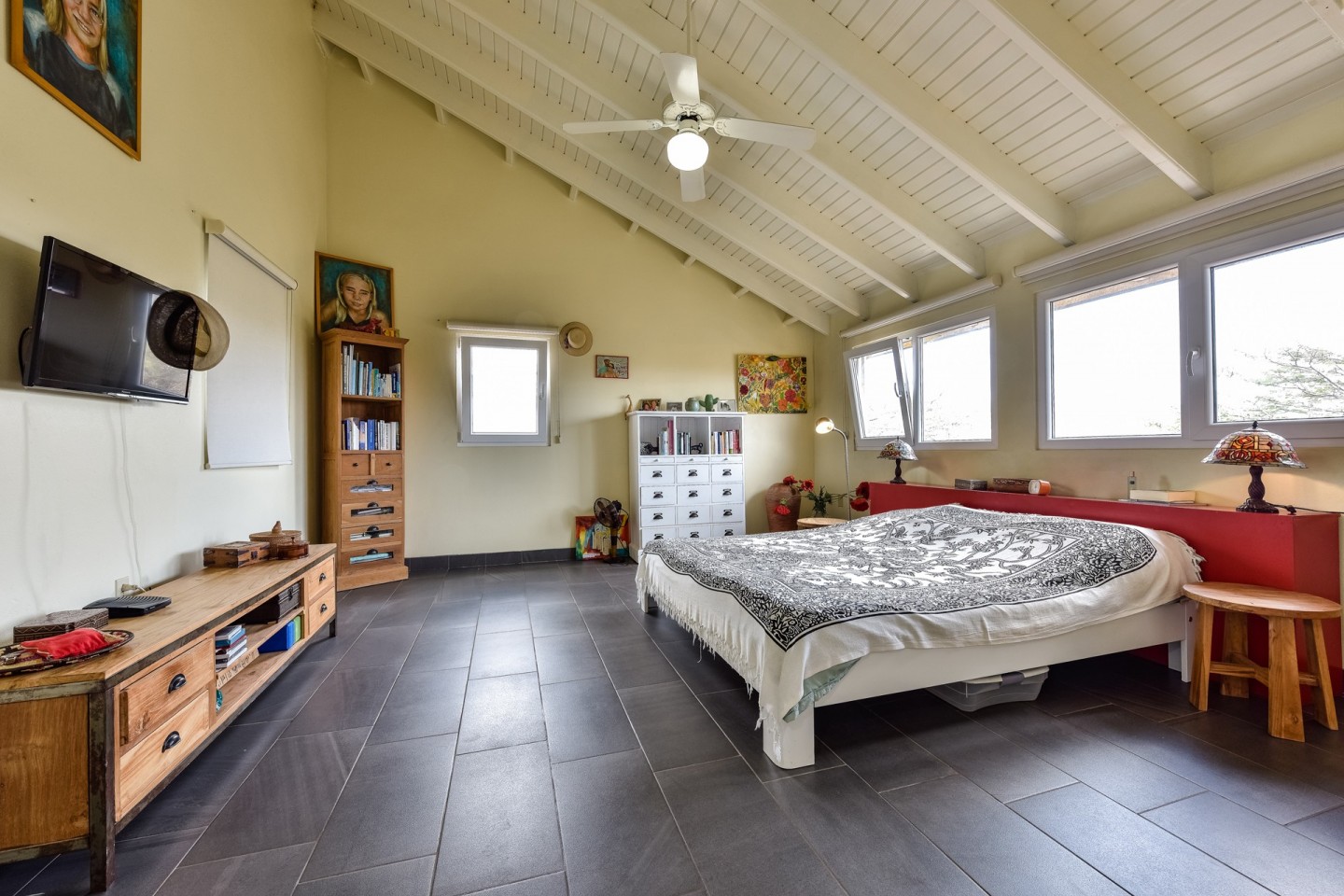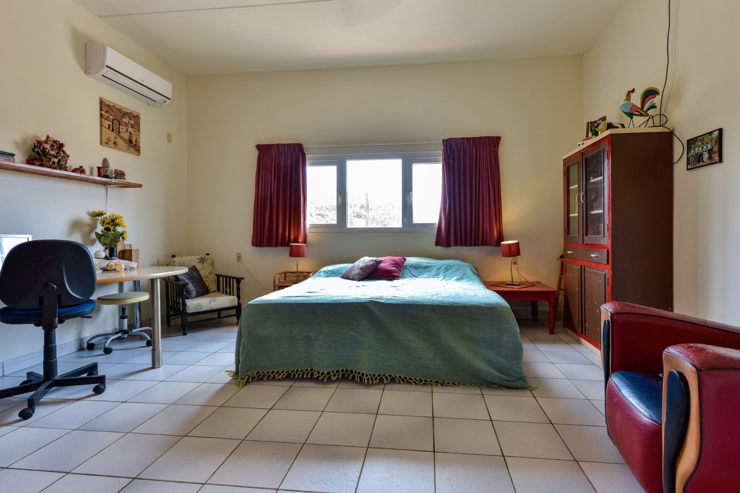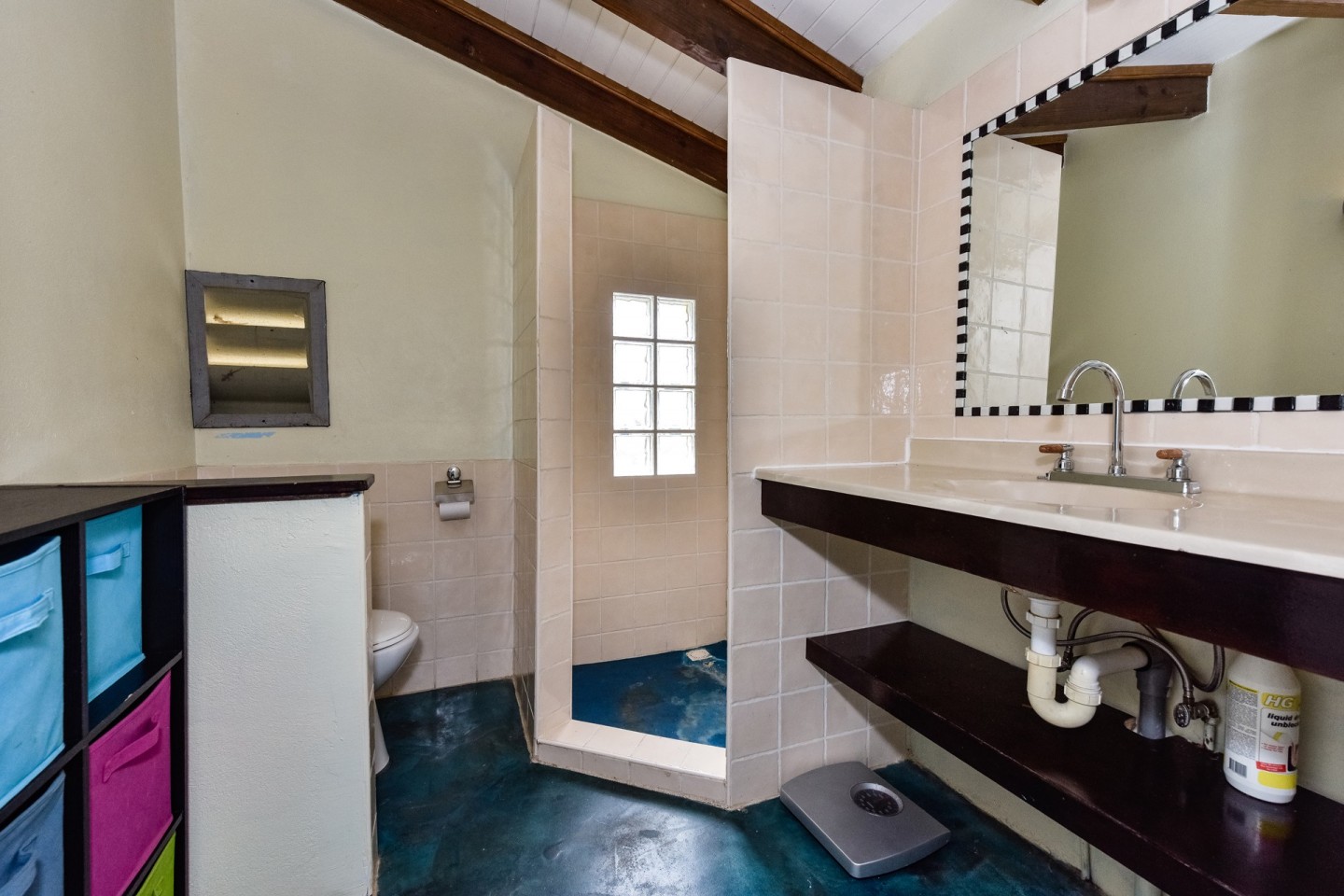 When first arriving at the home, a long drive way welcomes you to the front gate. Entering the property, the front yard and paved steps guide you to the back entrance and pool area, whereas the front door leads to the entryway and stairway. Underneath the stairway is a half bath. Through the hallway on the main floor are three bedrooms with bathrooms. The first and second guest rooms share Jack and Jill style bathrooms while the third bedroom has its own bathroom and private door leading out the the terrance. Upstairs, on the right is the modern fully-equipped open kitchen with dining area. The kitchen offers built-in stainless steel appliances (e.g. stove, cook top, range hood, dishwasher) and under cabinet lighting. To the left you will find the spacious living room with beautiful tall wood beam ceilings and brand new glass doors leading out to the covered terrace and pool area. Down the hallway between the living room and kitchen is the master bedroom with private en-suite bathroom, built-in closet and private balcony. The back yard is surrounded by amazing greenery and has lots of seating/entertainment space for gatherings with friends and family. Lounge by the pool, take in the hot Caribbean weather or enjoy Aruba's breeze in the sunshine. This home is fully fenced and has large garage with workshop and laundry room.