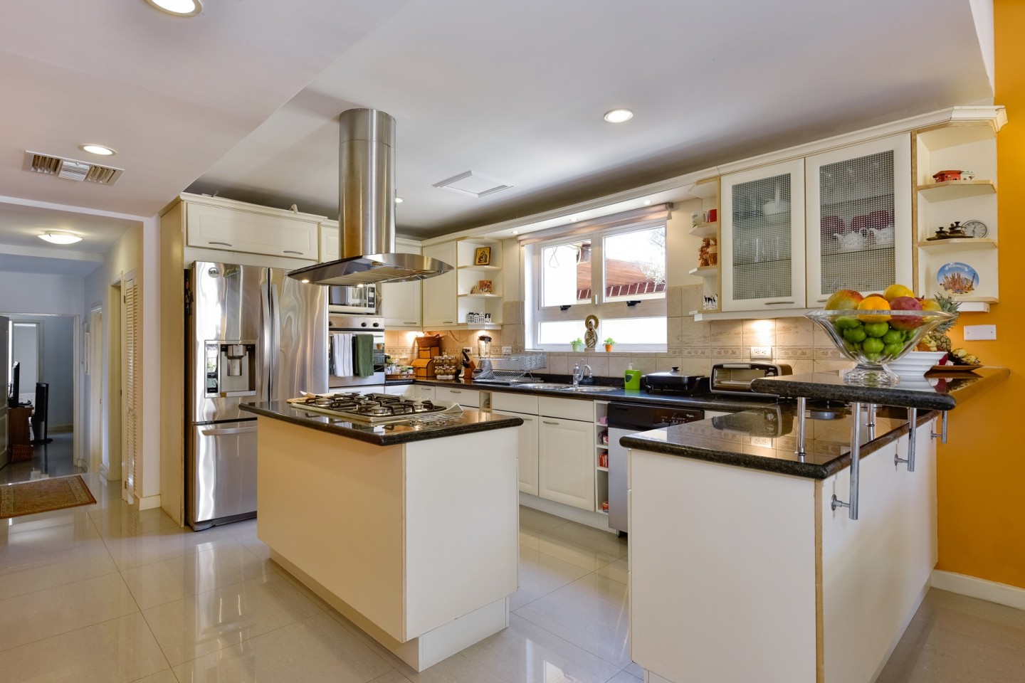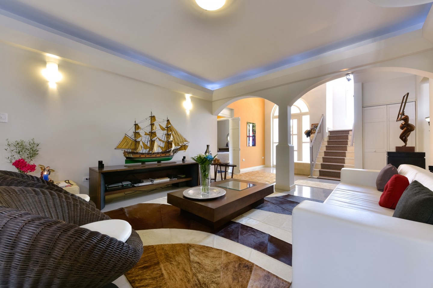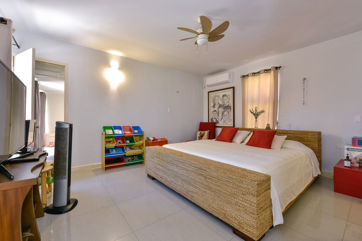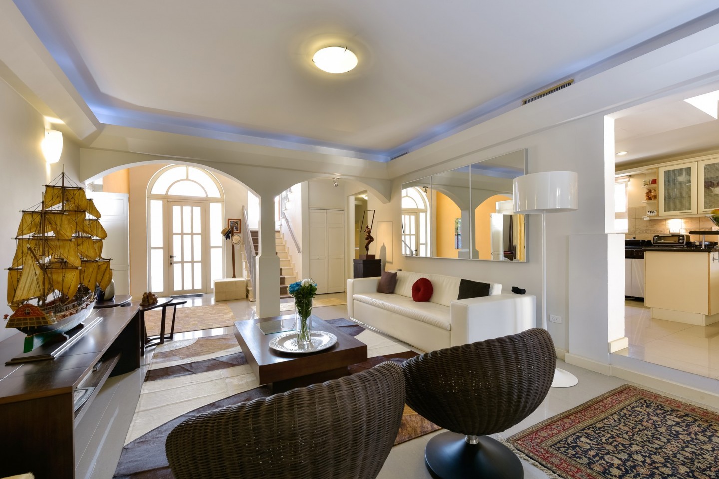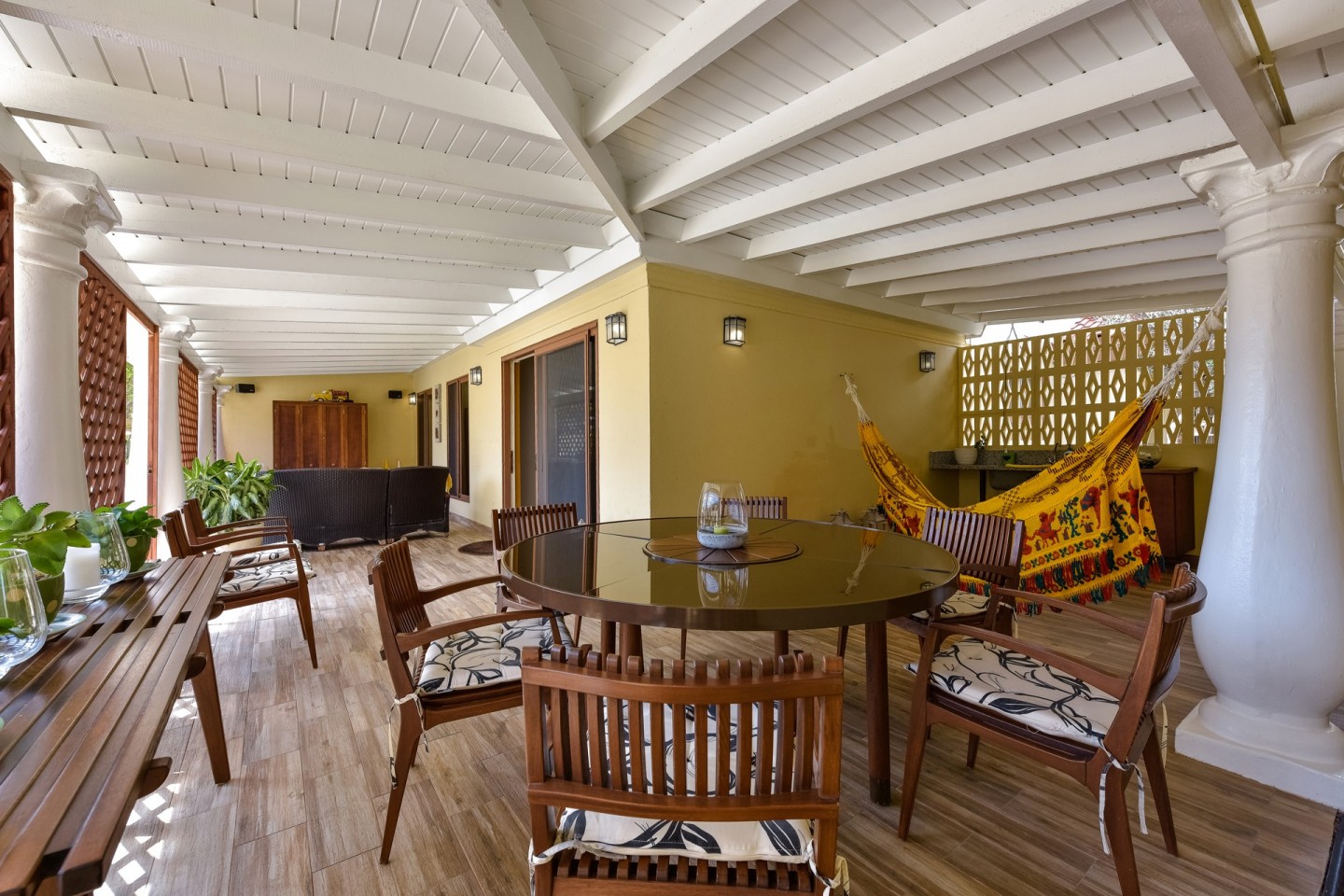 A beautifully landscaped front entrance greets you as you enter the residence. Natural light floods the open and inviting living room, designed for comfort and entertaining. The attached dining room offers the perfect space to host dinner parties and gather with friends and family. A spacious traditionally styled kitchen brings in elegance and functionality. Fully equipped with branded stainless steel appliances e.g. built-in dishwasher oven, refrigerator, cooktop with hood range as well as a double sink, natural stone countertops and breakfast bar. Adjacent, the casual ding room with incredible wood beam ceilings opens up to the outside covered patio which creates the ideal indoor/outdoor dining experience. The main floor promotes a light and bright palate with natural daylight throughout each of the 3 downstairs bedrooms. All three bedrooms have their own private en-suite bathrooms whereas one of the three has its own entrance to the pool area with private terrace. There is also half bath and maids quarter with a private entrance. The master suite with soaring beam ceilings is located upstairs and has its own walk-in closet as well as en-suite bathroom with floating double sinks, whirlpool bath and glass shower. A separate small bedroom is attached to the master and can be converted into a at-home office.
