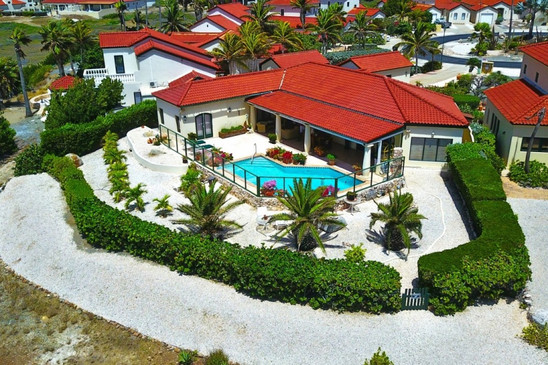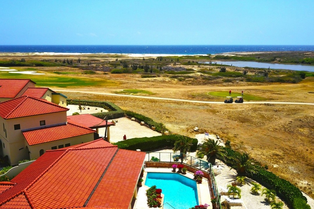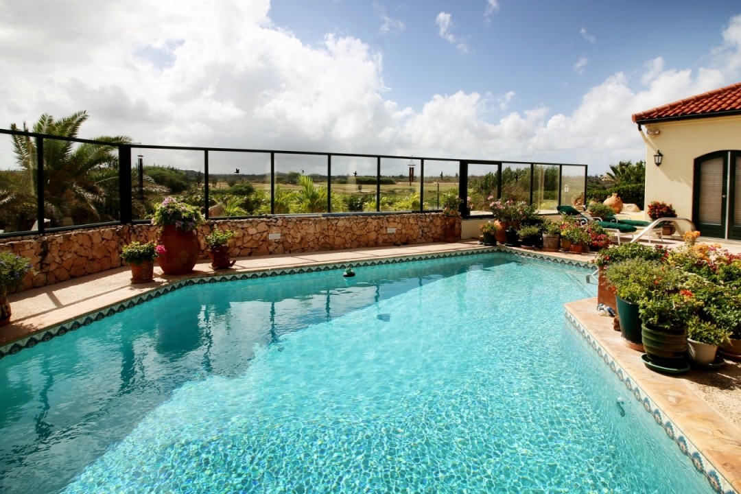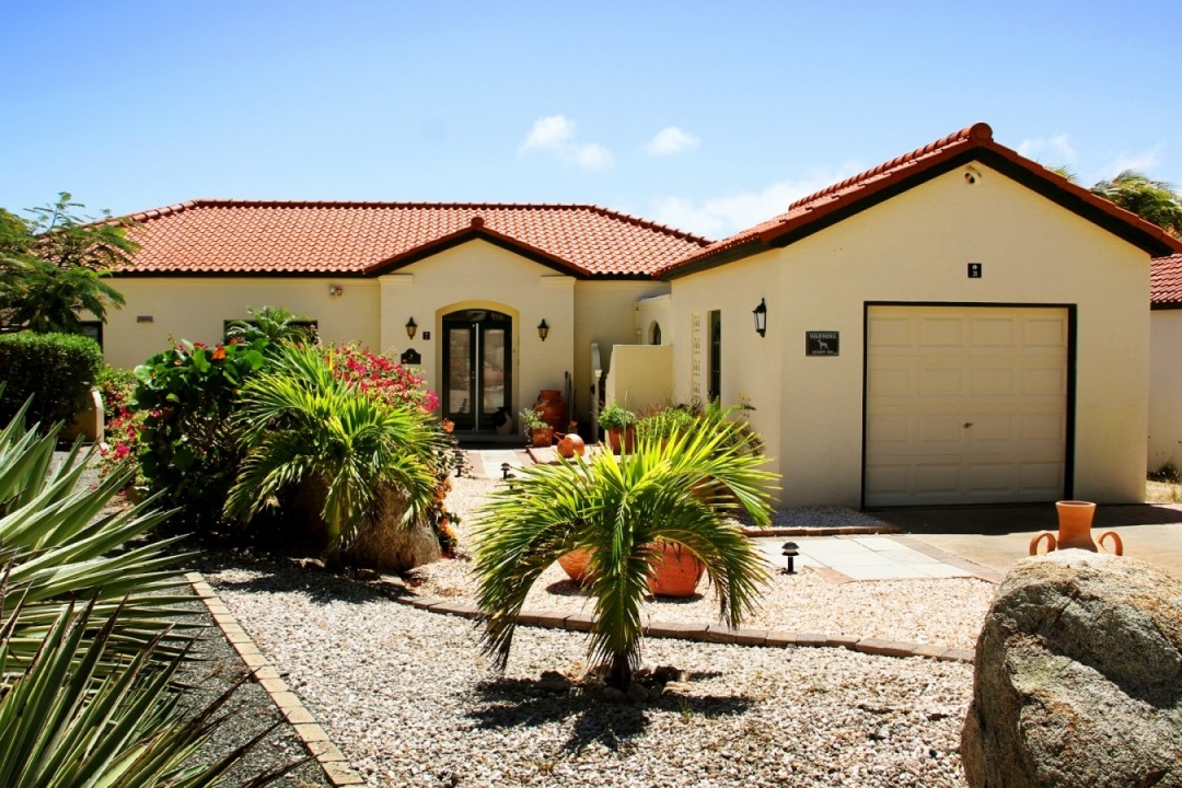 Beautiful modern villa located in the exclusive Tierra del Sol Golf resort. Tierra del Sol offers condos, villas and estate homes. It is Aruba’s Premiere Master planned gated community with a Spa, Country Club and 18 hole Championship Golf. This flamboyant villa is ideally located with breath taking ocean and golf course views. The property has a beautiful landscaped front and back yard with a spacious pool. In the garden you will feel a comfortable wind while enjoying the pool under the sun. Do you like shadow more? Than the large patio with a dining and sitting area is perfect for you! The living, dining and foyer areas are complemented by 3 large bedrooms and 3,5 bathrooms and a spacious kitchen. The property also offers a one car garage. The home has been maintained in excellent condition.