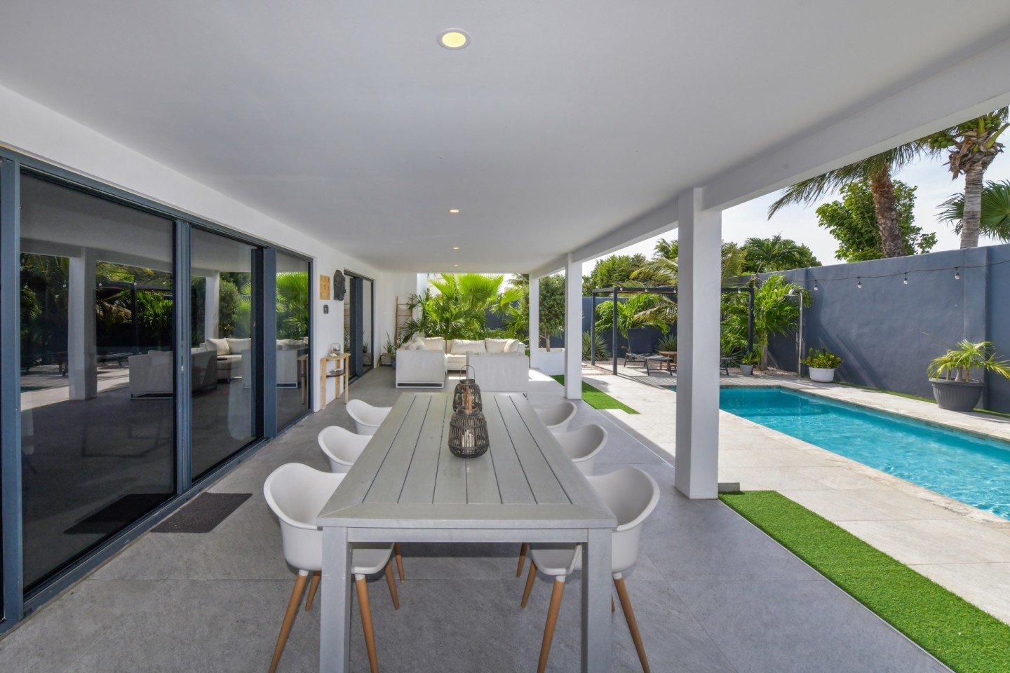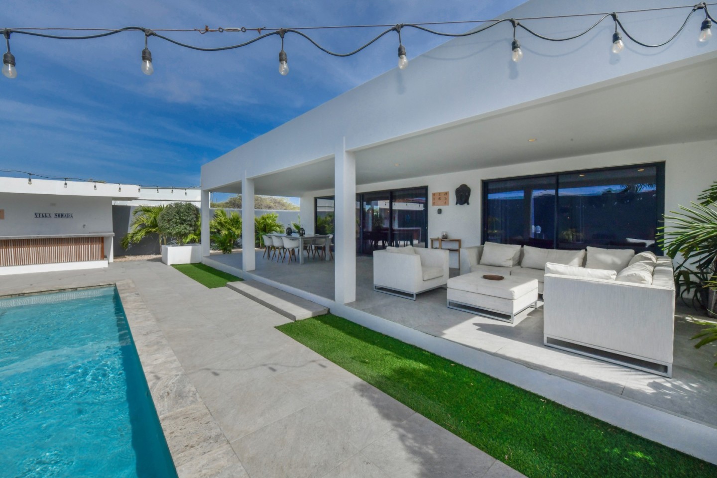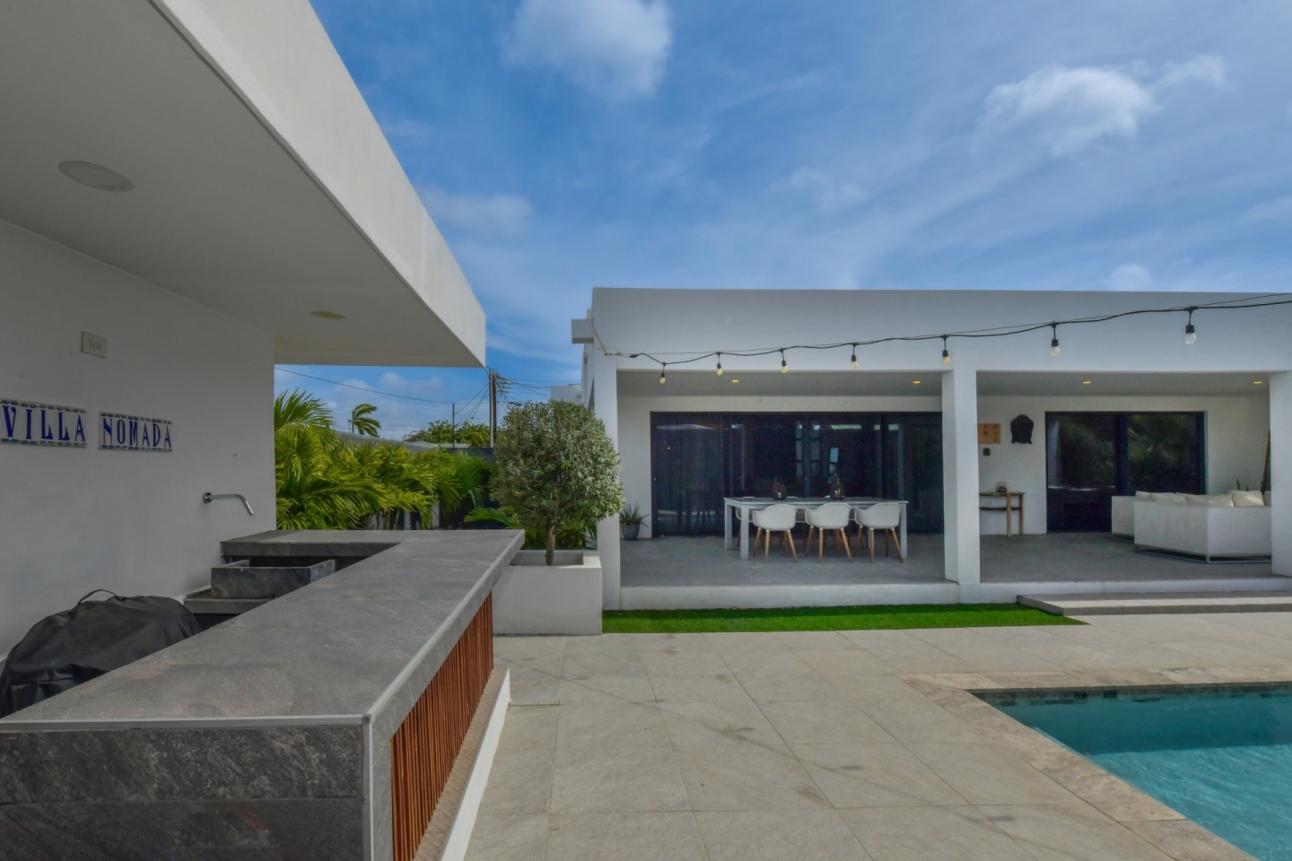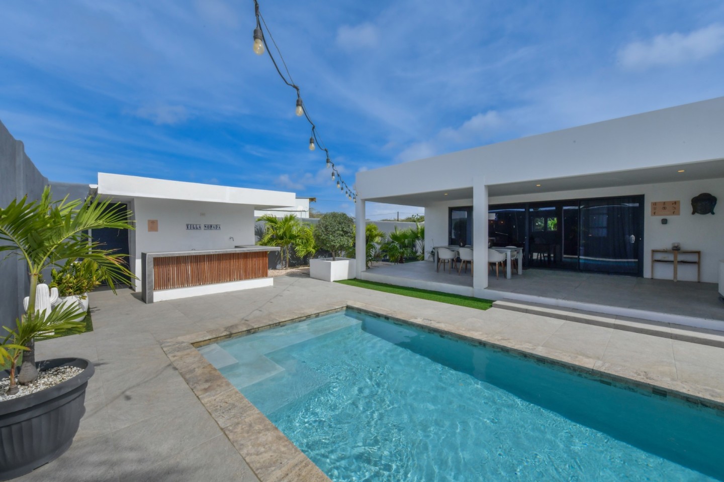 Upon entering the home, you will find an open-concept living, dining and fully equipped kitchen area, filled with natural light and warmth. Sliding doors open to the covered patio and lush garden, offering seamless indoor-outdoor living. A convenient hallway toilet is tucked away for guests and the laundry room is discreetly hidden behind a door for easy access. The master bedroom features a walk-in closet, an ensuite bathroom, and sliding doors that lead to the patio, providing views of the garden and pool for a peaceful retreat. This stylish residence includes three bedrooms and two and a half bathrooms, with a studio at the front of the property that can easily be converted into a fourth bedroom with an additional third bathroom, offering even more flexibility.