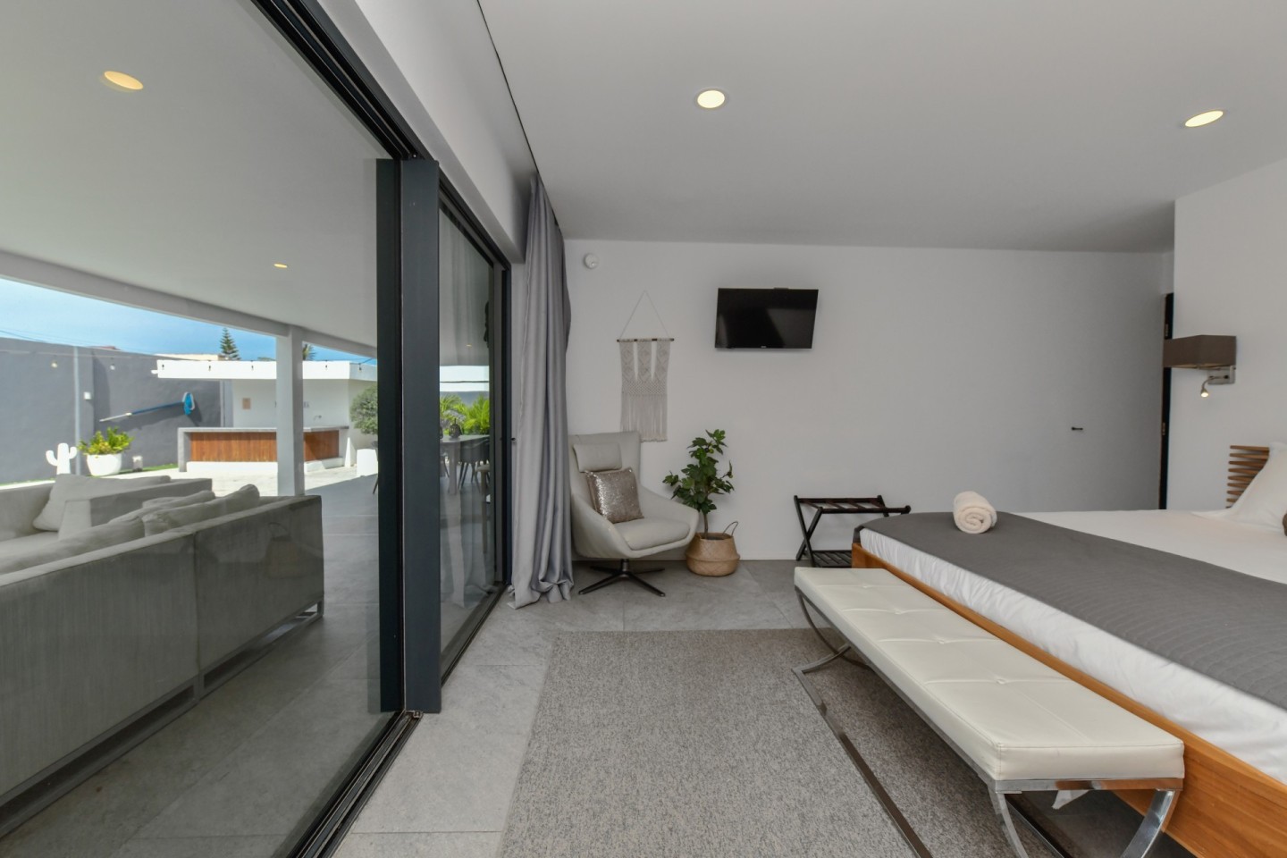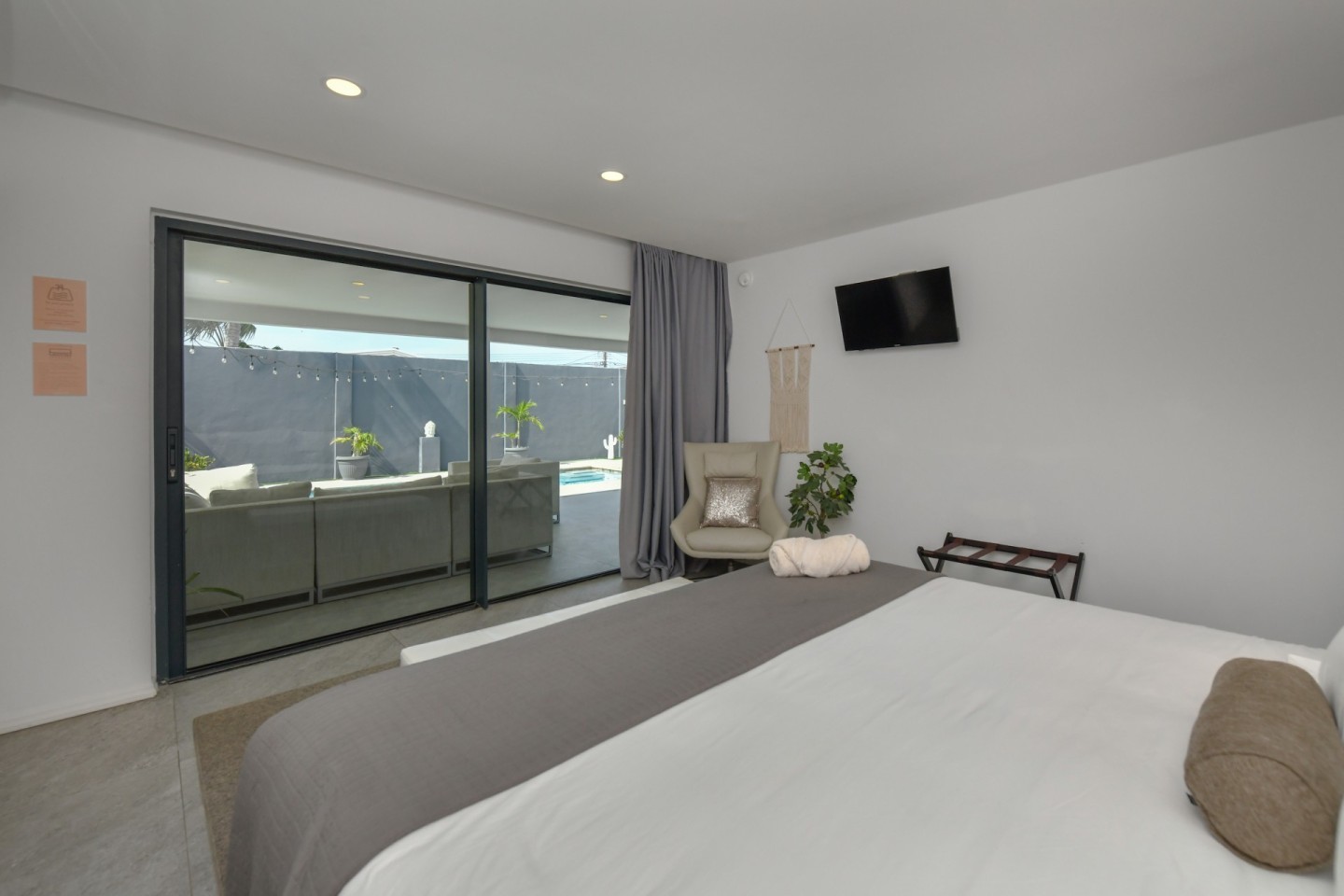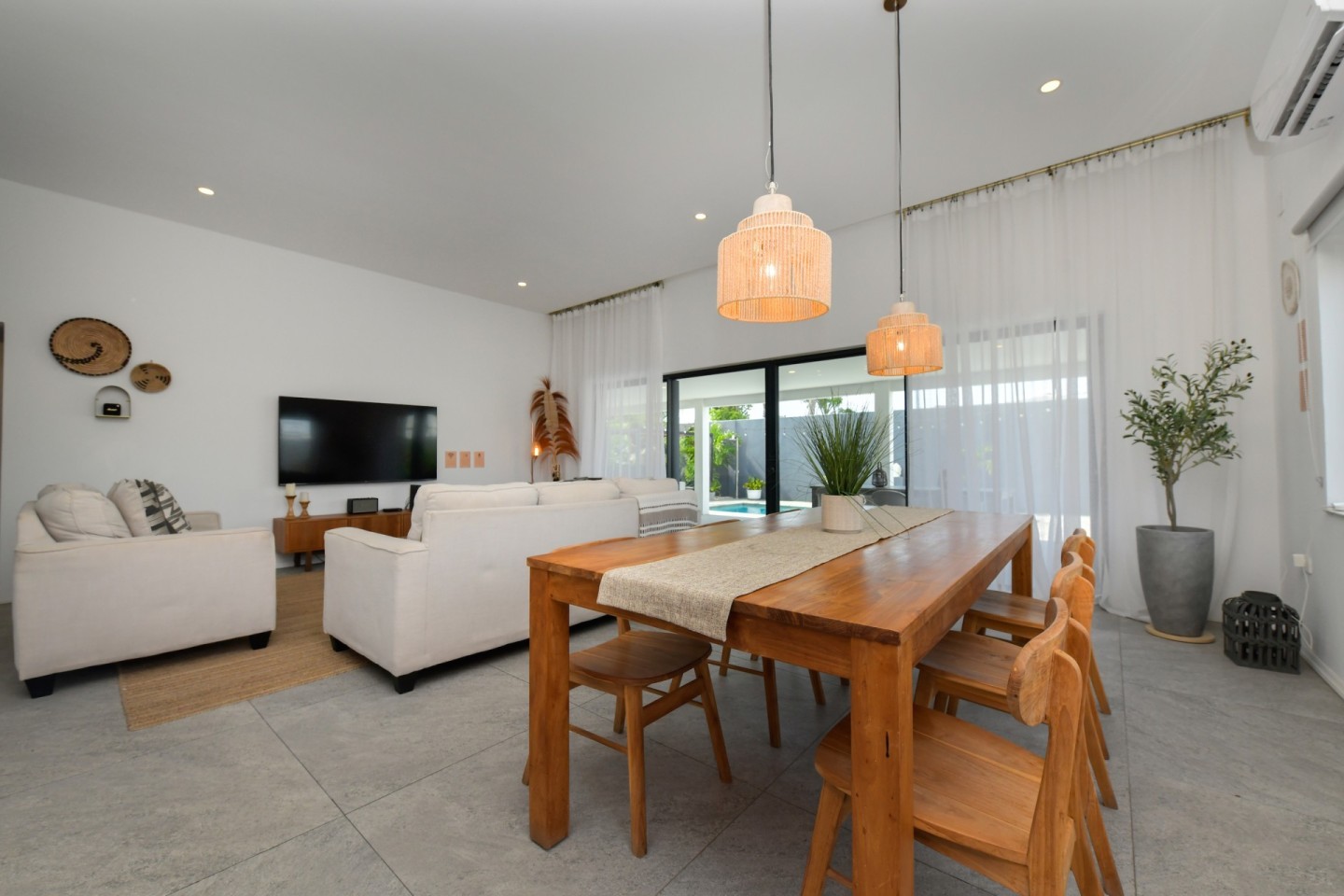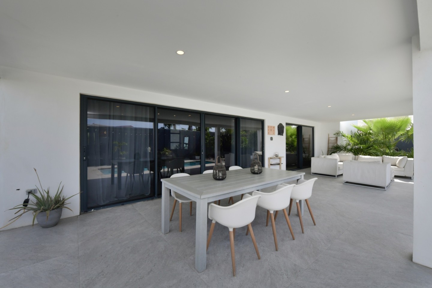 Upon entering the home, you will find an open-concept living, dining and fully equipped kitchen area, filled with natural light and warmth. Sliding doors open to the covered patio and lush garden, offering seamless indoor-outdoor living. A convenient hallway toilet is tucked away for guests and the laundry room is discreetly hidden behind a door for easy access. The master bedroom features a walk-in closet, an ensuite bathroom, and sliding doors that lead to the patio, providing views of the garden and pool for a peaceful retreat. This stylish residence includes three bedrooms and two and a half bathrooms, with a studio at the front of the property that can easily be converted into a fourth bedroom with an additional third bathroom, offering even more flexibility.