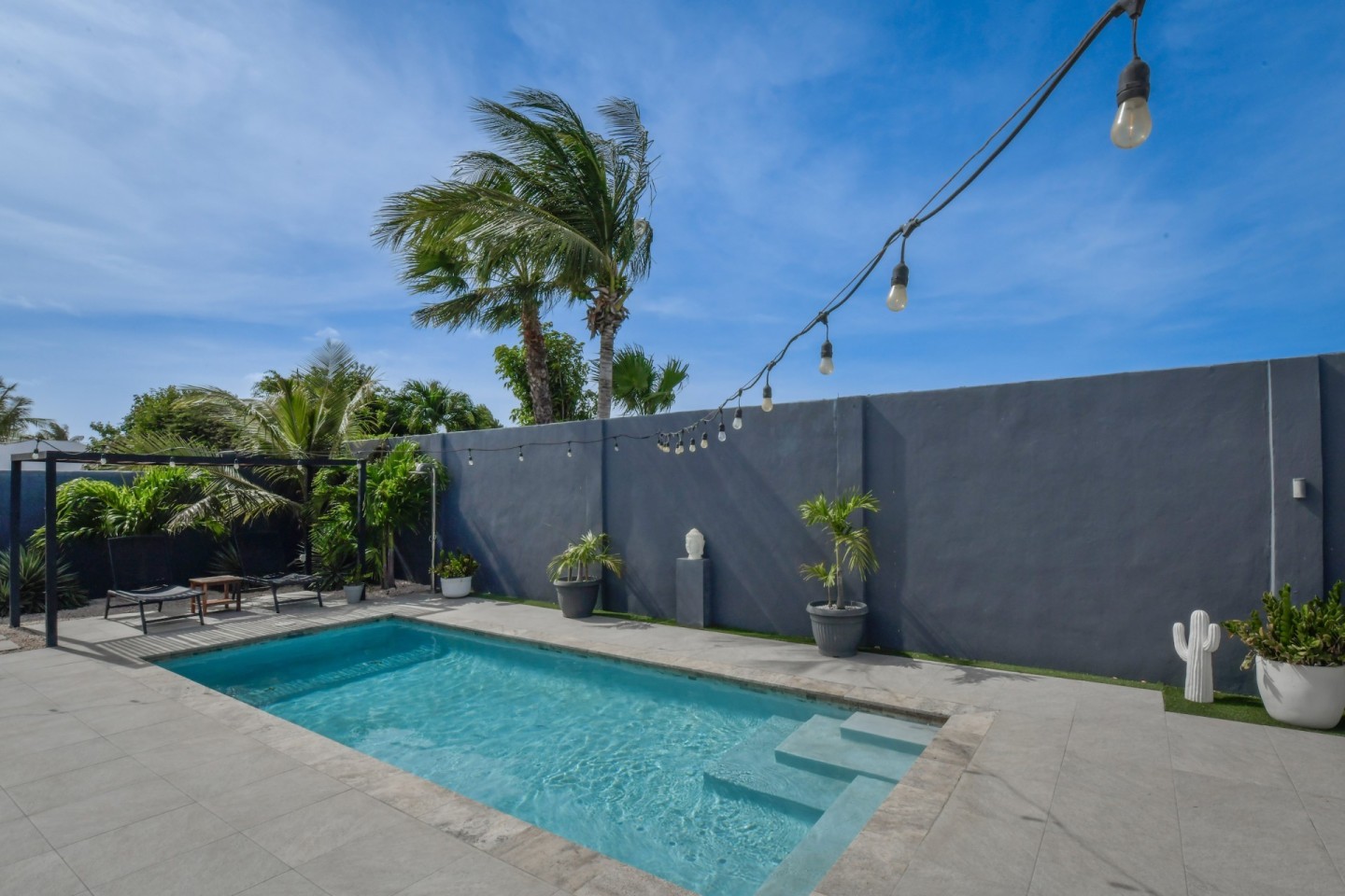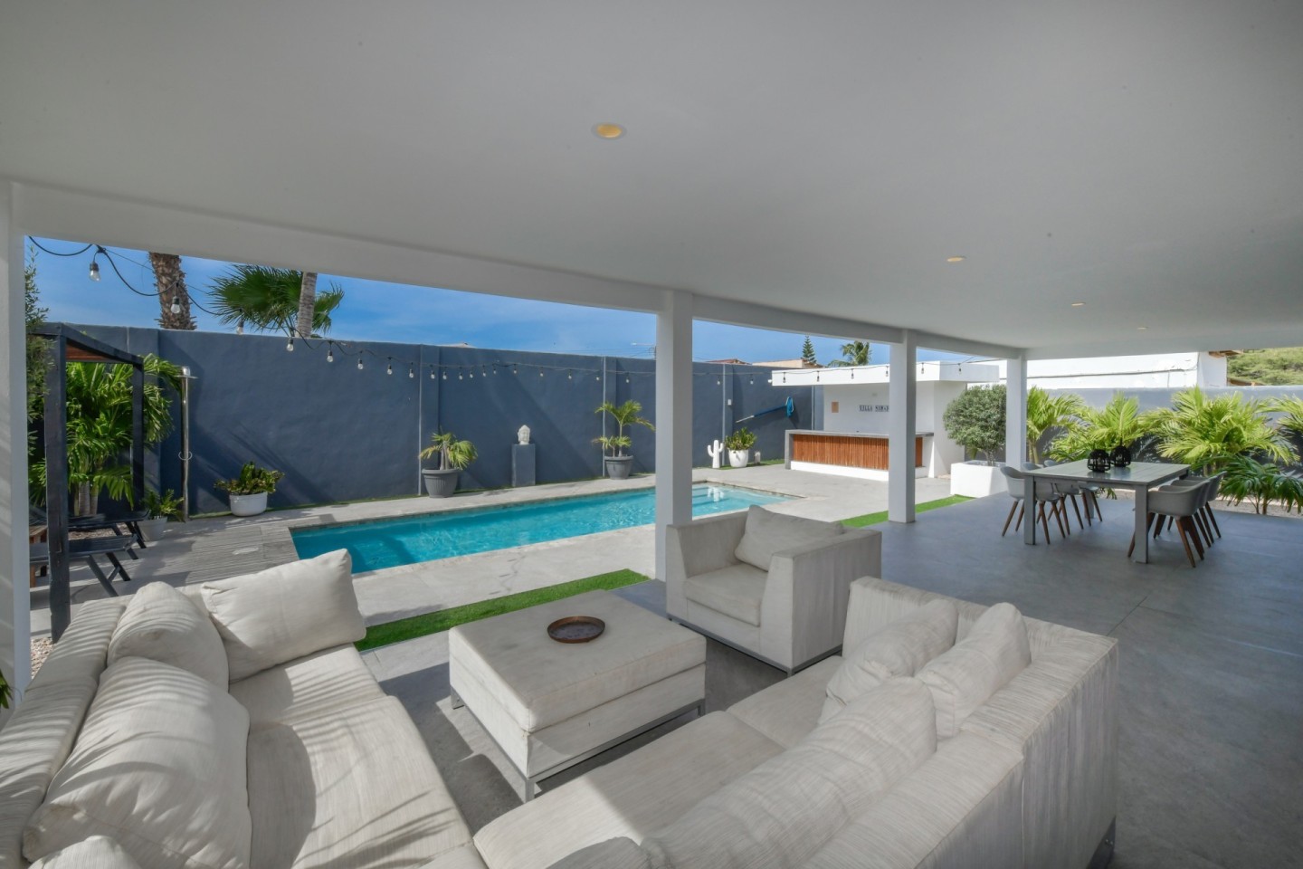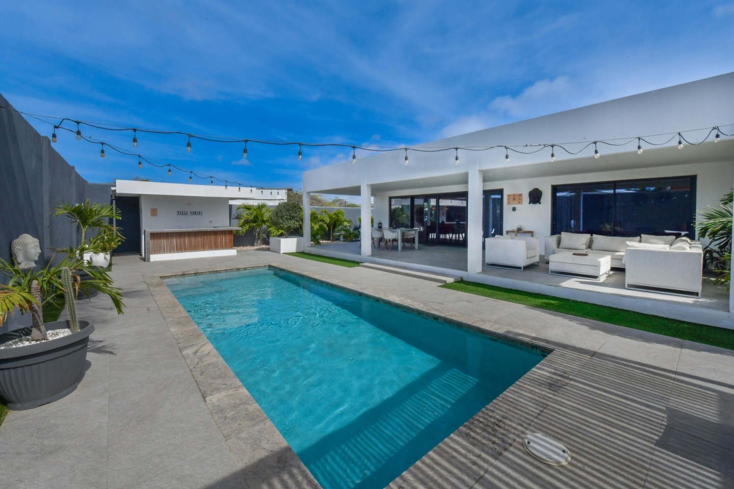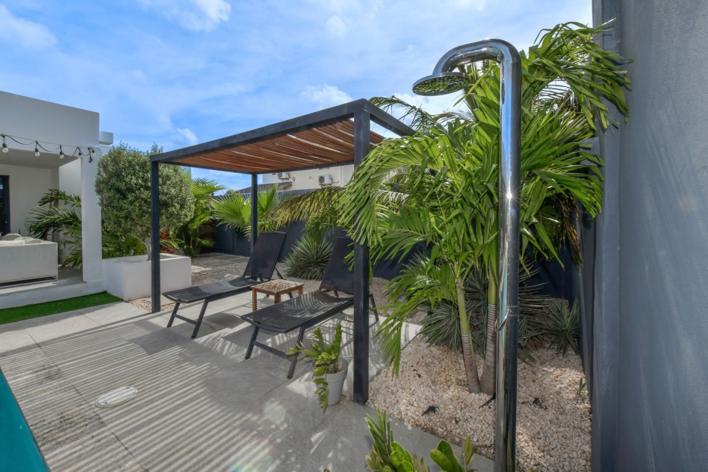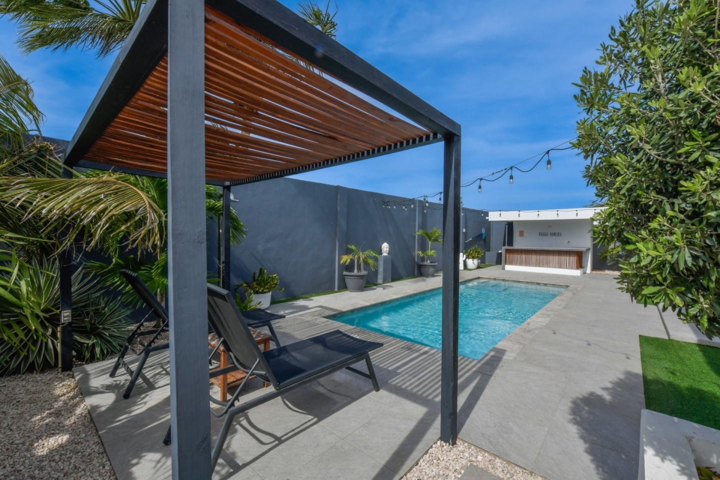 The outdoor space is designed for relaxation and entertainment, featuring a spacious covered patio, swimming pool, a pergola and a bar area with storage room. A separate outdoor shower and toilet provide added convenience. The beautifully landscaped tropical garden is filled with palm trees and plants, offering a serene environment.