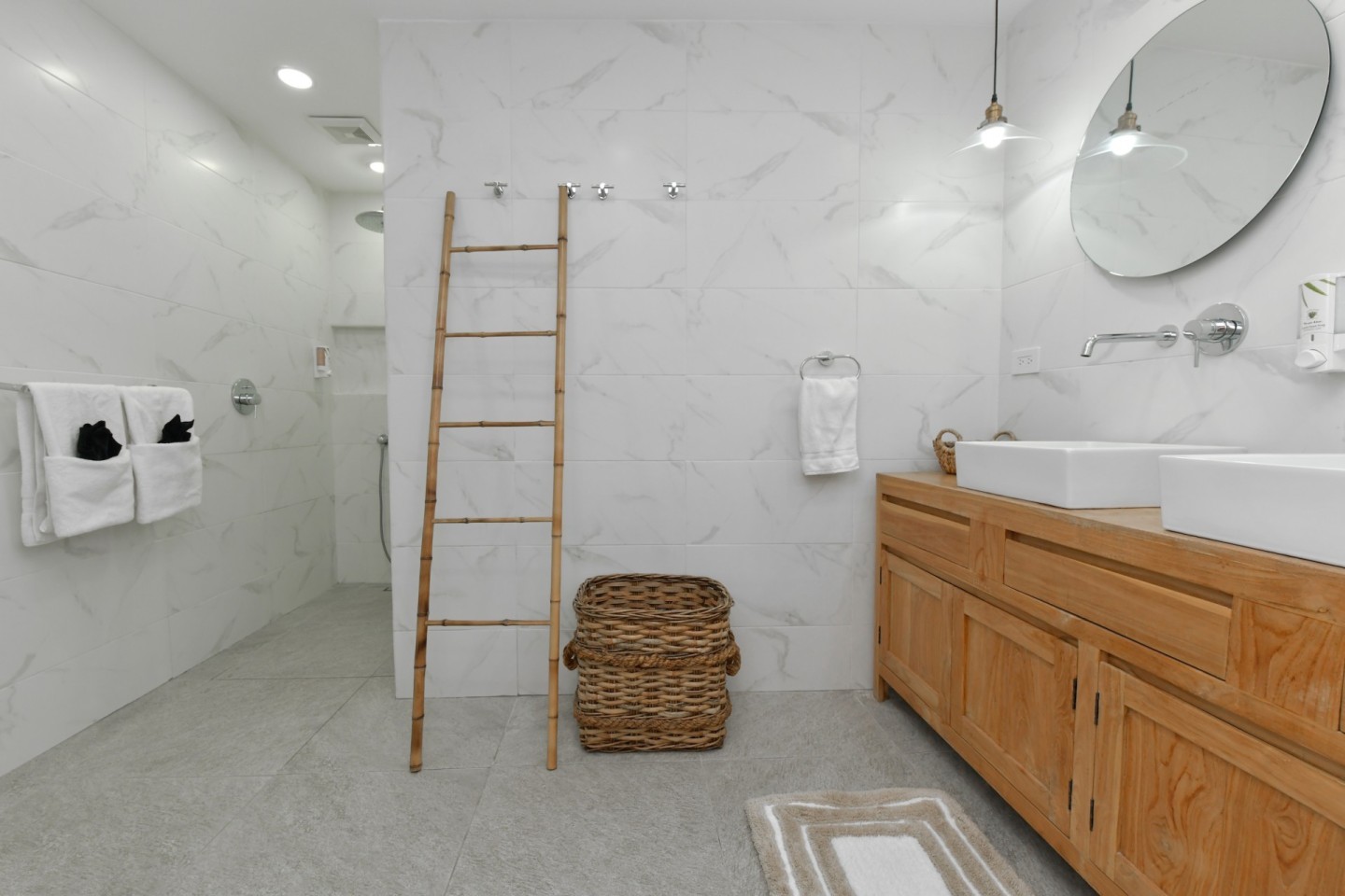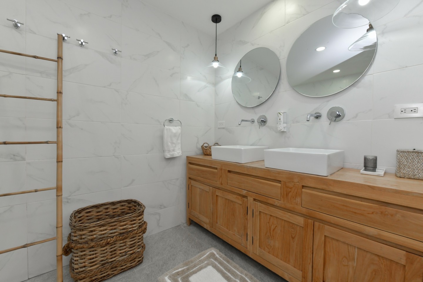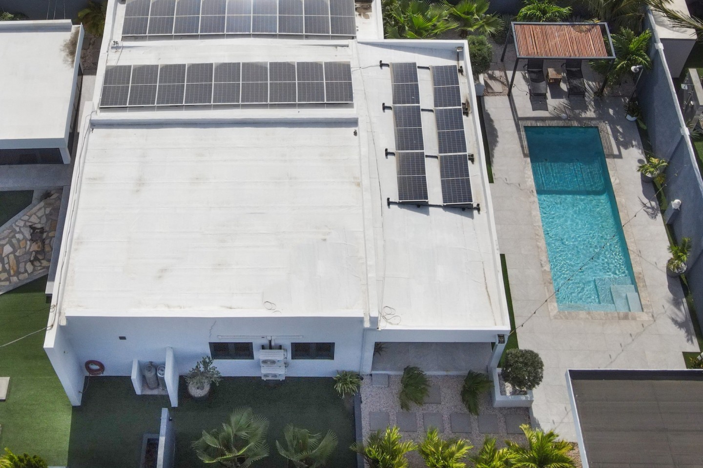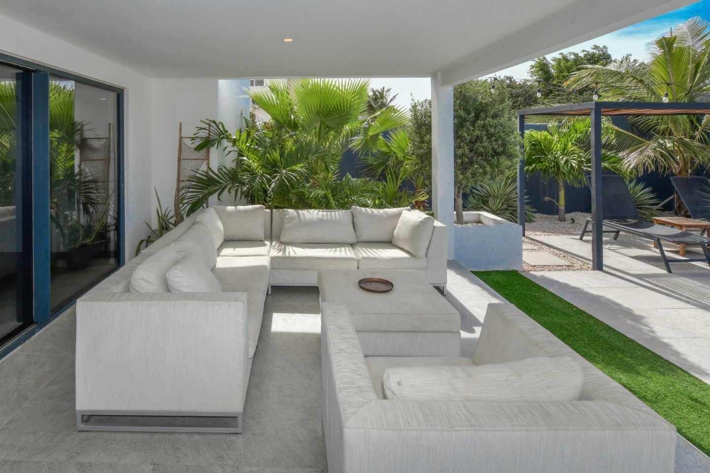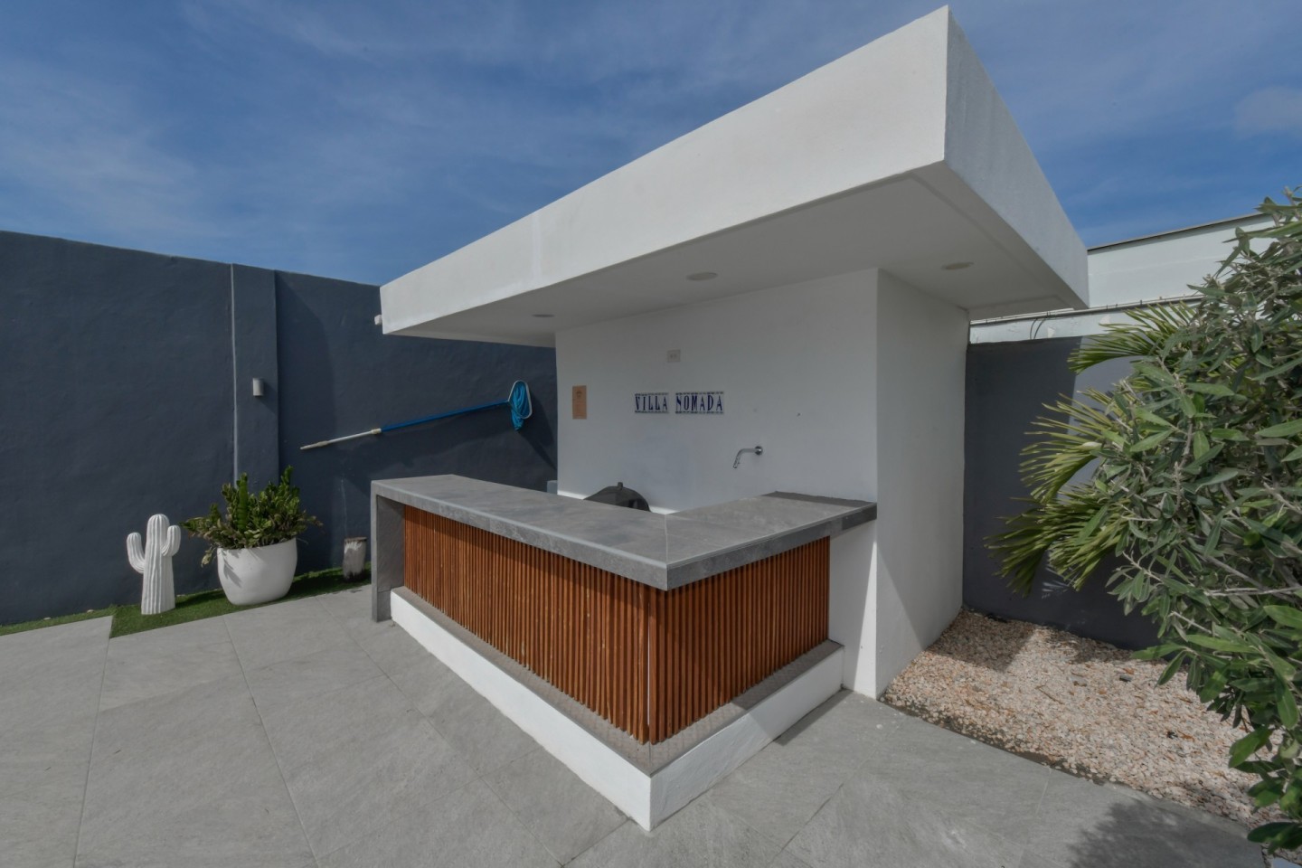 The outdoor space is designed for relaxation and entertainment, featuring a spacious covered patio, swimming pool, a pergola and a bar area with storage room. A separate outdoor shower and toilet provide added convenience. The beautifully landscaped tropical garden is filled with palm trees and plants, offering a serene environment.